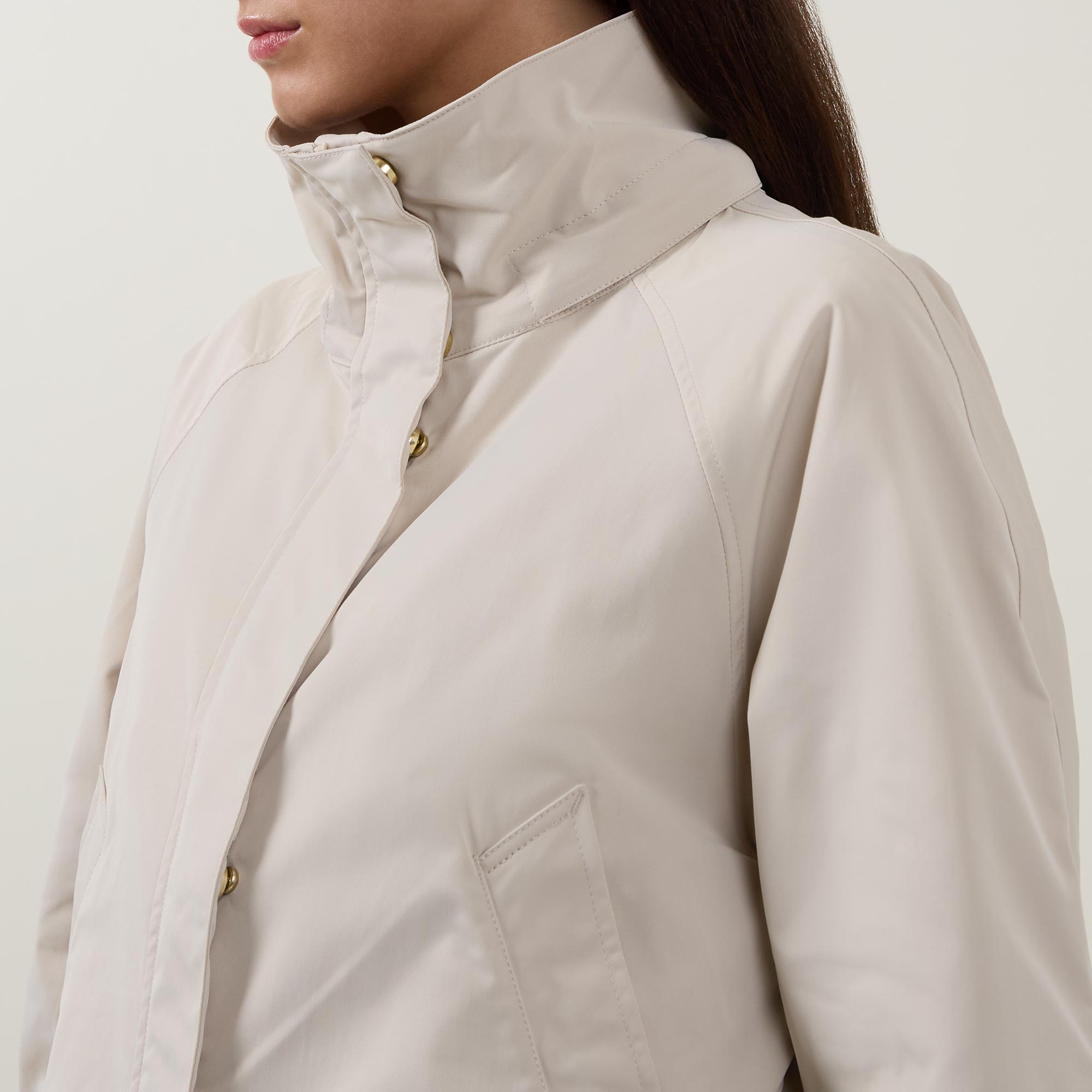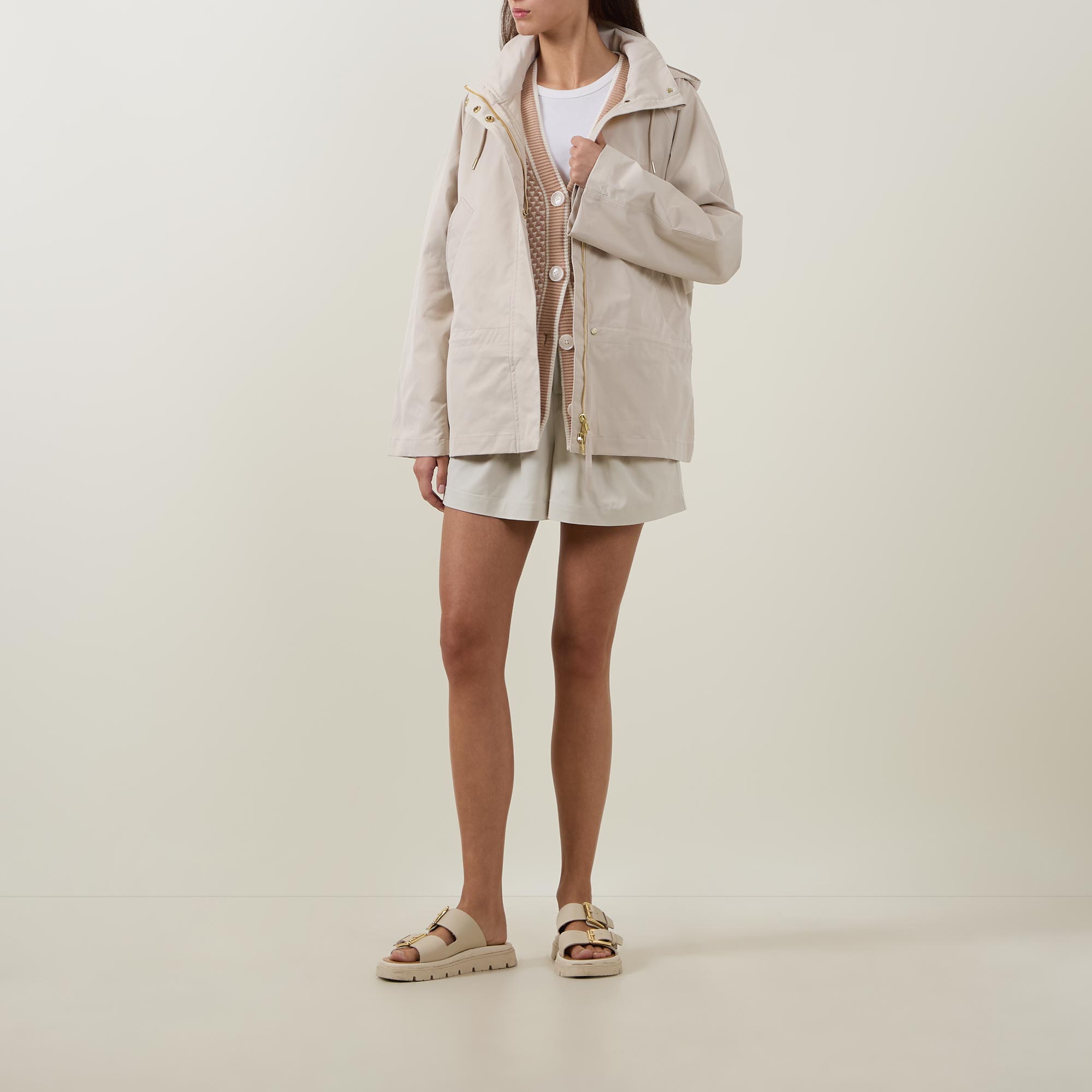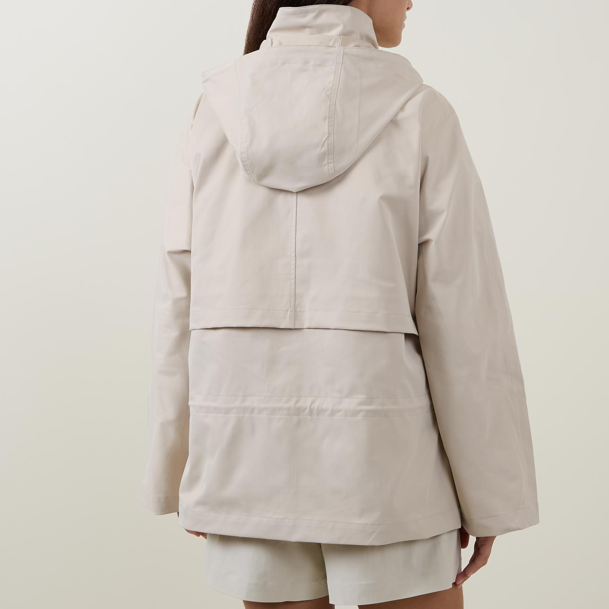 - Detachable snap-off hood with drawstring adjustable fit, concealed snap button and zip fastening, side entry pockets, storm flap, long sleeves, low-waist cinch detail, toggle fastening