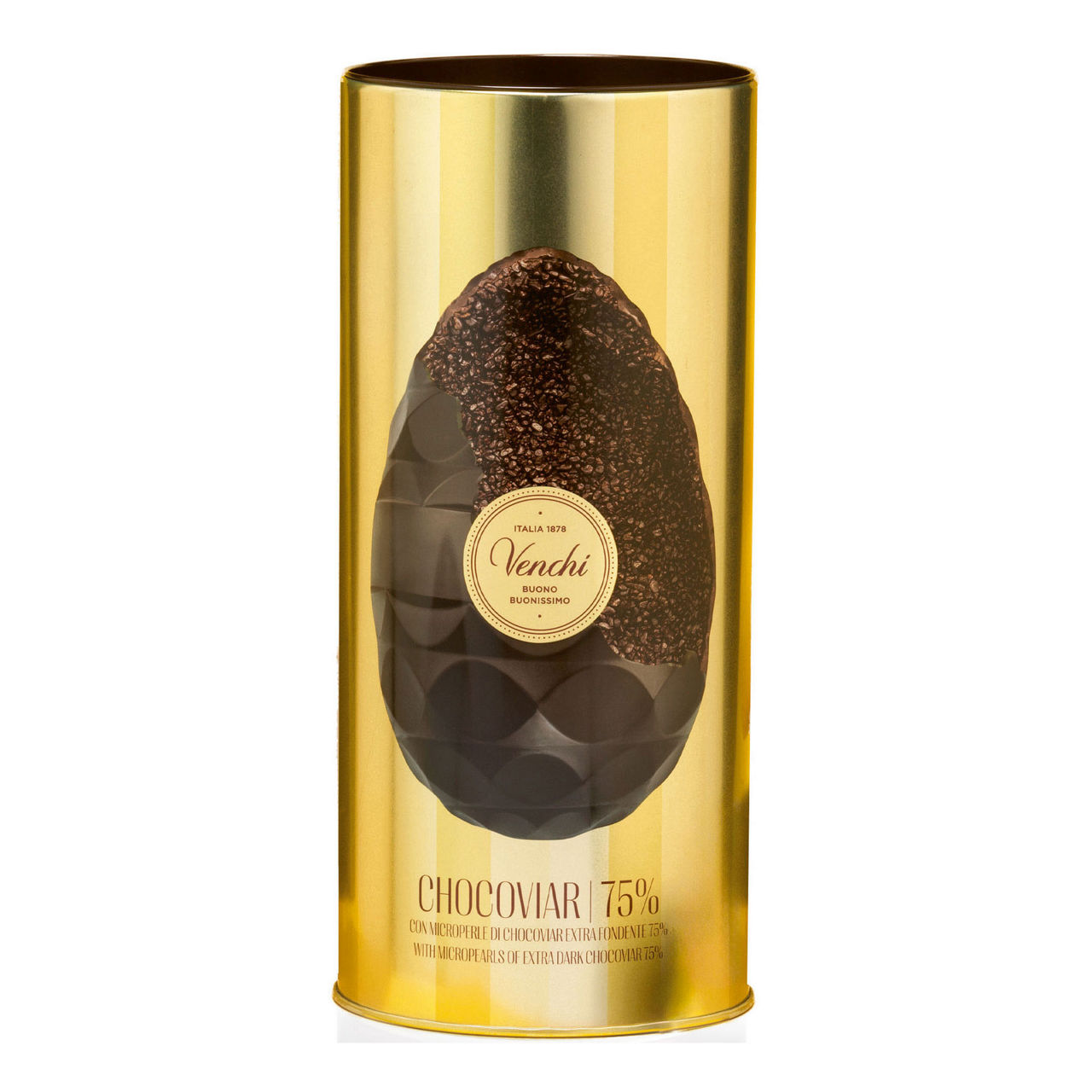 - Presented in a metal tin, 75% extra dark chocolate egg, trendy micropearls inner coating