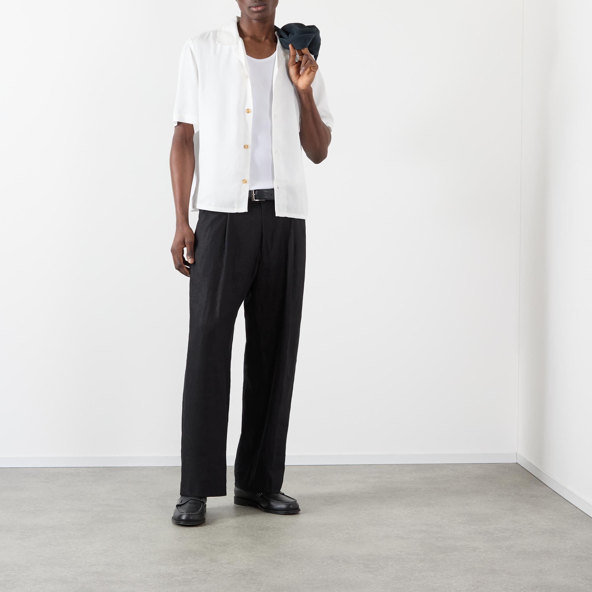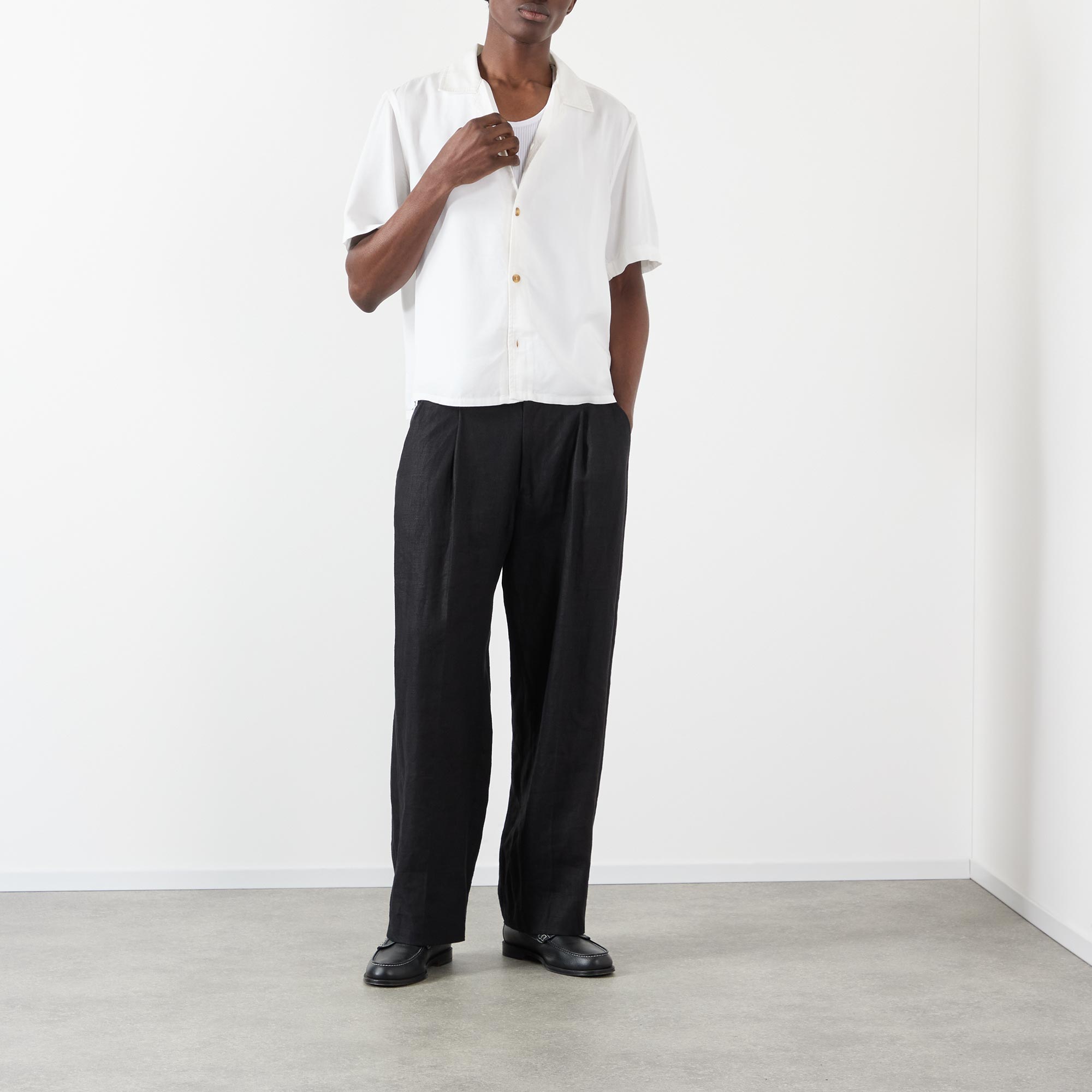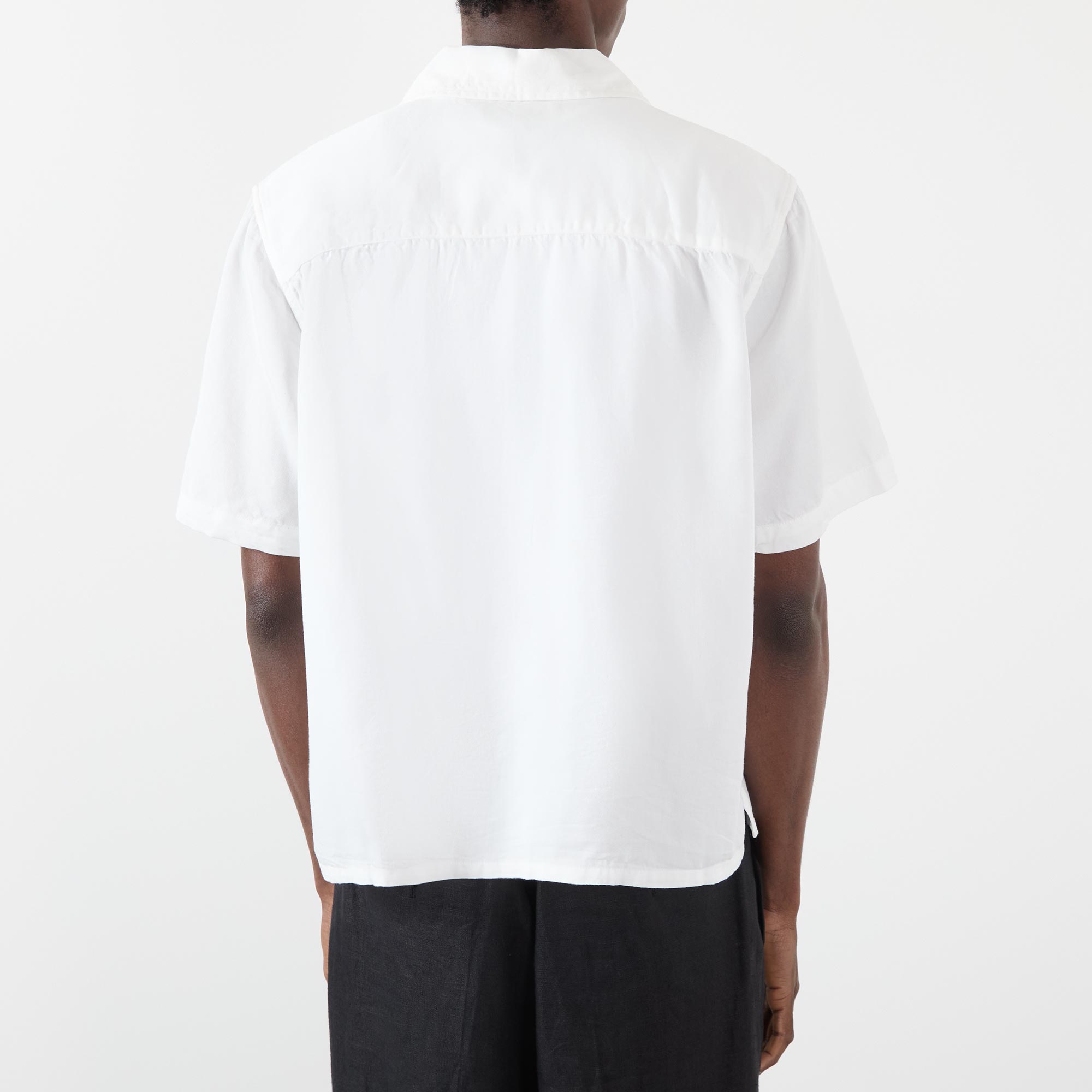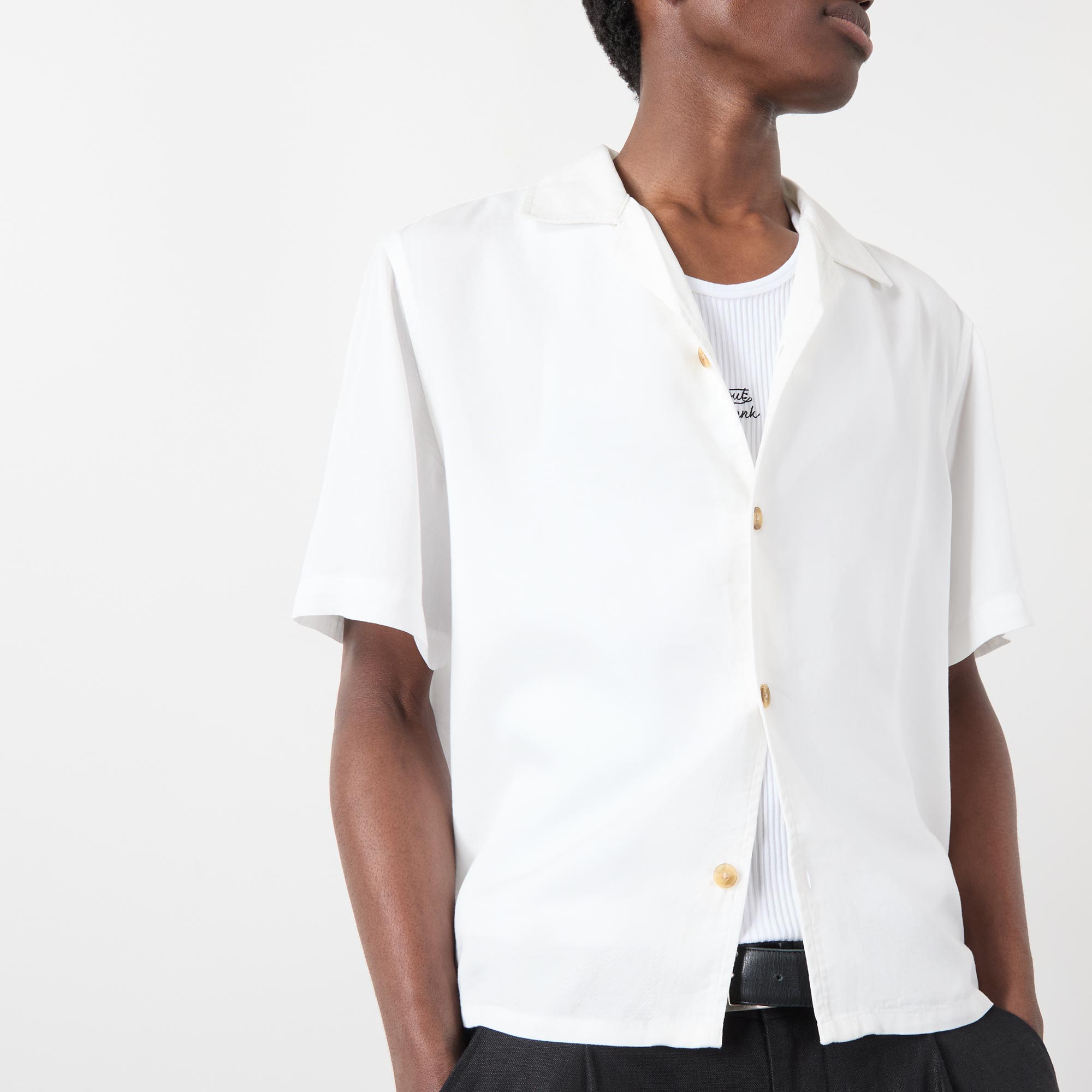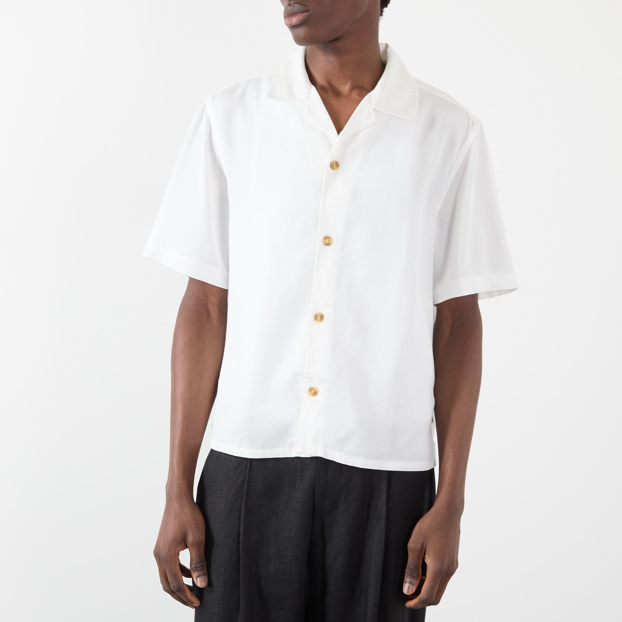 - Spread collar, short sleeves, straight hemline, button fastening, woven twill fabric