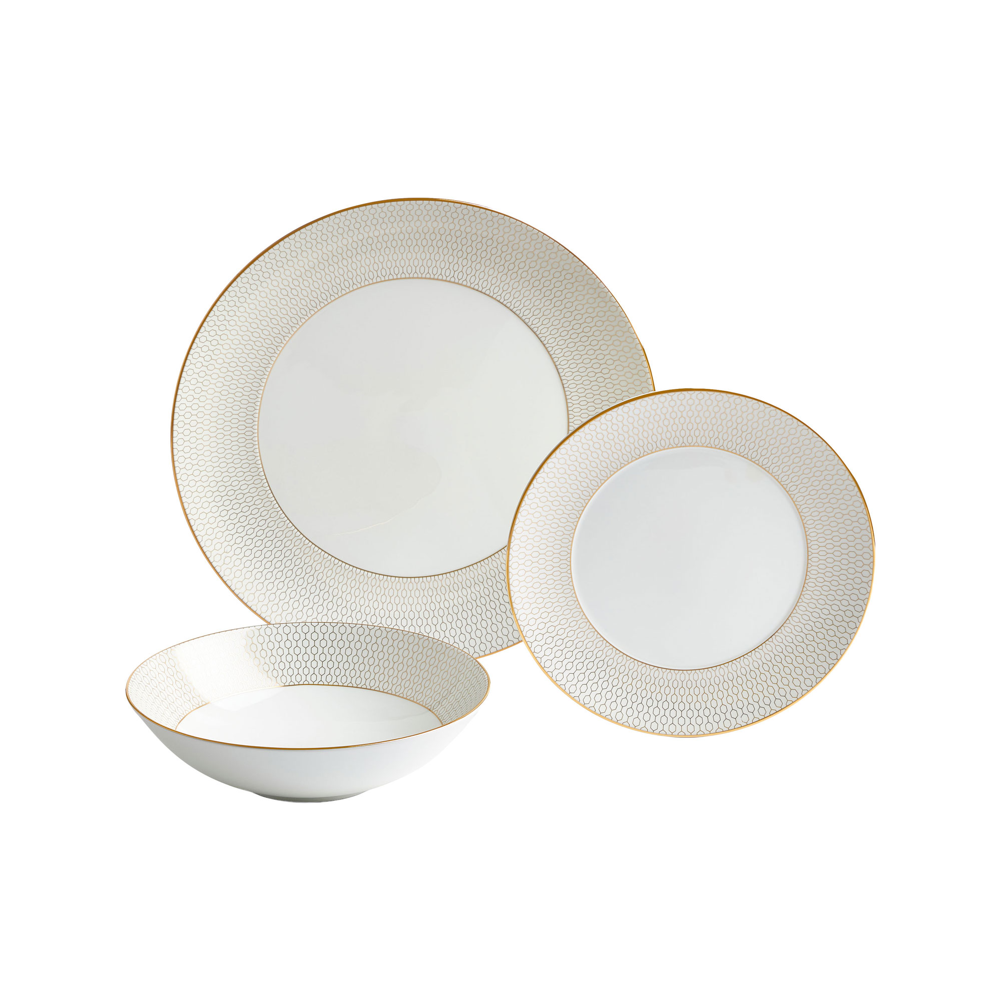 Update your tableware with this 12-piece dinnerware set from the Gio Gold collection by Wedgewood. The set is presented in a branded box and includes four dinner plates, four side plates and four bowls, all finished with a delicate gold-tone pattern.
