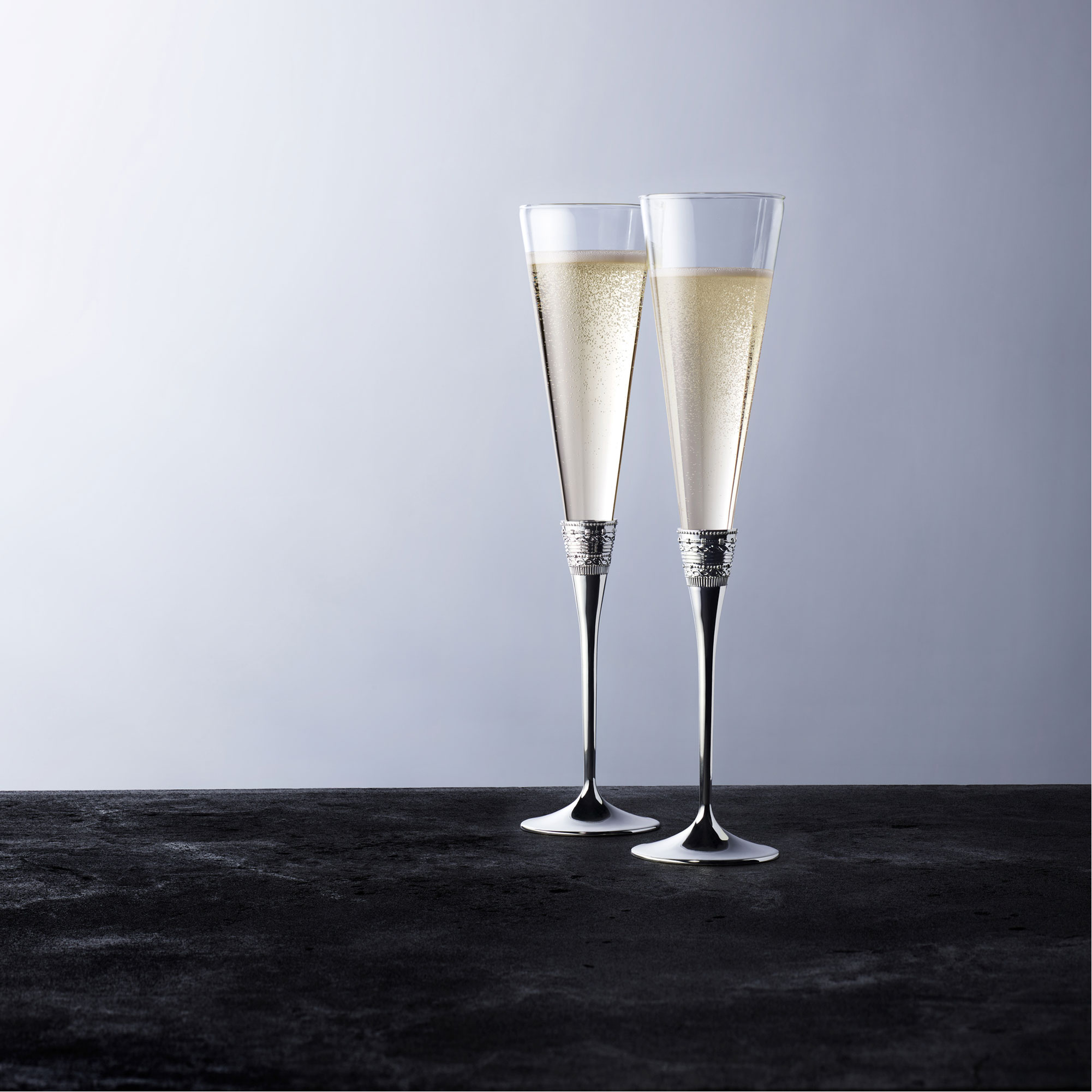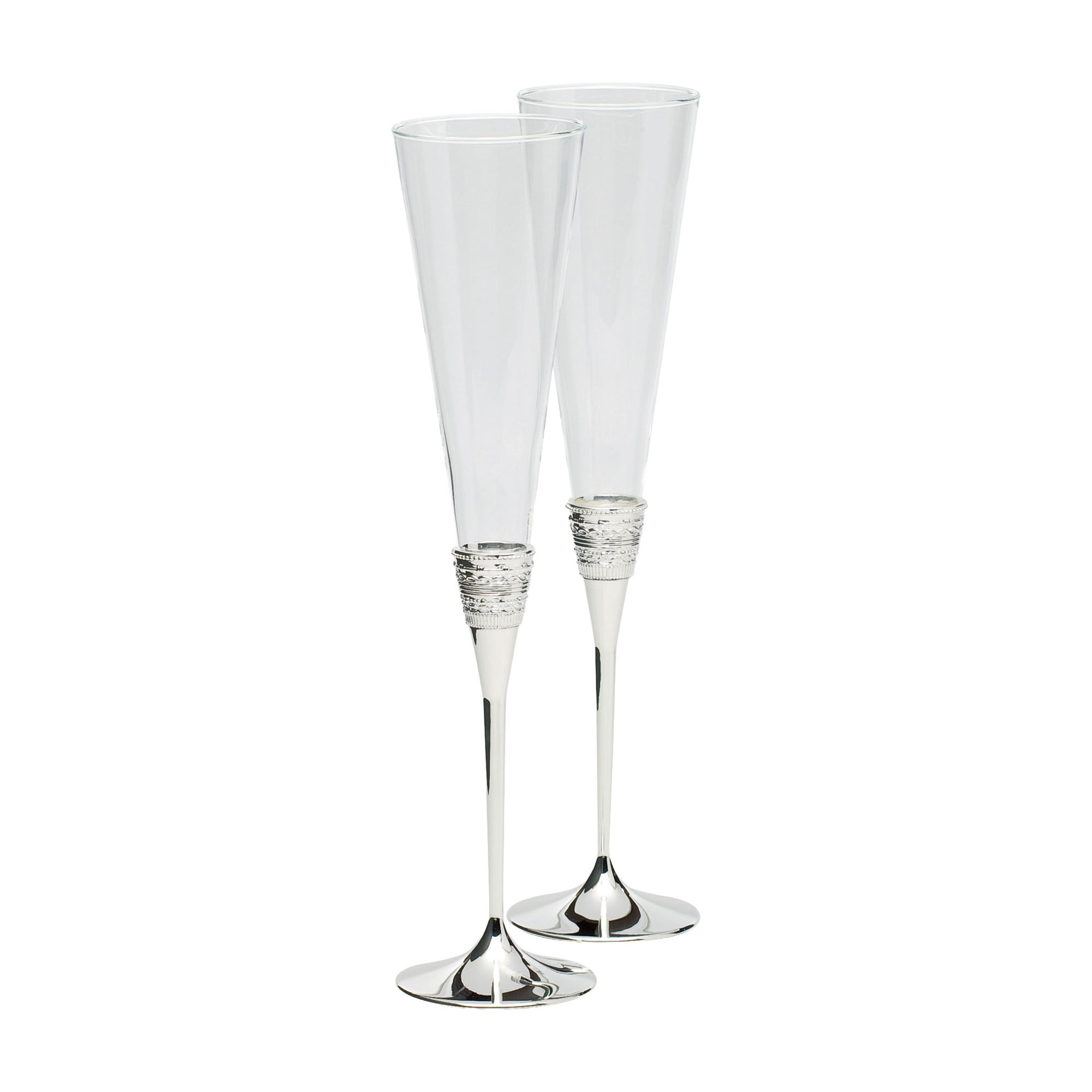 • Two glasses, flute style, silver-tone base, designed by Vera Wang