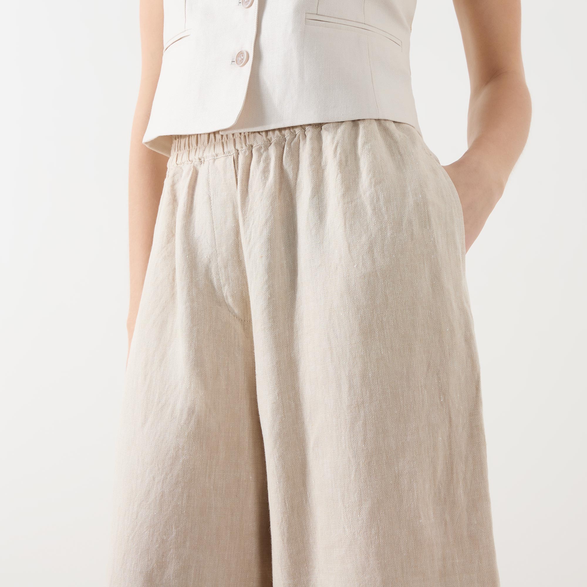 - Elasticated waistband, faux fly, side entry pockets, wide-cut leg