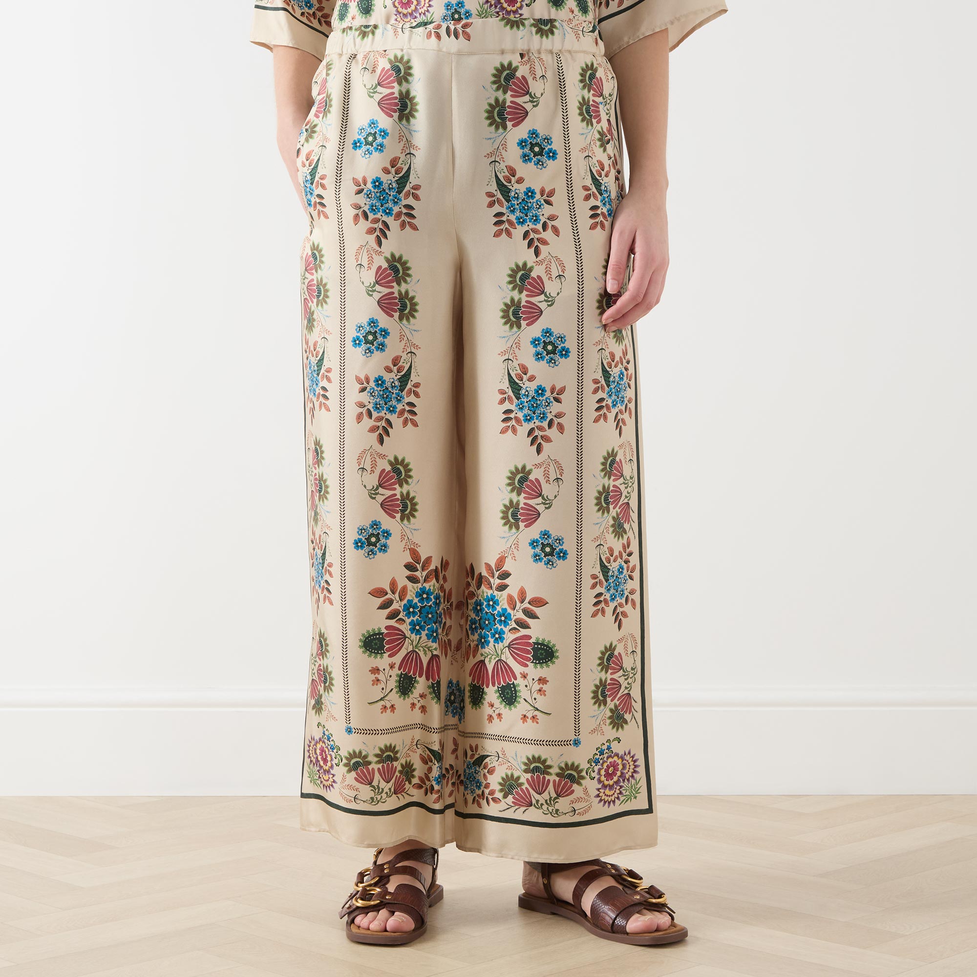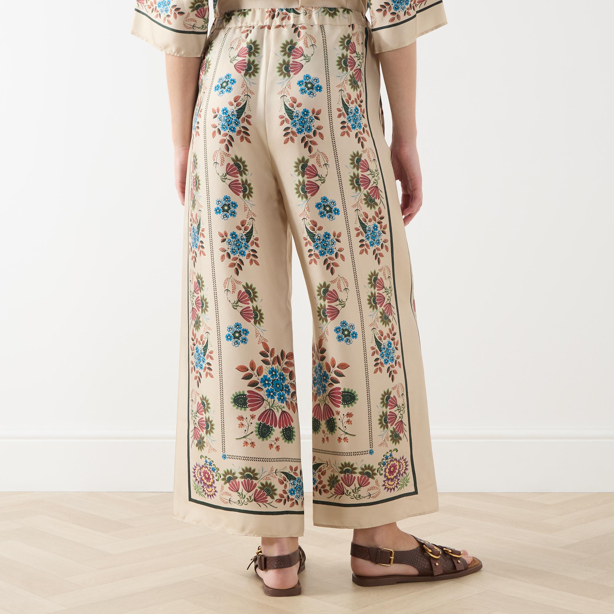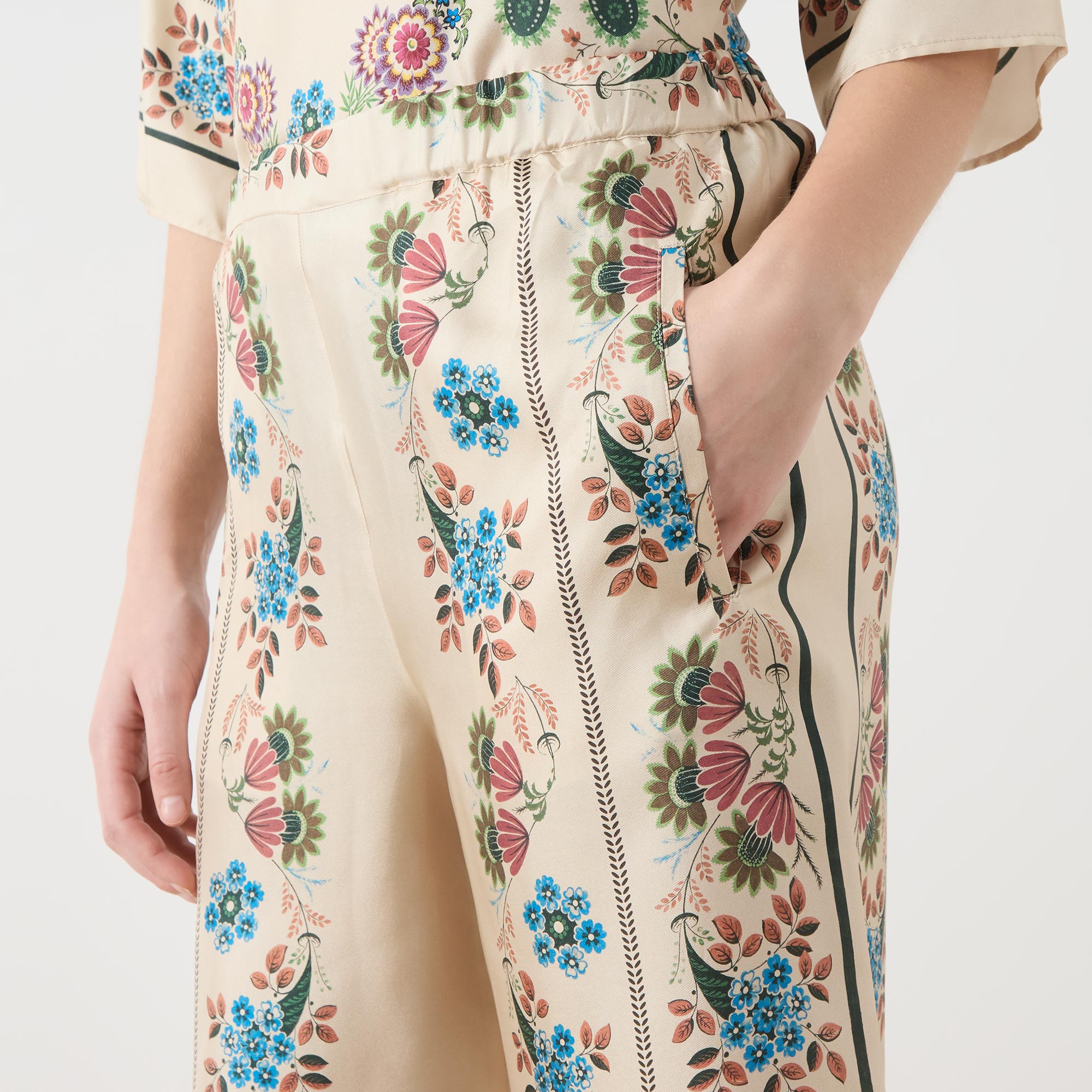 - Elasticated waistband, side entry pockets, wide-cut leg, smooth silk fabric, floral pattern