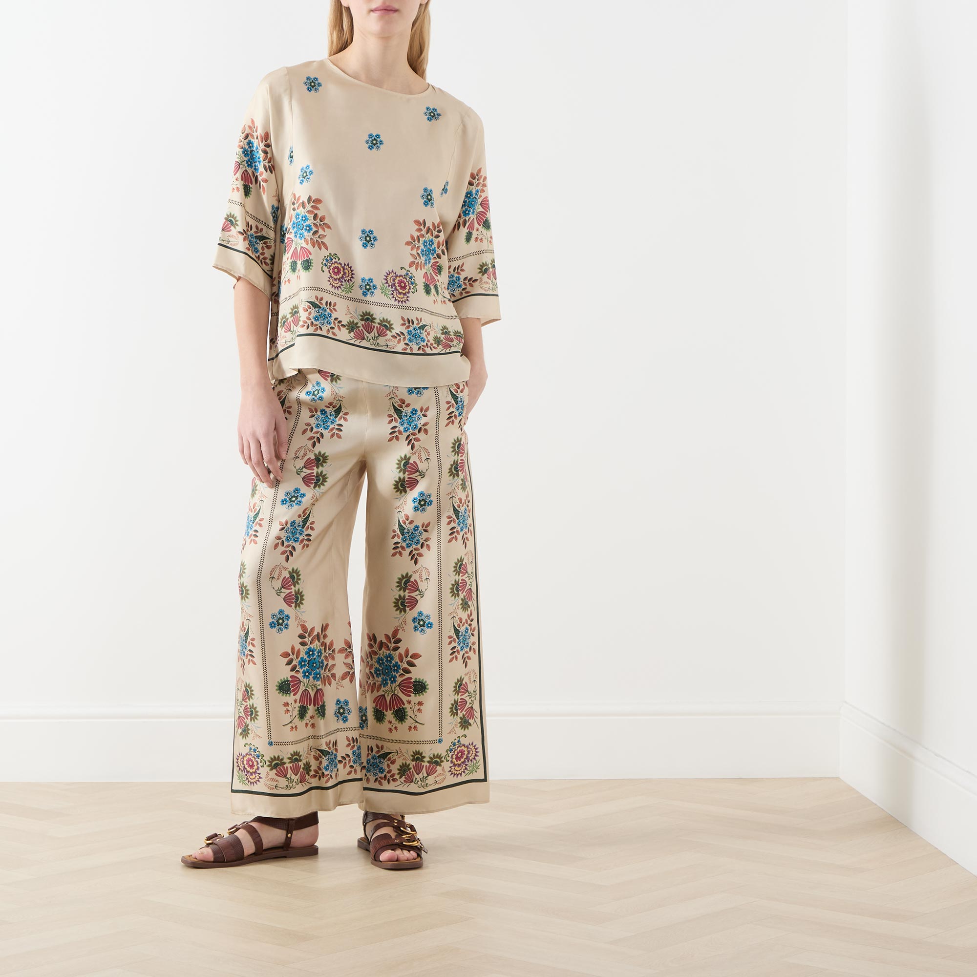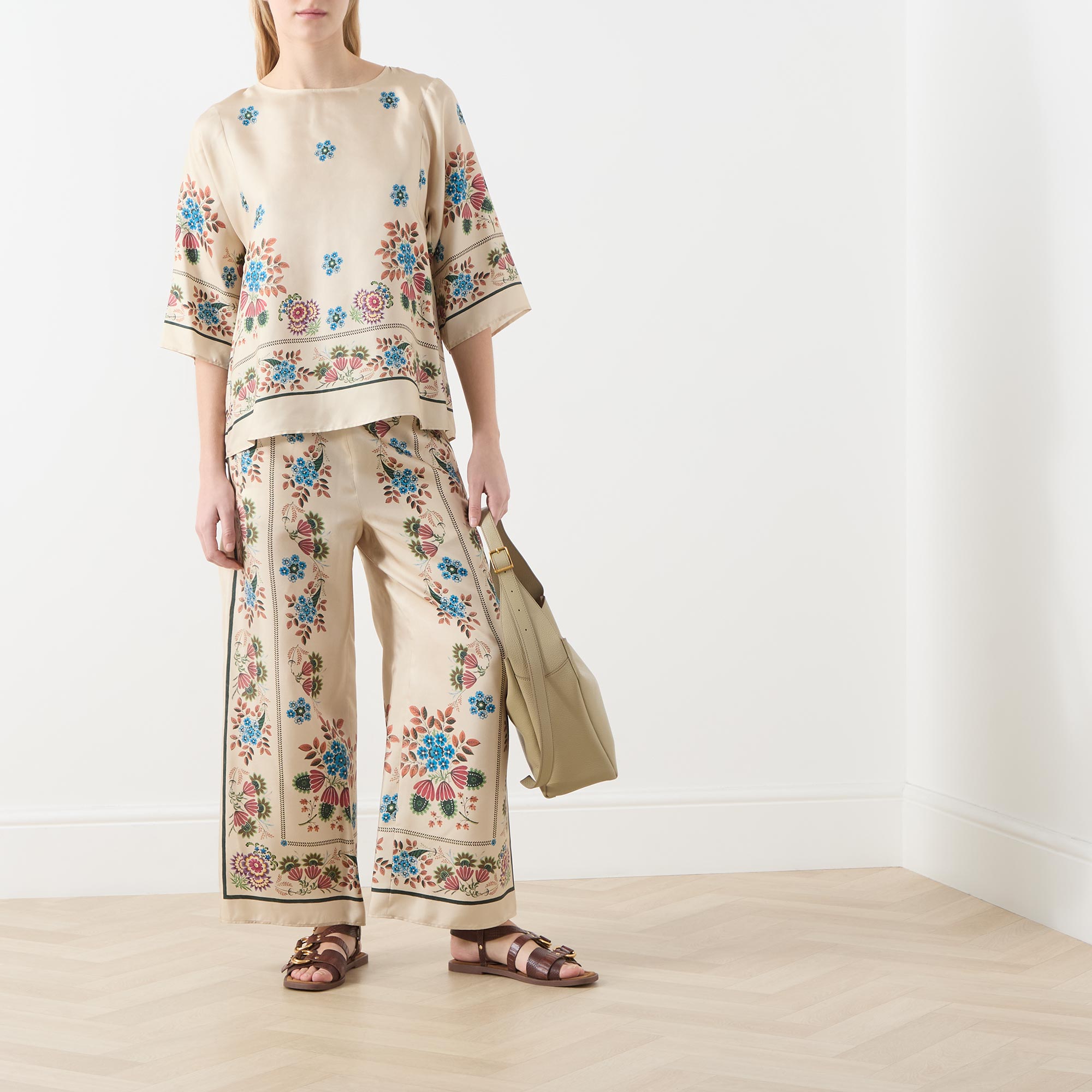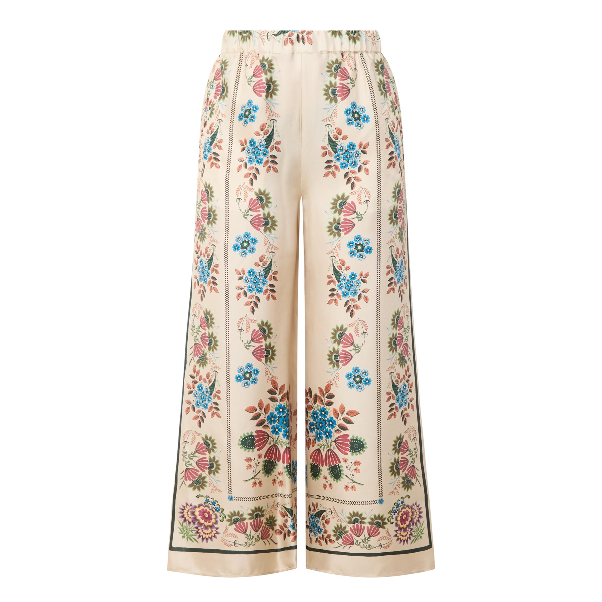 - Elasticated waistband, side entry pockets, wide-cut leg, smooth silk fabric, floral pattern