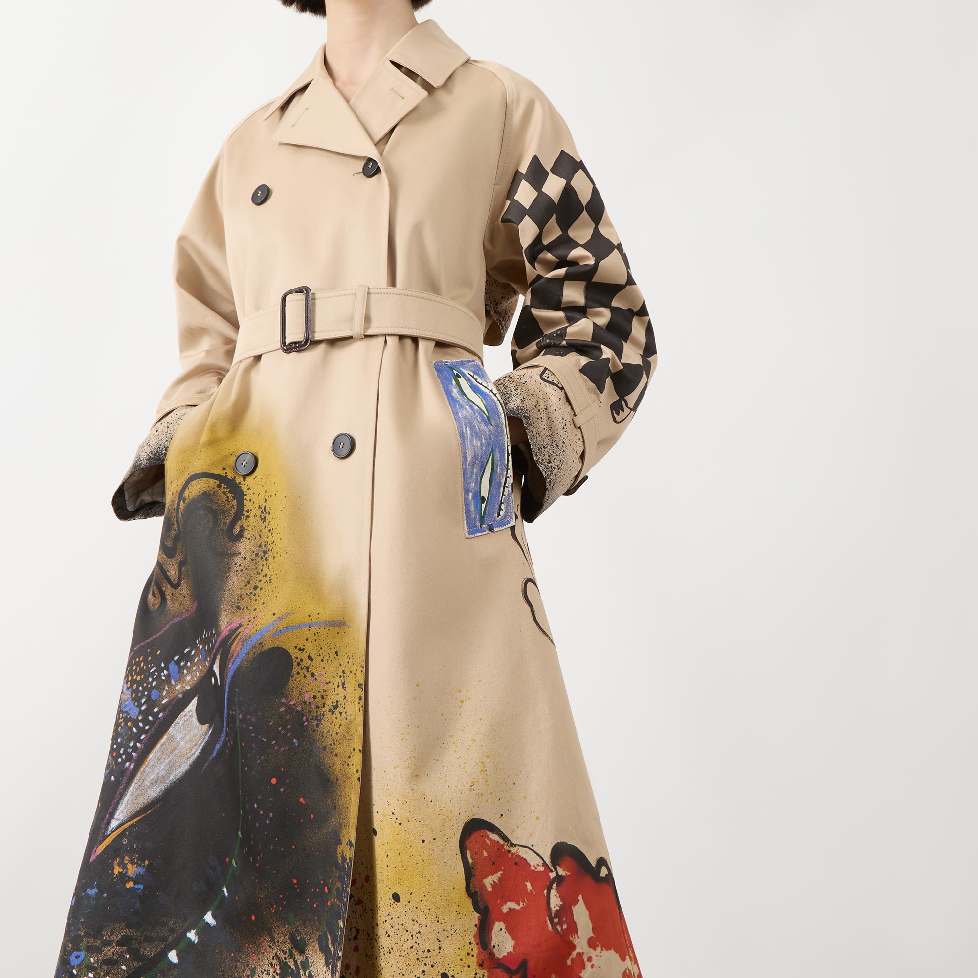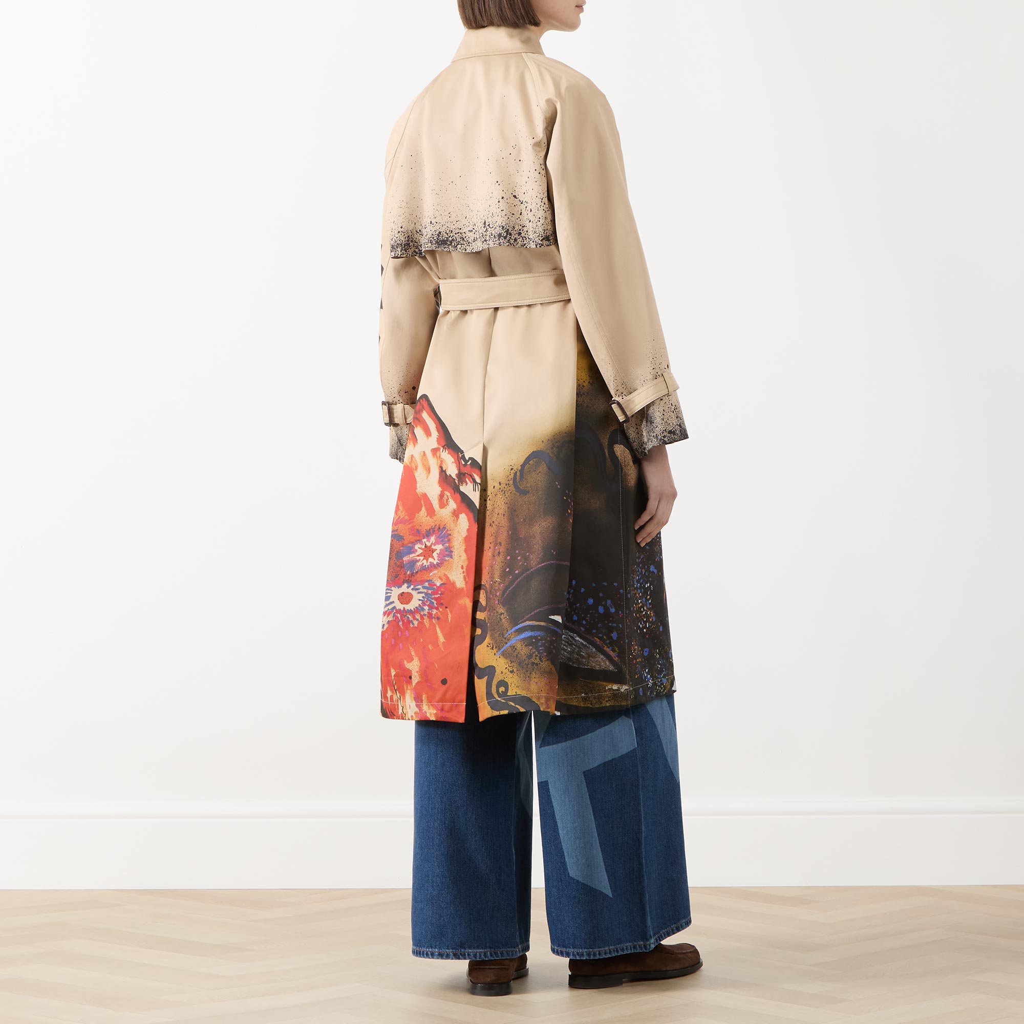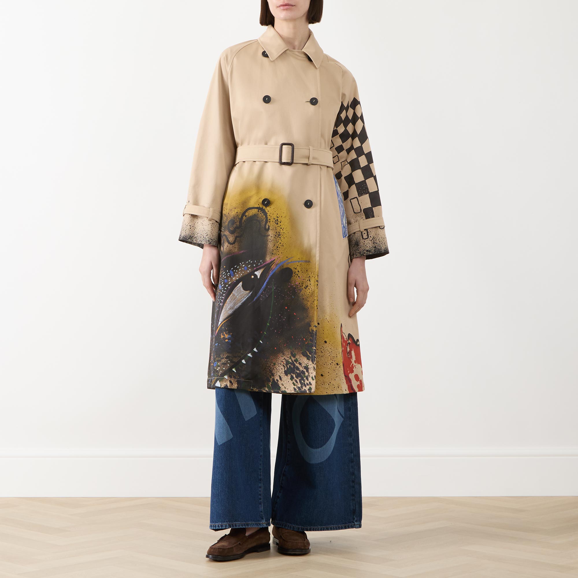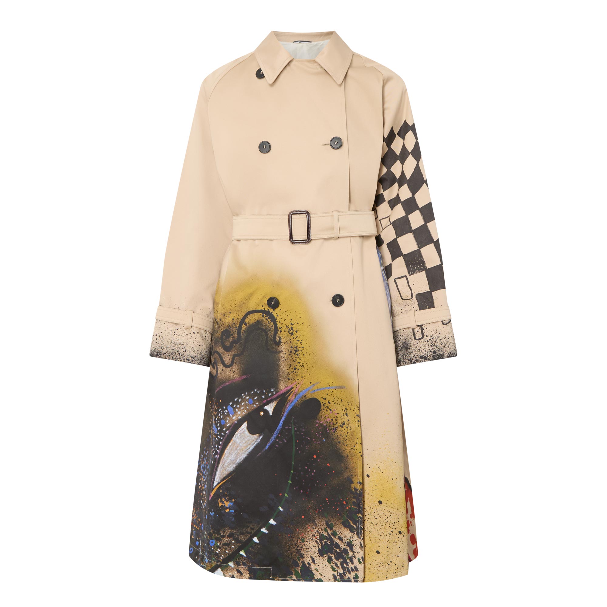 - Collared neckline, double-breasted, button fastening, adjustable belt at waist, side entry pockets, storm guard to the back, vented, adjustable cuffs, printed, partially lined