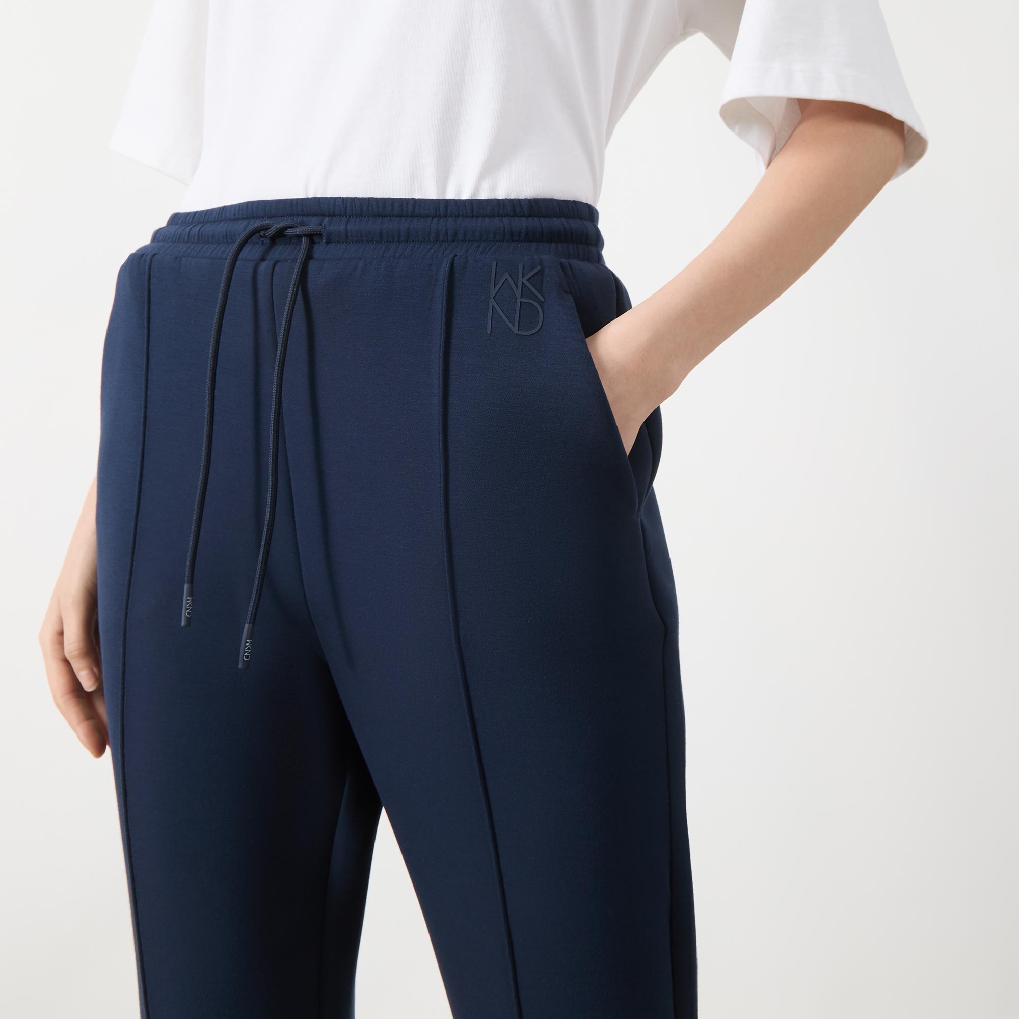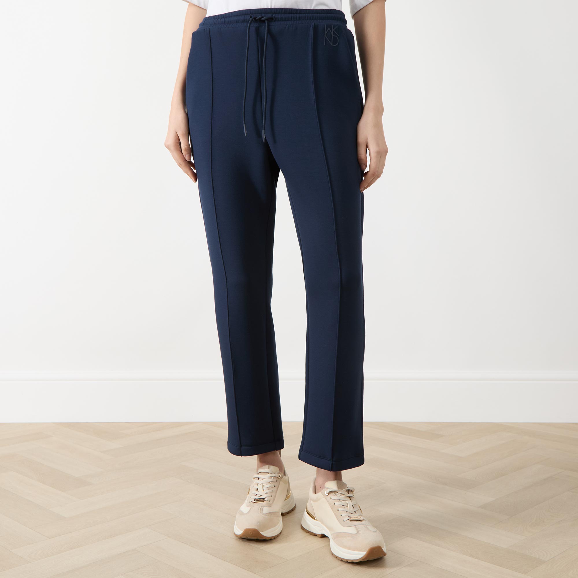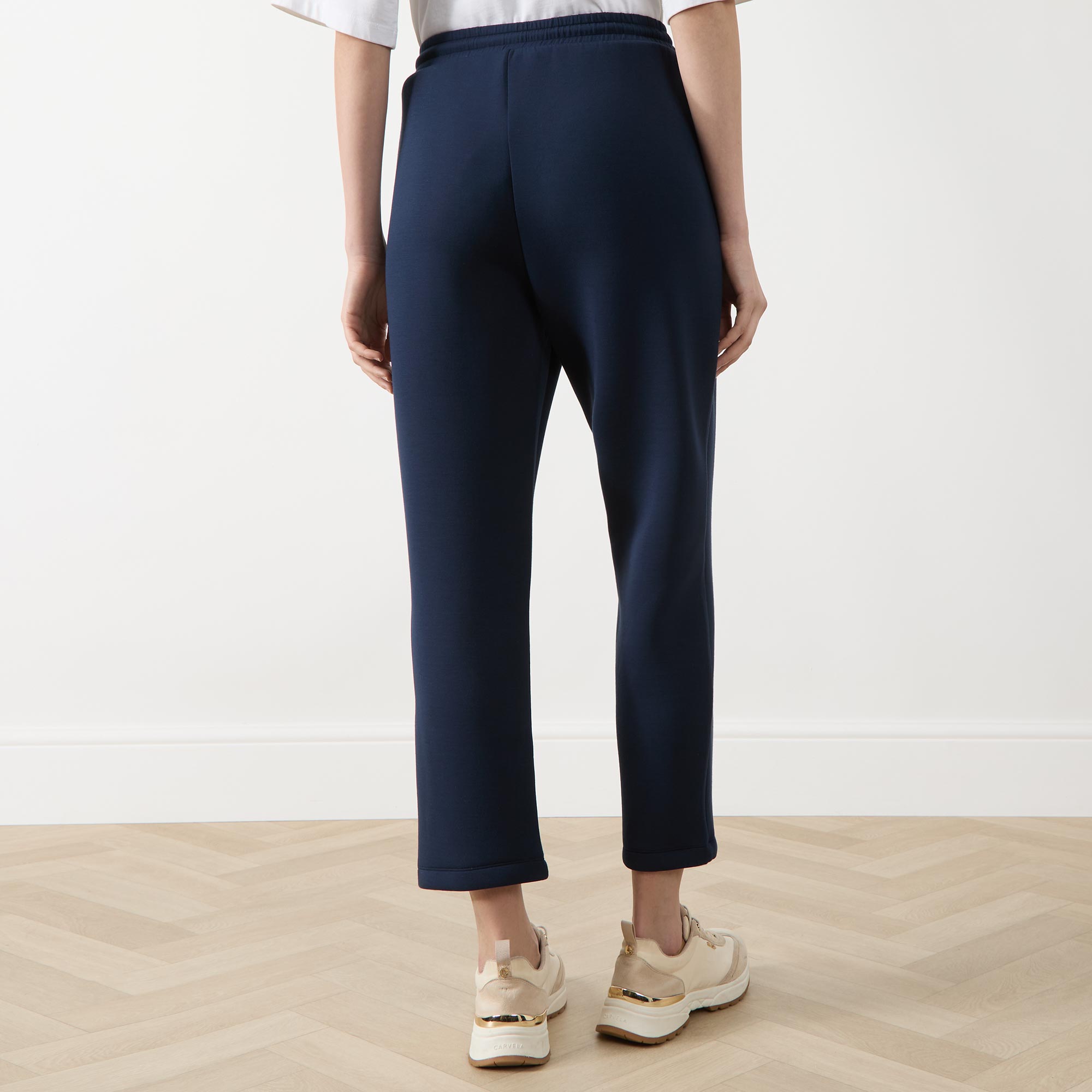 - Elasticated waistband with drawstring adjustable fit, side entry pockets, raised stitching motif at centre front, pressed creases, scuba fabric, straight-cut legs, embroidered logo detail
