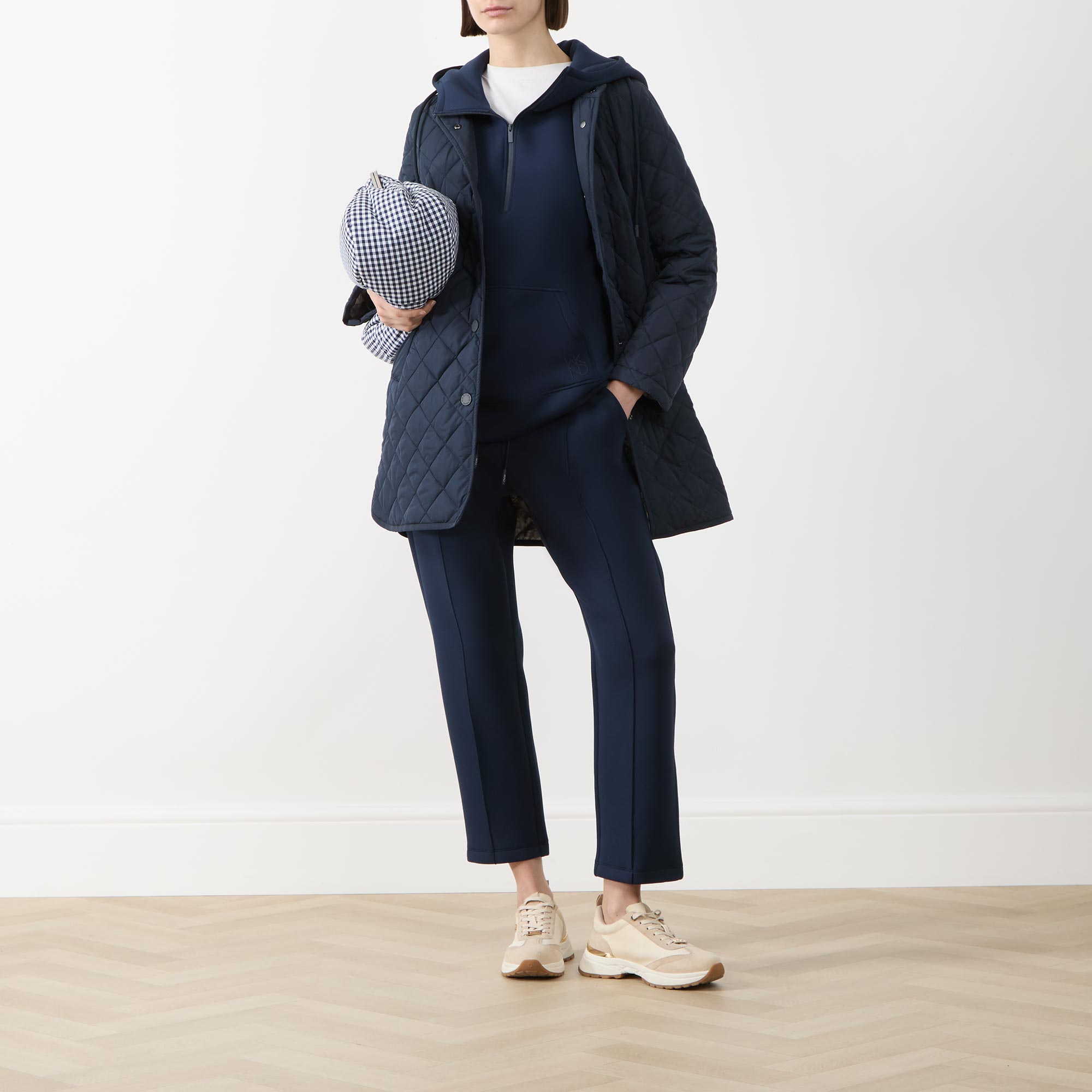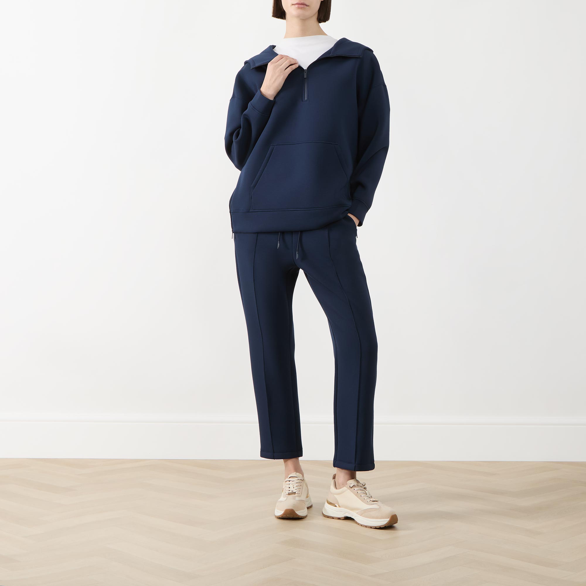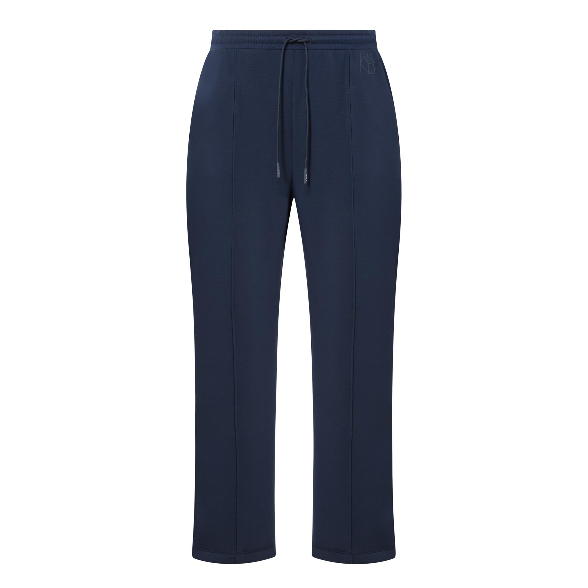 - Elasticated waistband with drawstring adjustable fit, side entry pockets, raised stitching motif at centre front, pressed creases, scuba fabric, straight-cut legs, embroidered logo detail