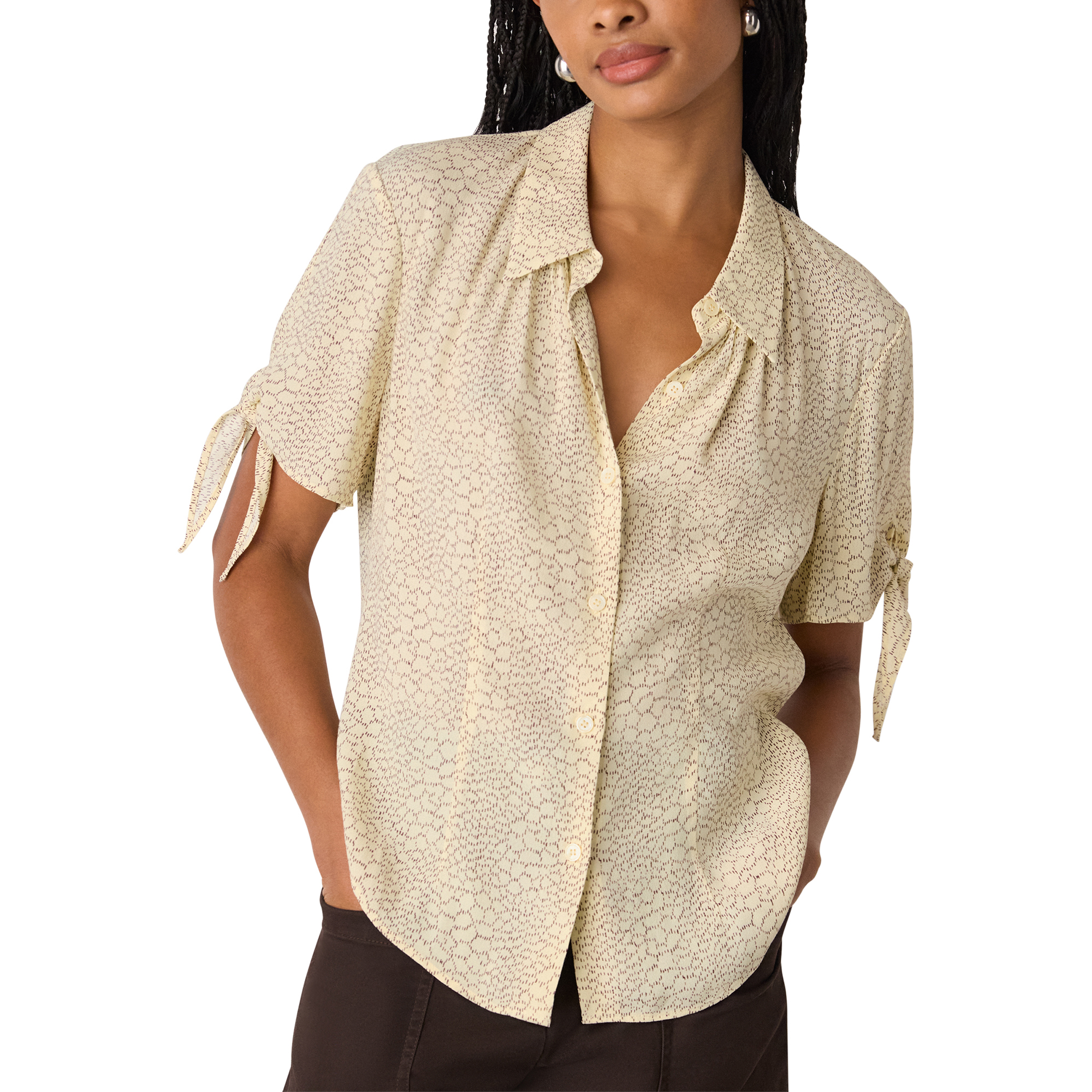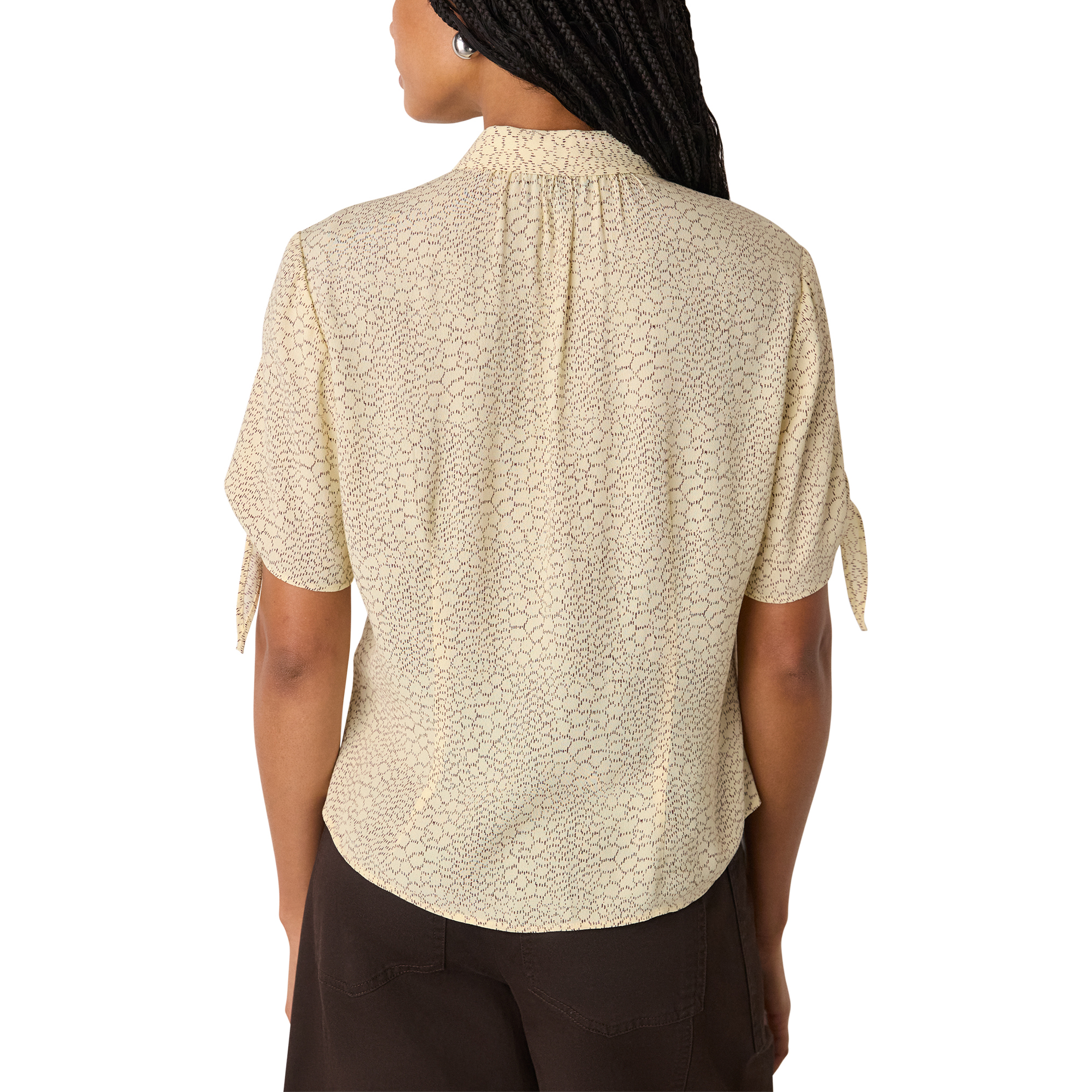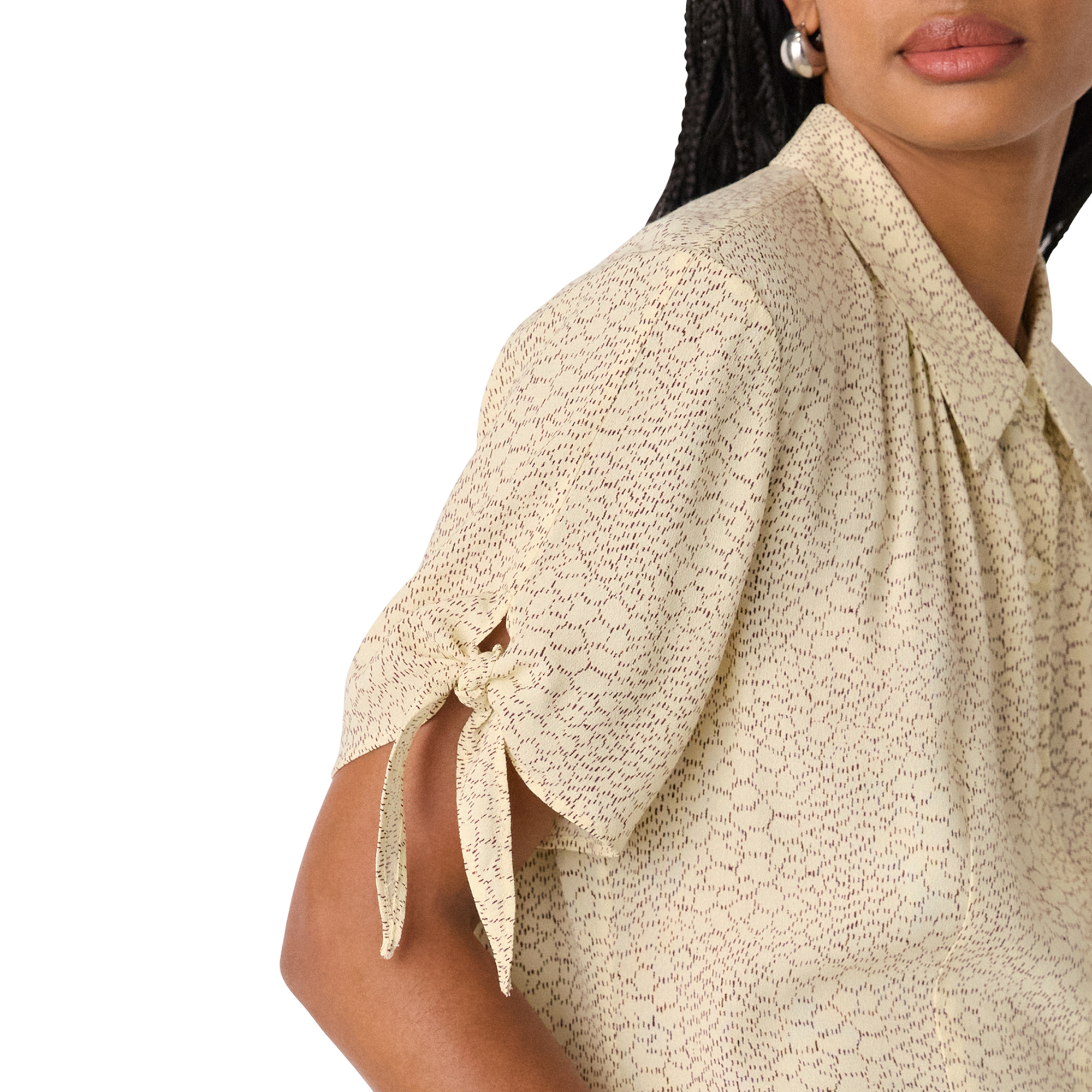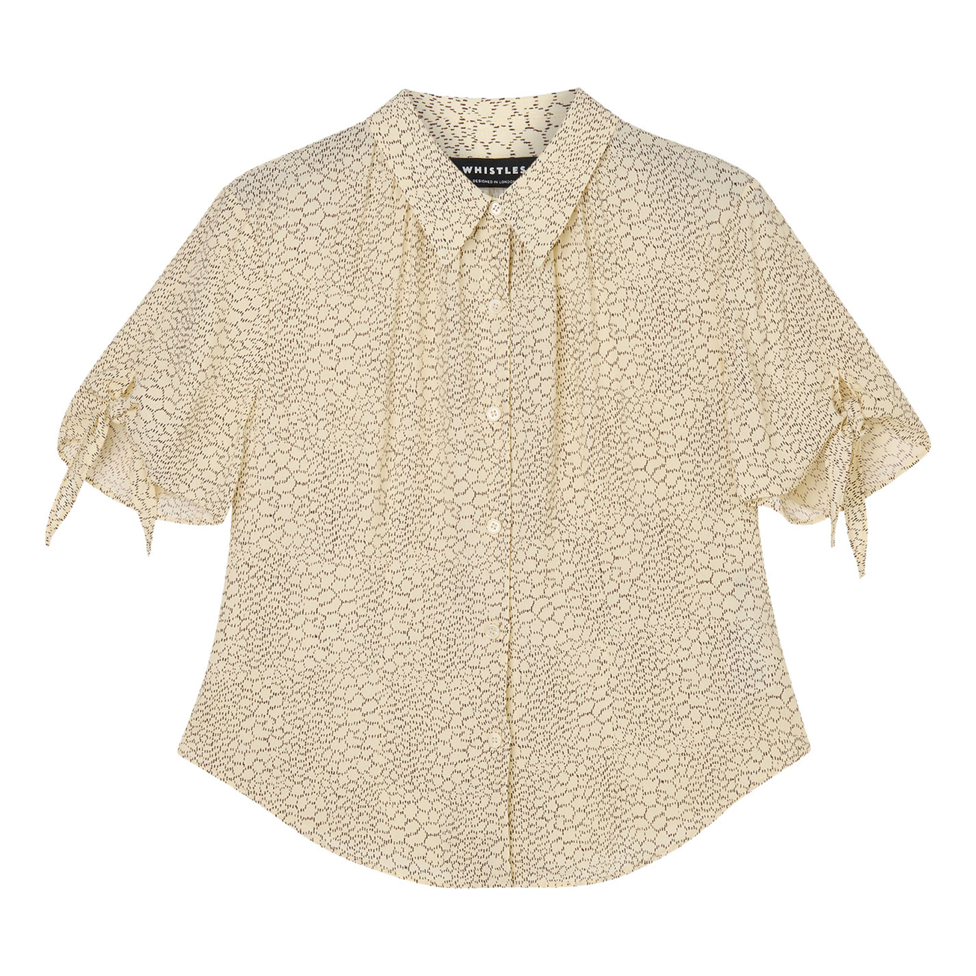 - Collar, short sleeves, tie detail cuffs, front button fastenings, printed