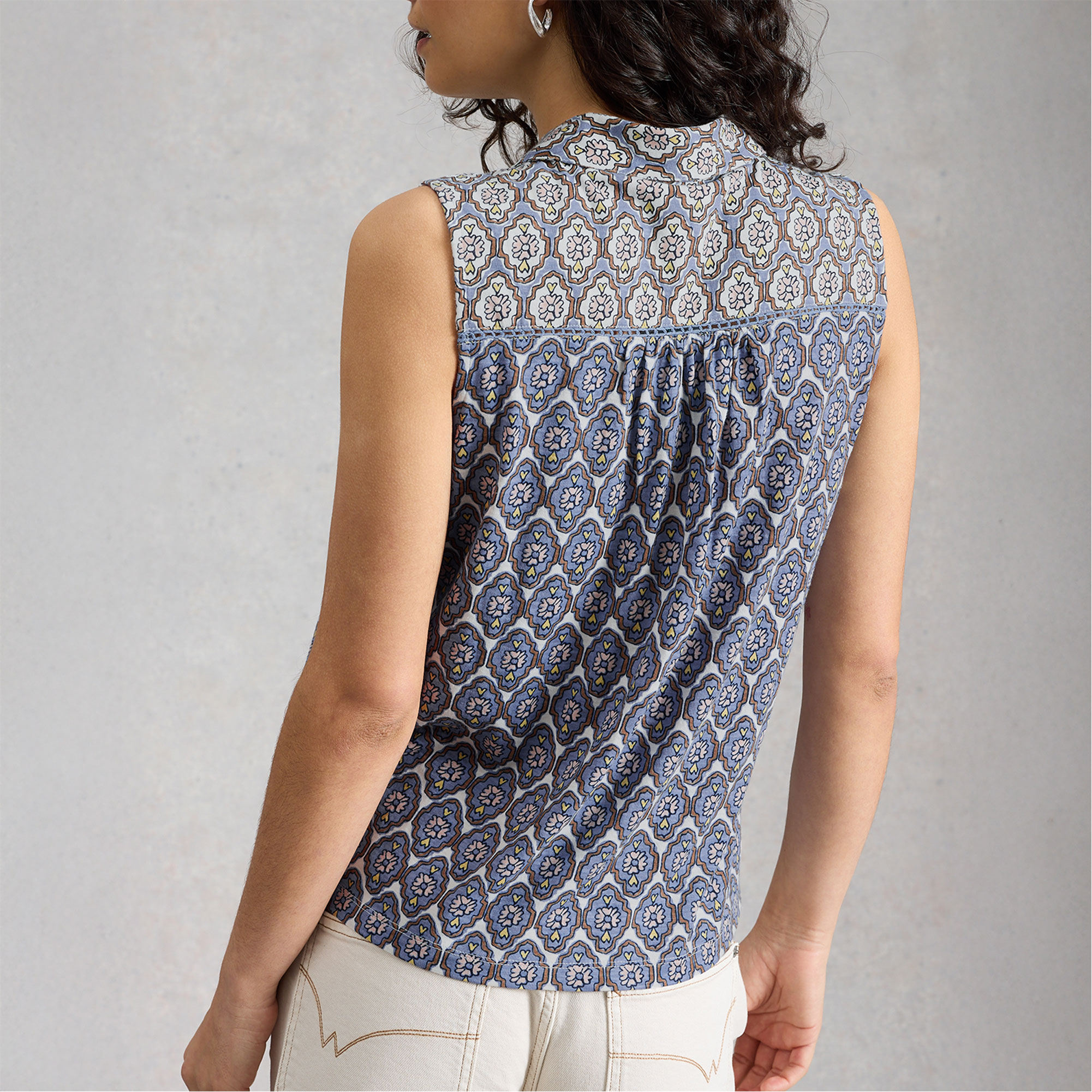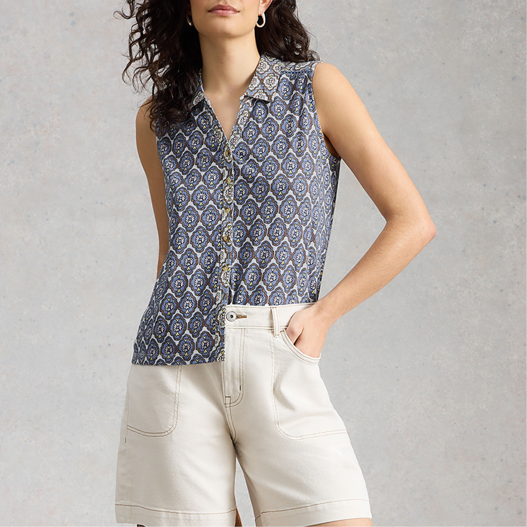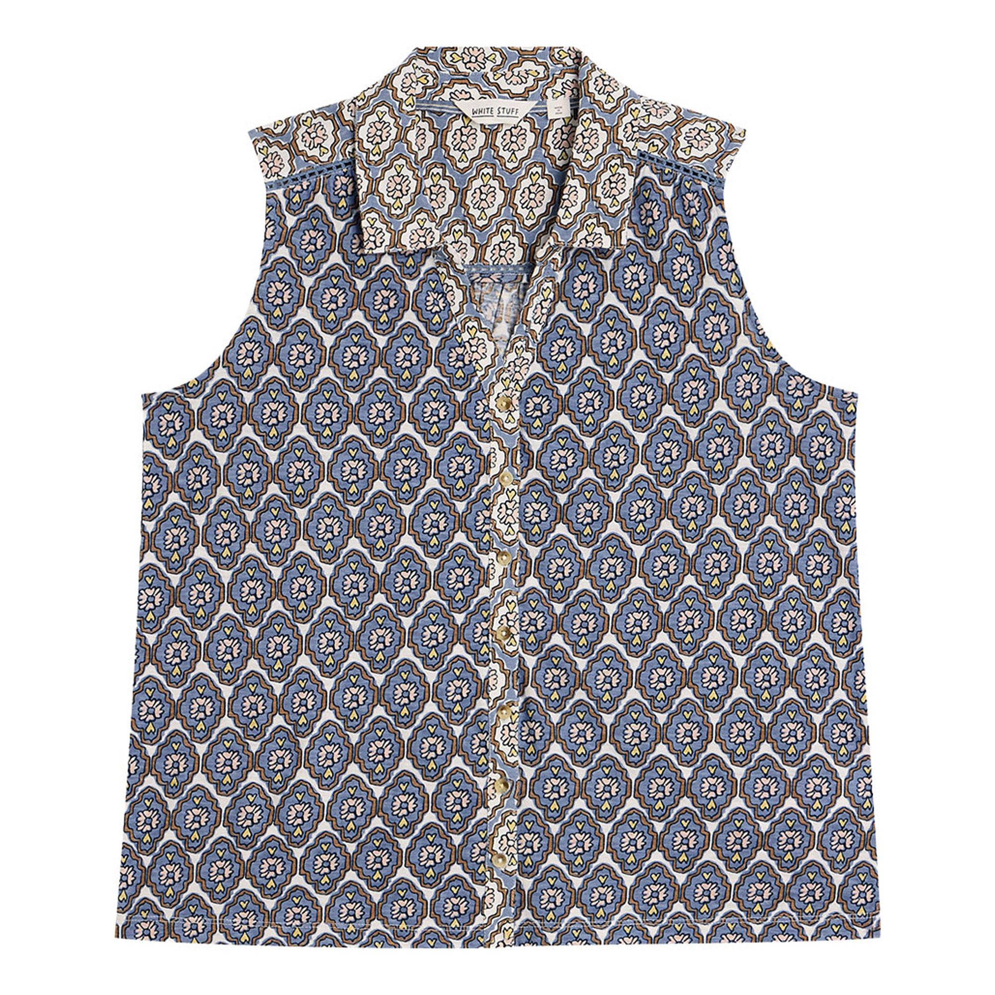 - Printed, sleeveless, shirt collar, jersey fabric, front button fastenings