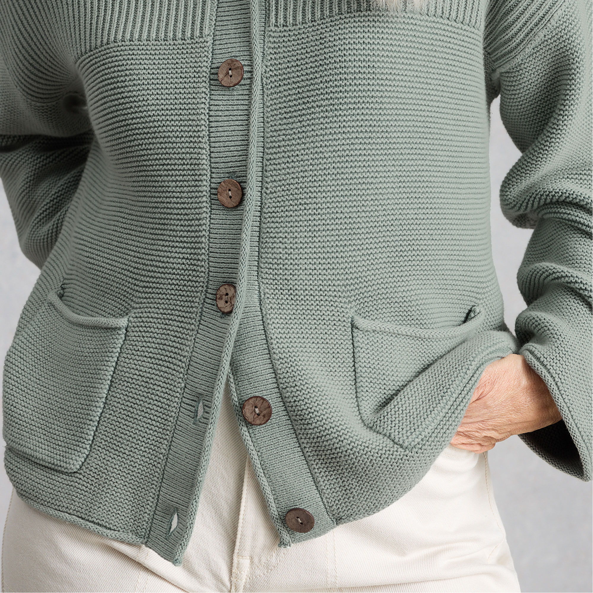 - Knitted, washed finish, front pockets, garment dyed