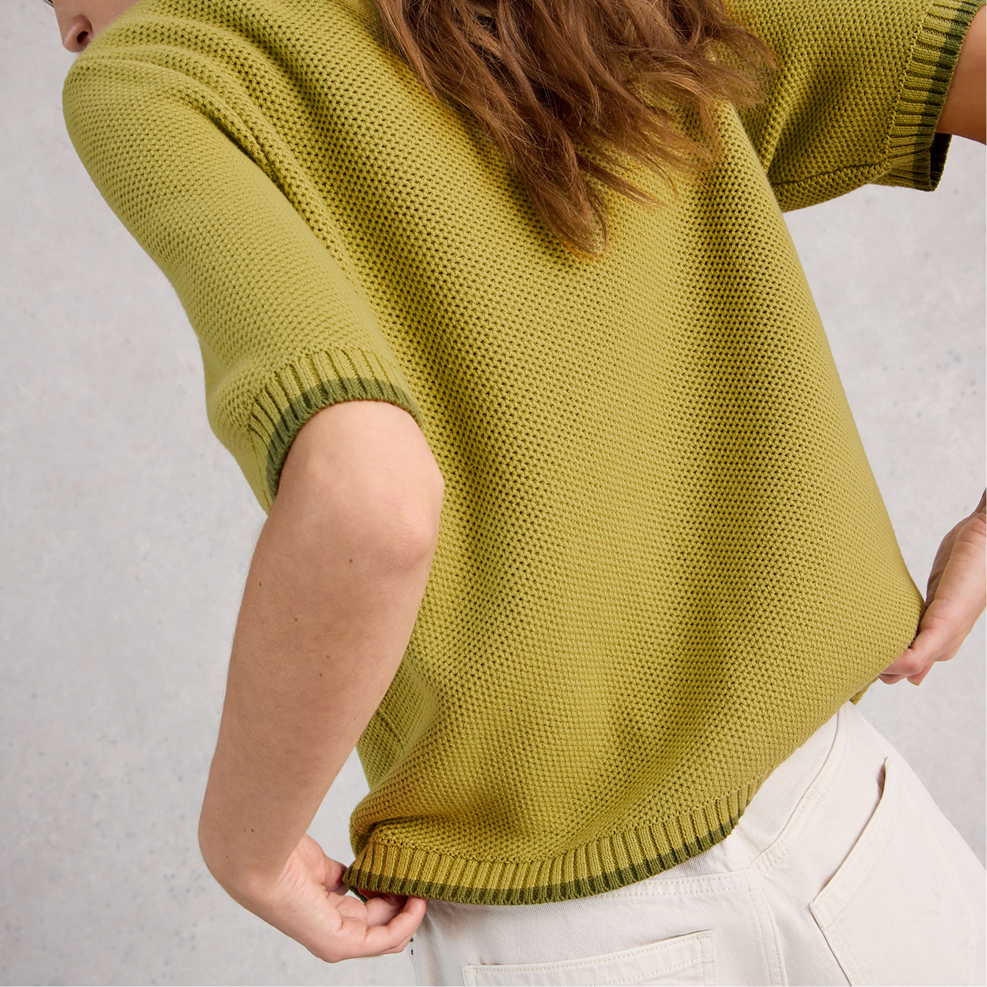 • Short sleeves, front pockets, textured knit finish