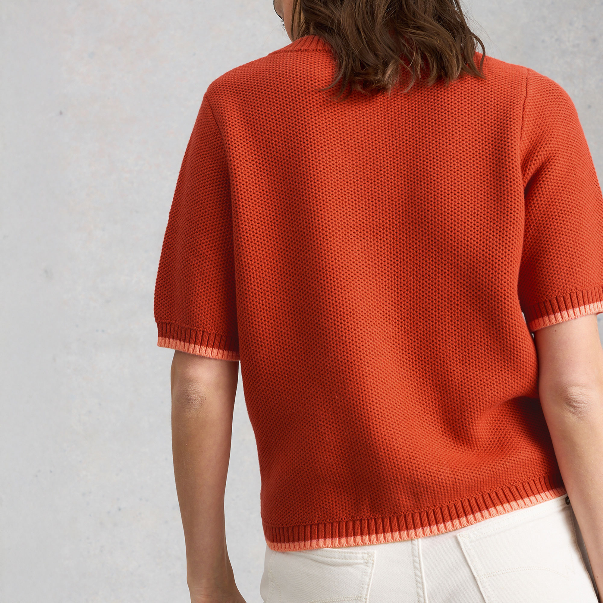 - Short sleeves, contrast trims, front patch pockets, textured knit finish