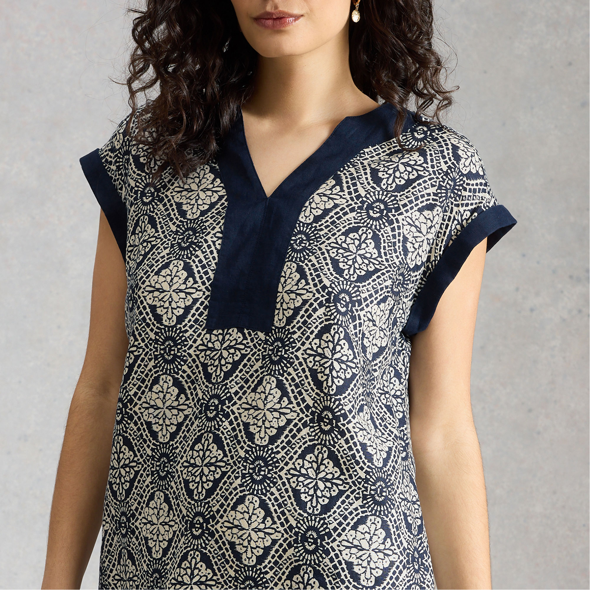 - Shift style, printed, contrast placket, turned-back contrast cuffs, V-neckline, cap sleeves