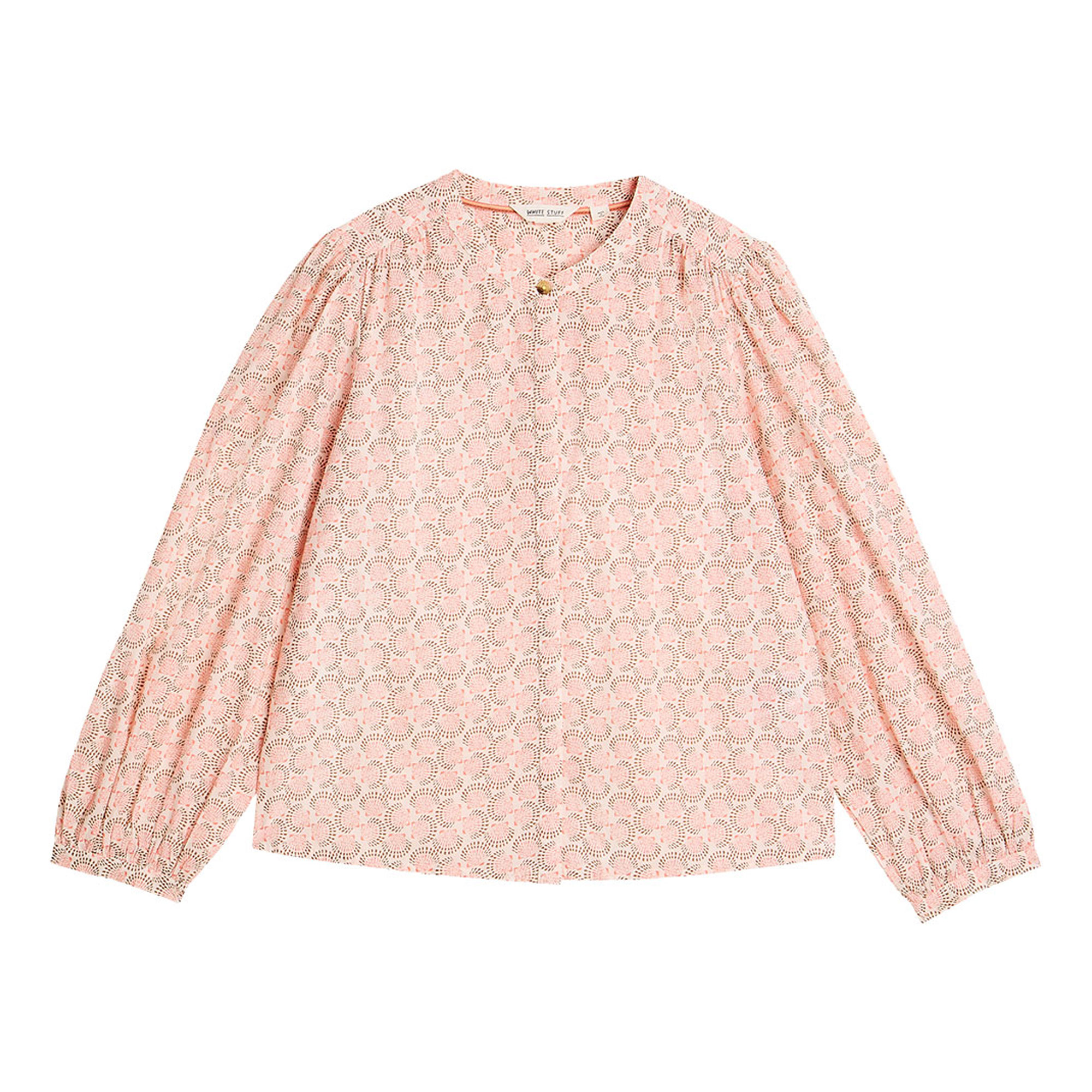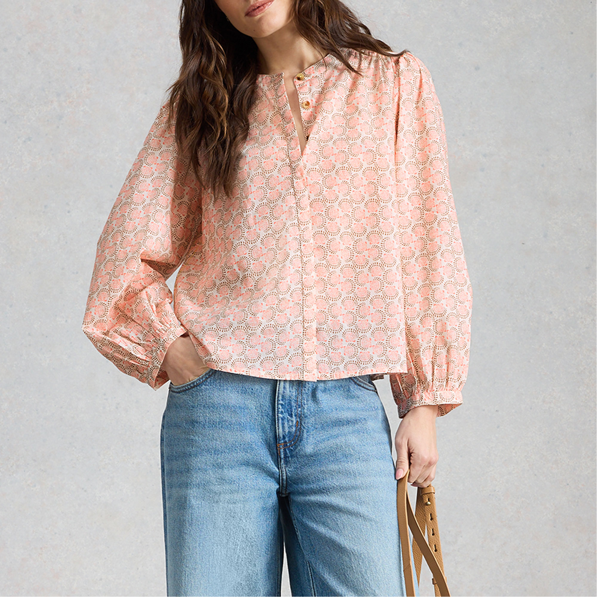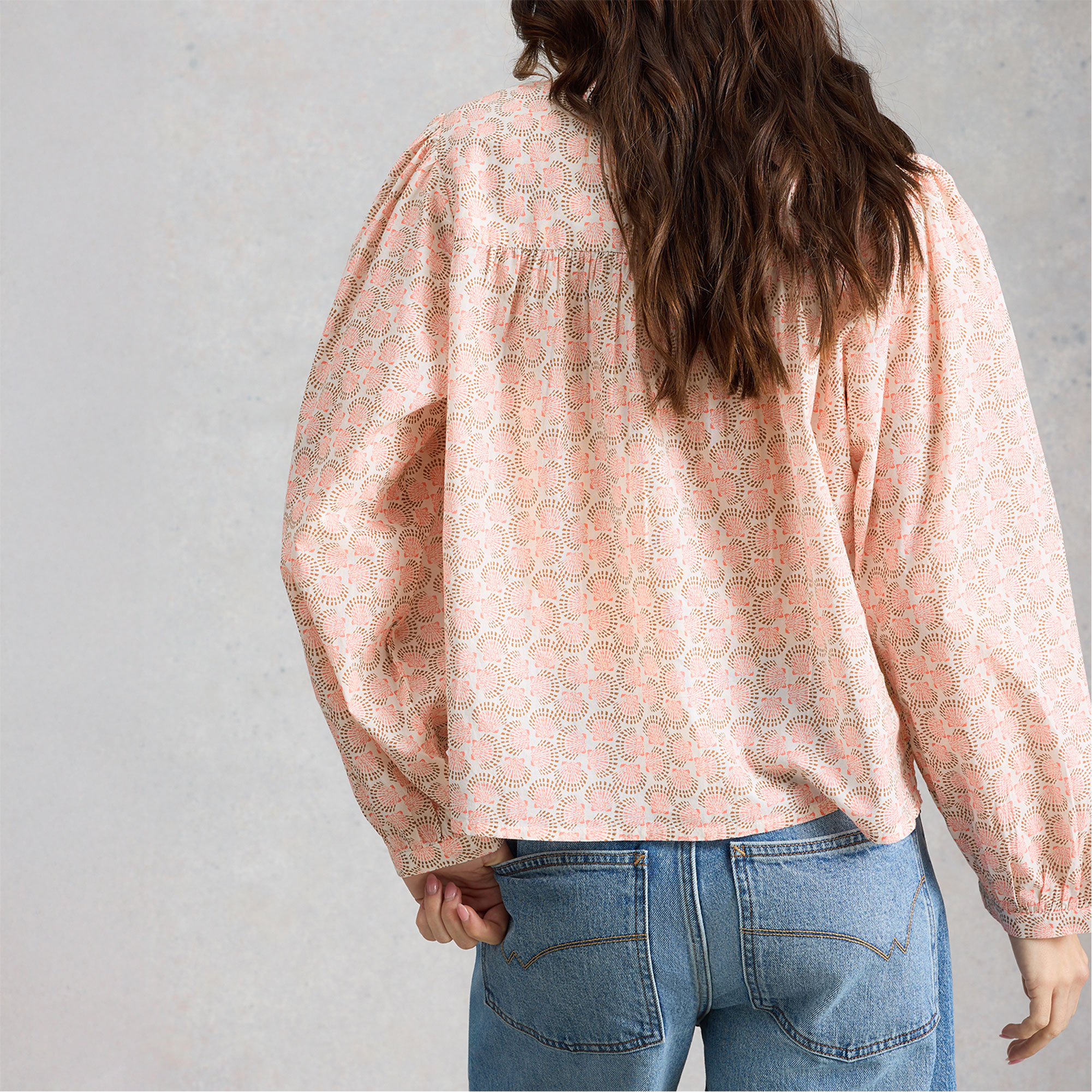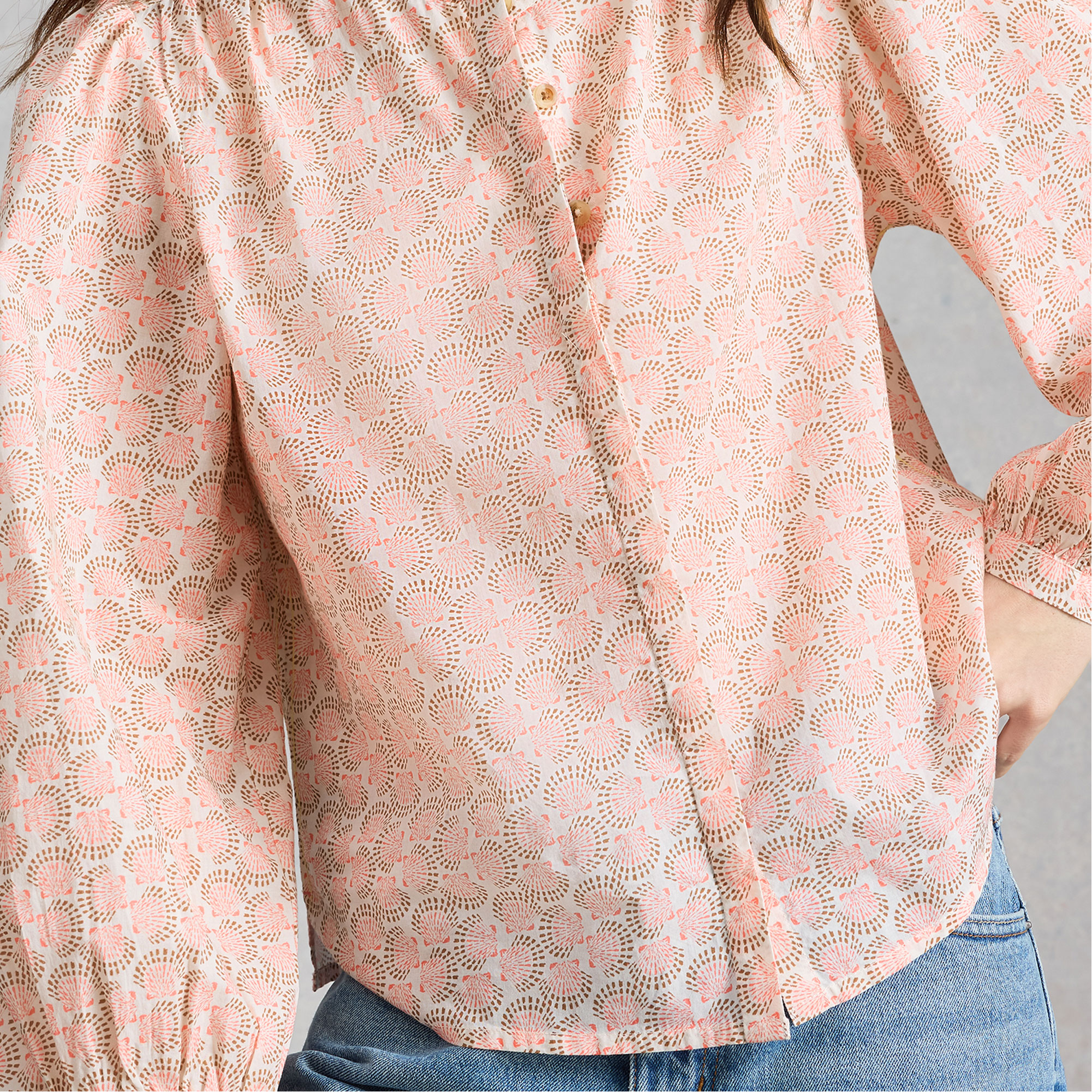 - Soft feel, shell print, round neckline, concealed button placket, long puff sleeves, gathered cuffs