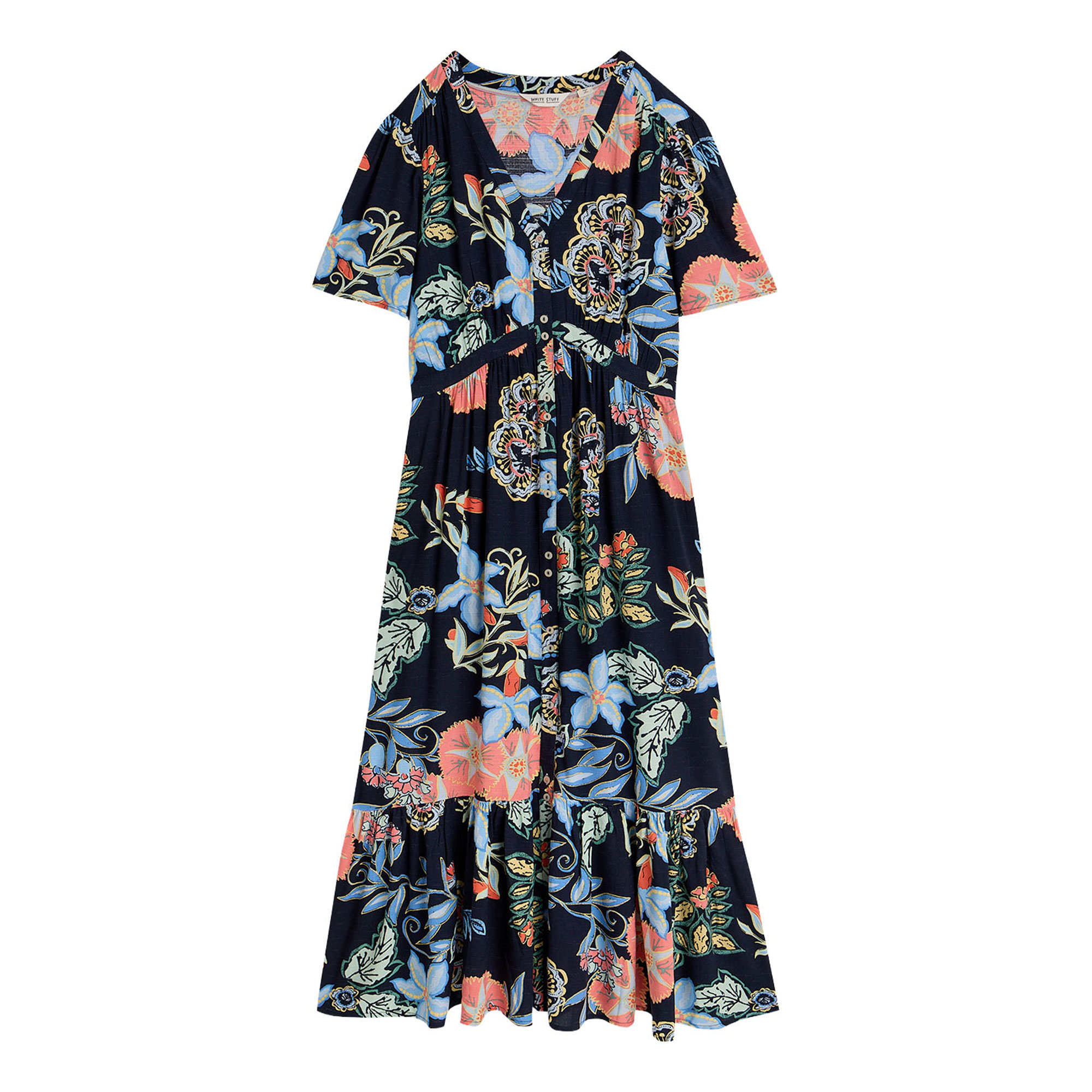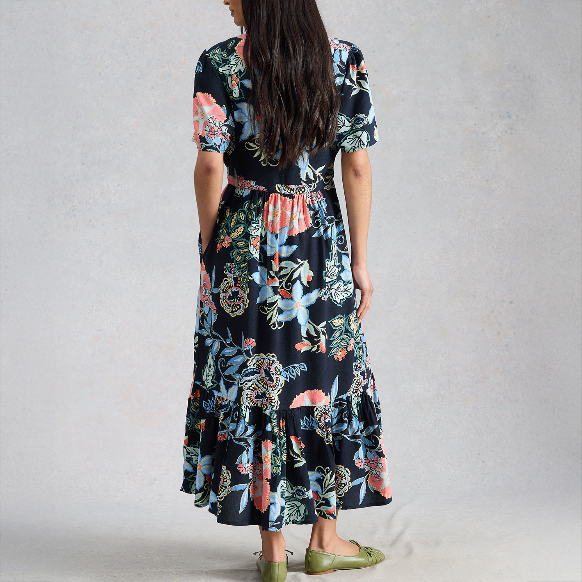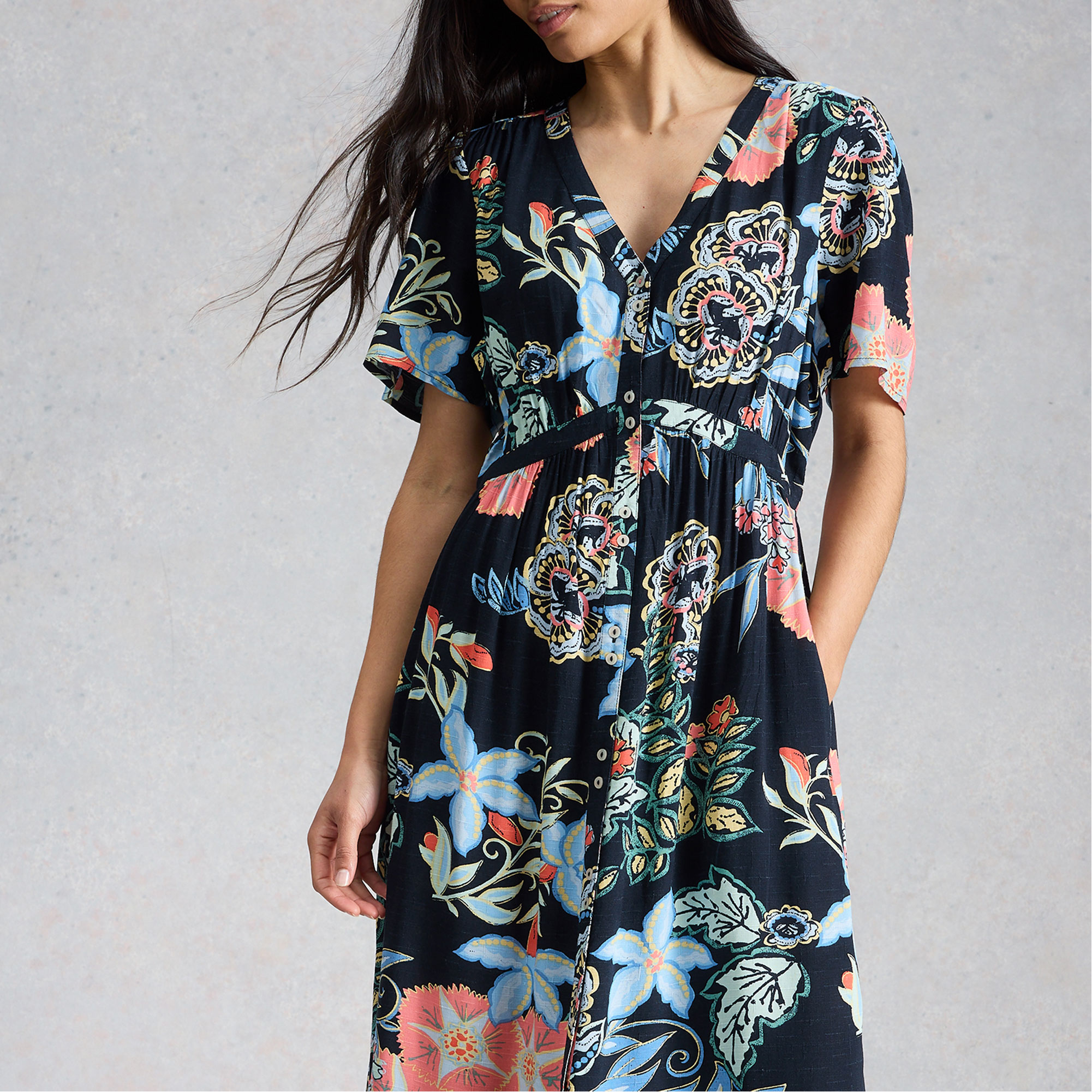 • Midi length, V-neckline, short sleeves, printed, gathered empire waist
