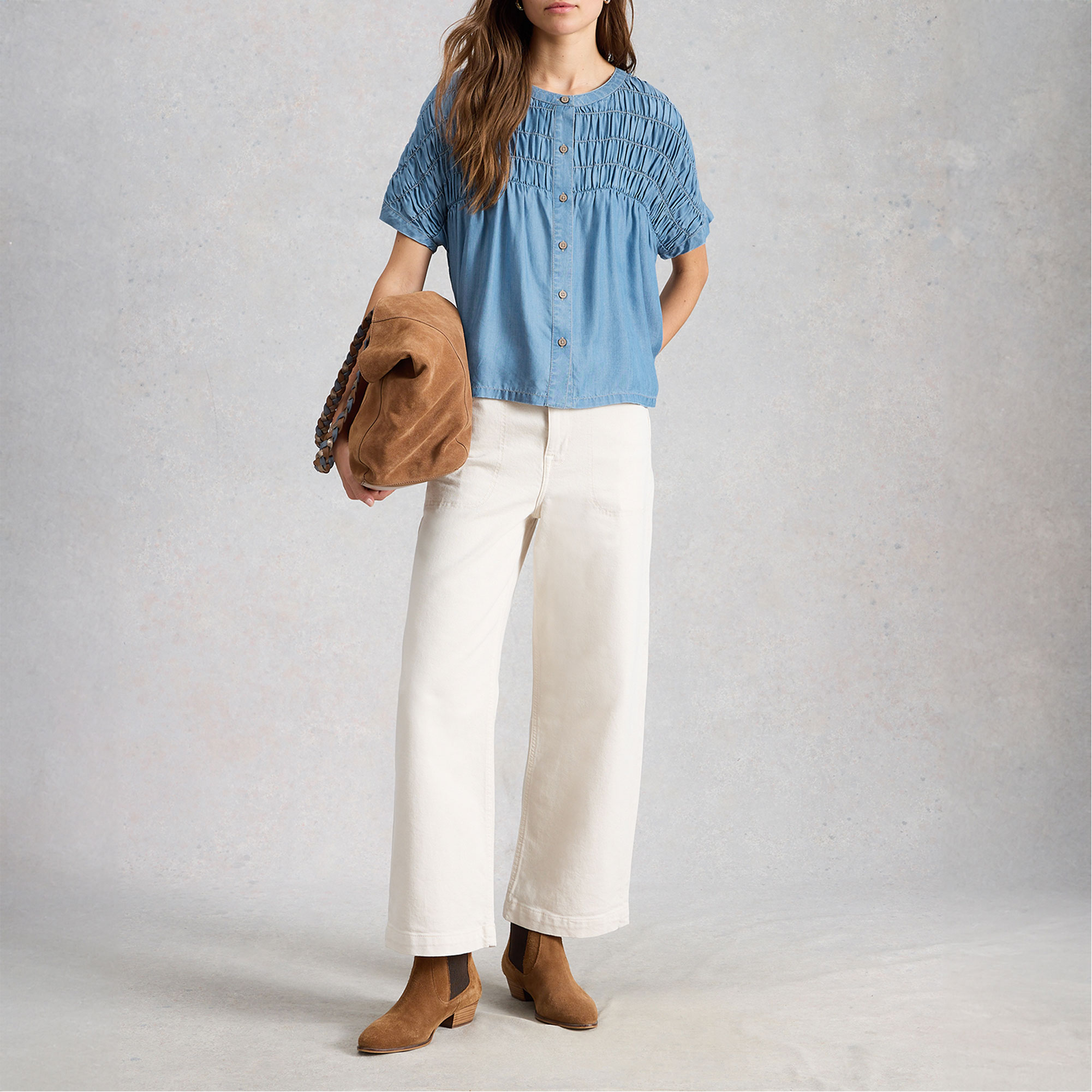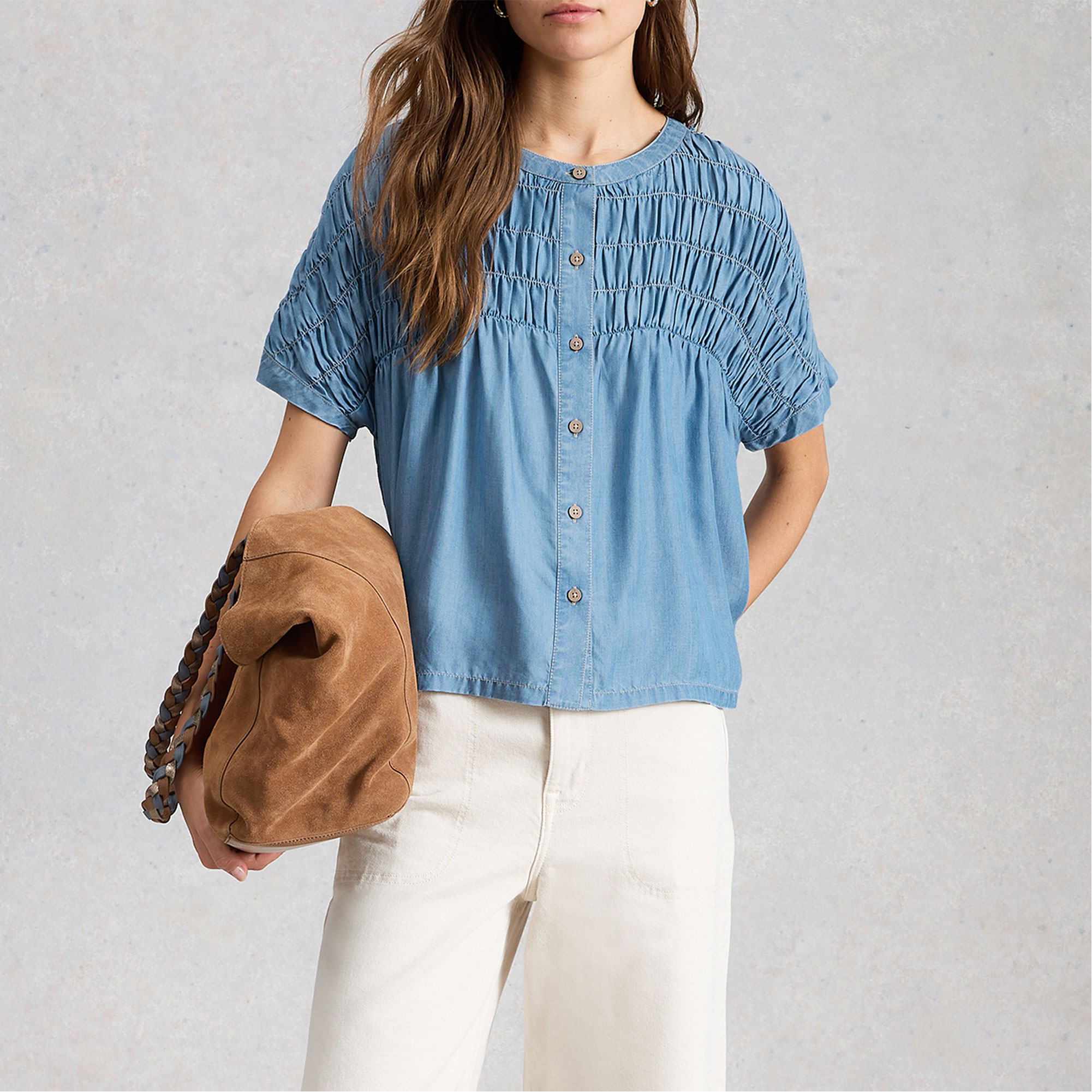 WHITE STUFF Tammie Chambray Shirred Blouse