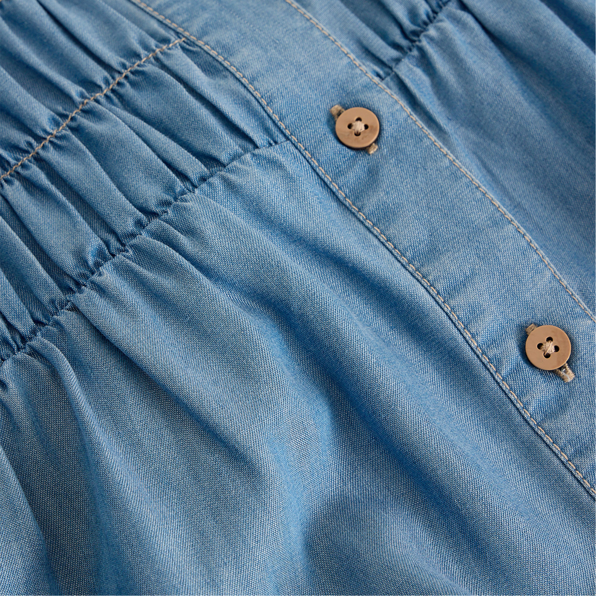 - Chambray, shirring details, lightweight, front button fastenings, round neckline, short sleeves