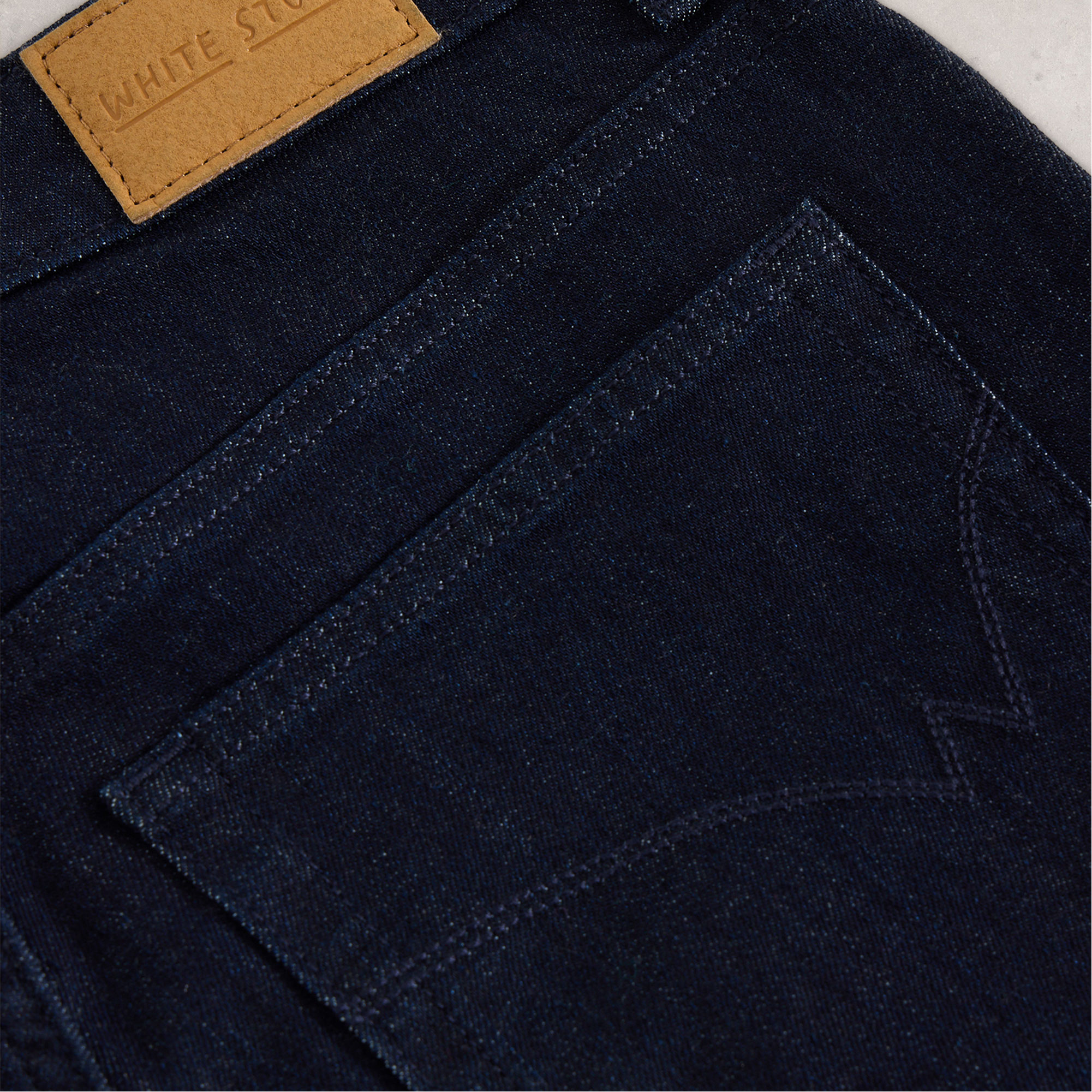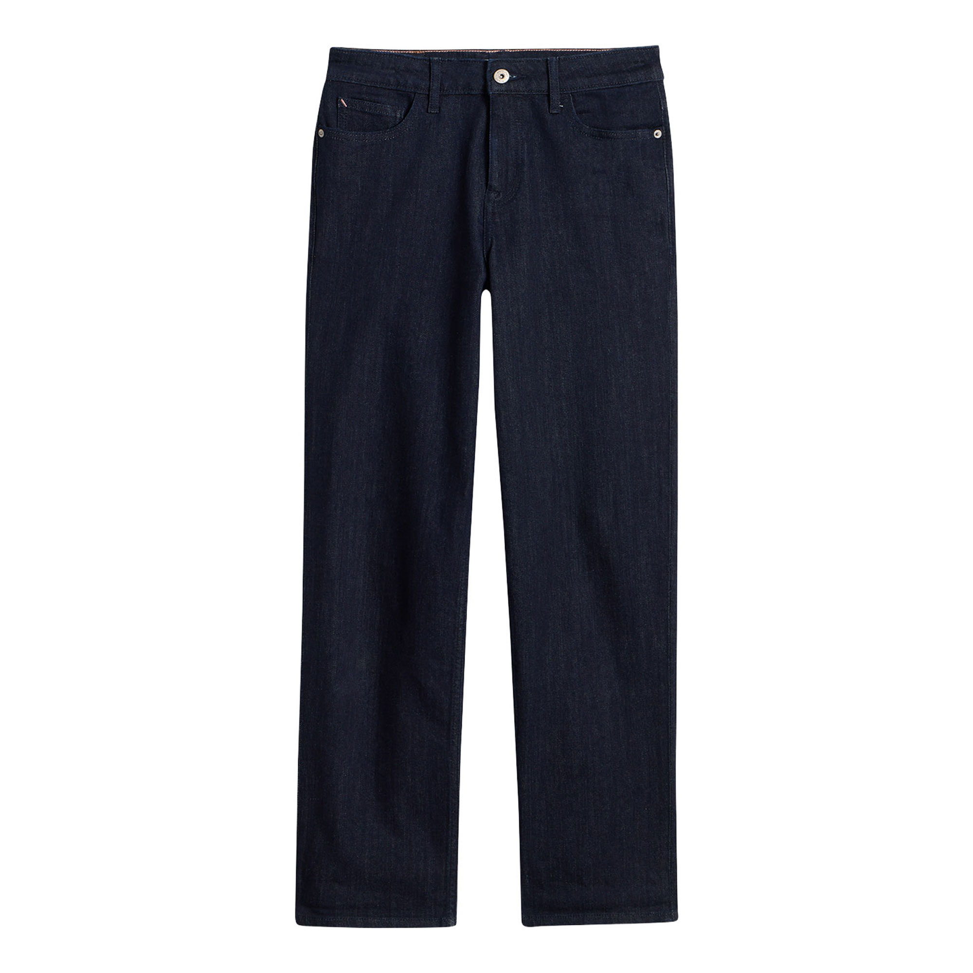 - Slim-straight-leg silhouette, front and back pockets, belt loops, zip fly fastening