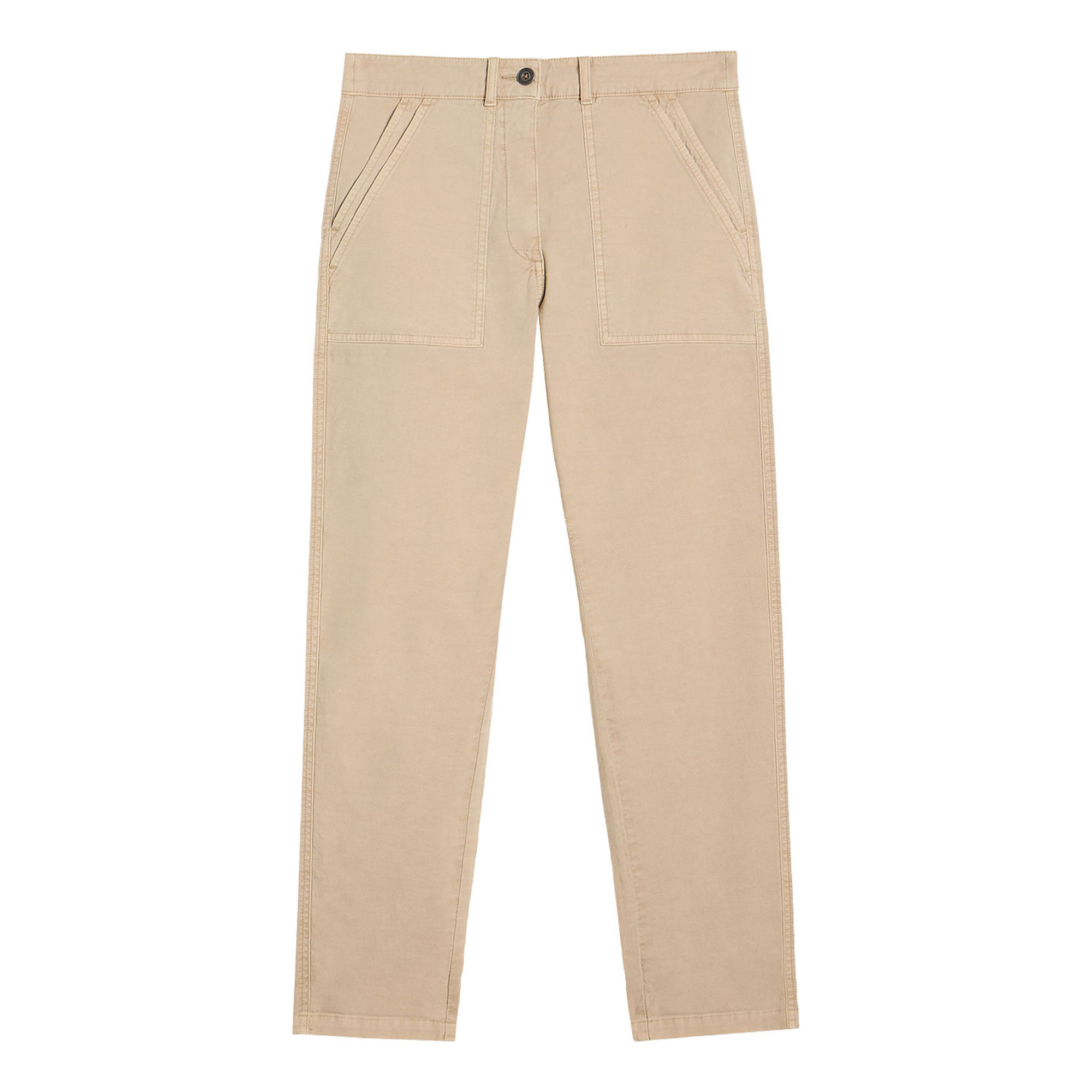 - Tapered silhouette, chino style, soft feel, stretch-fused