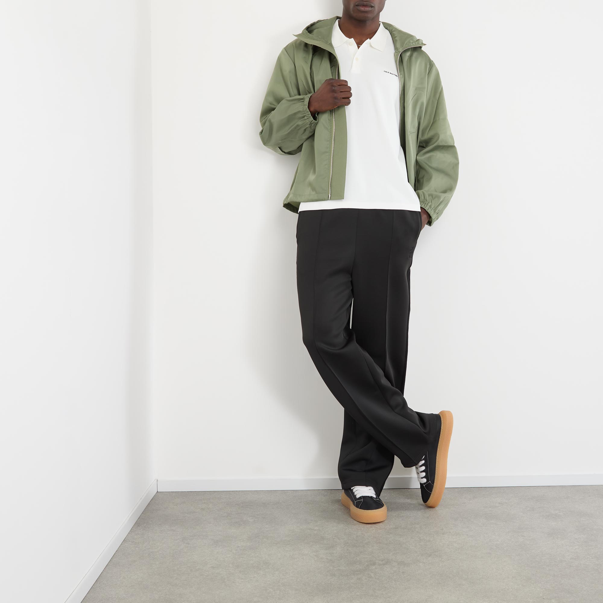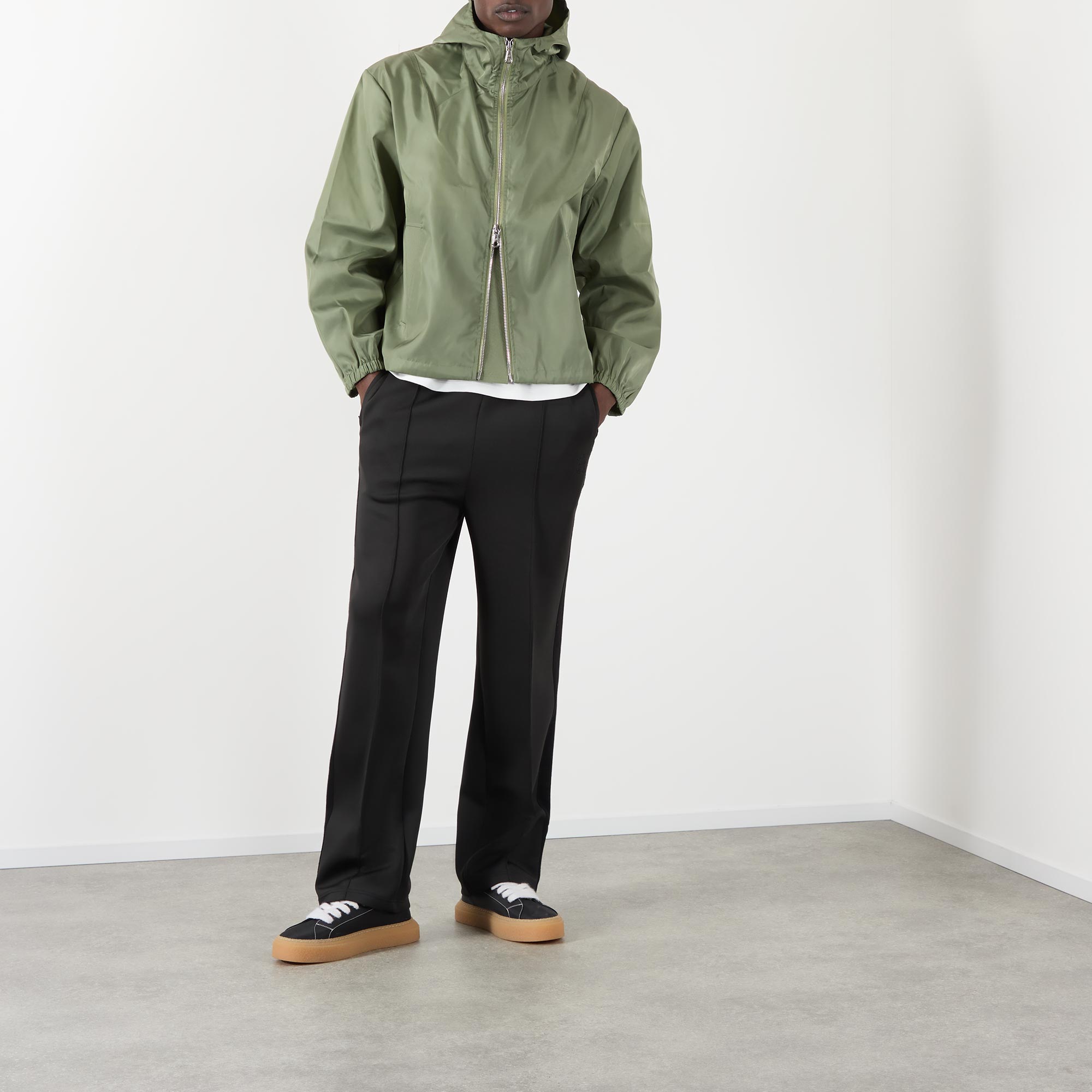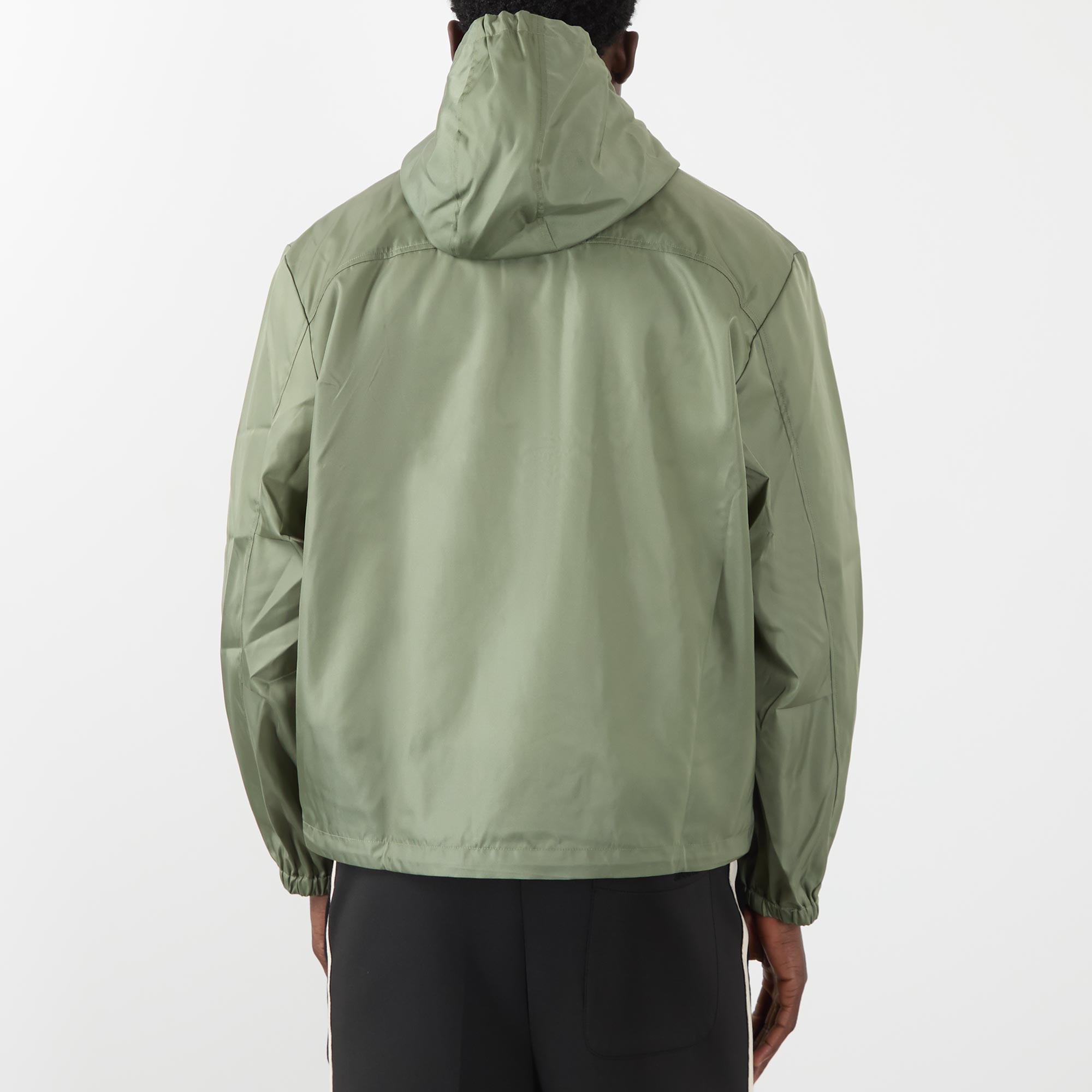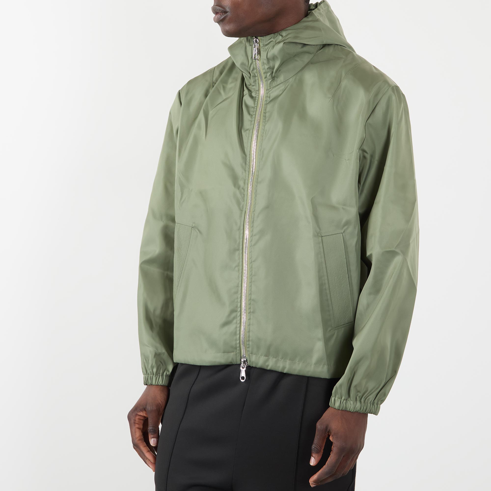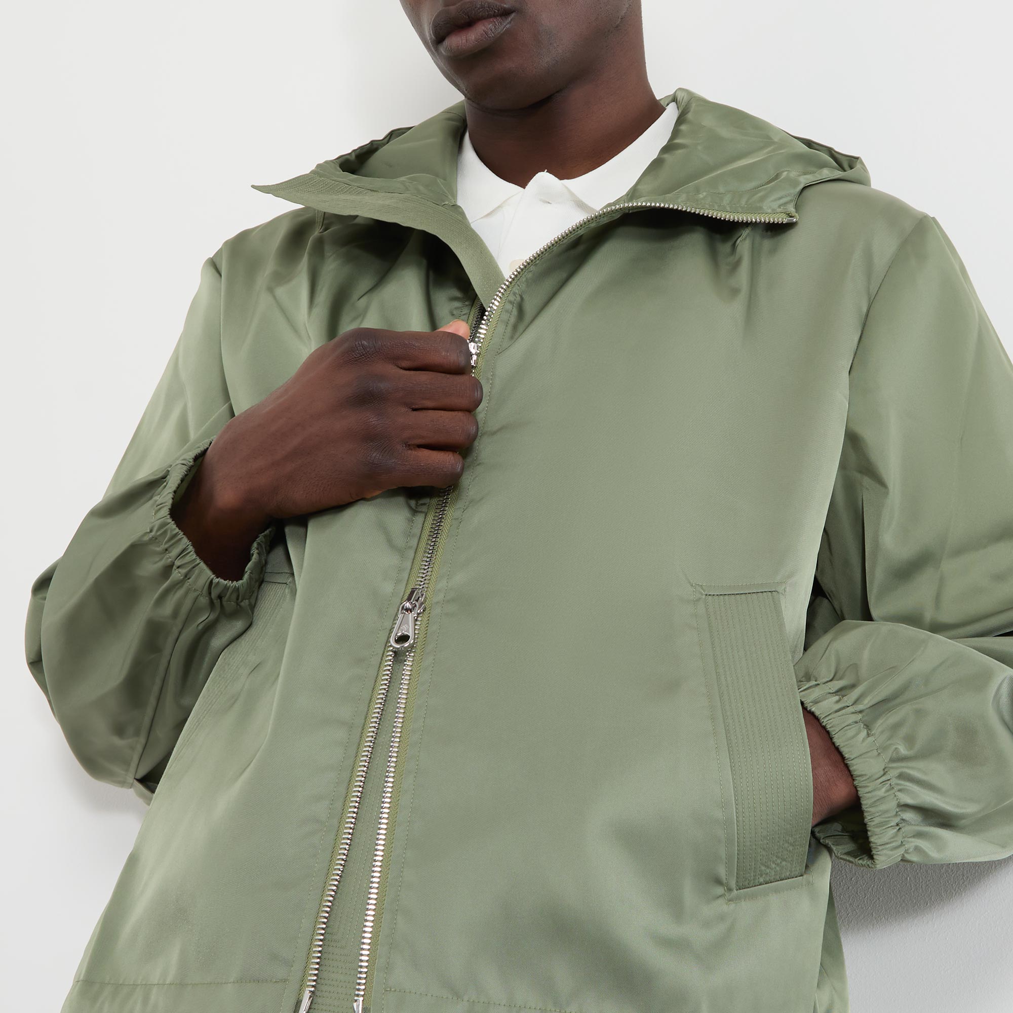 - High neckline, dropped shoulders, long sleeves, elasticated cuffs, branded two-way front zip fastening, two angled welt pockets, straight adjustable hem, lightweight, subtle sheen finish