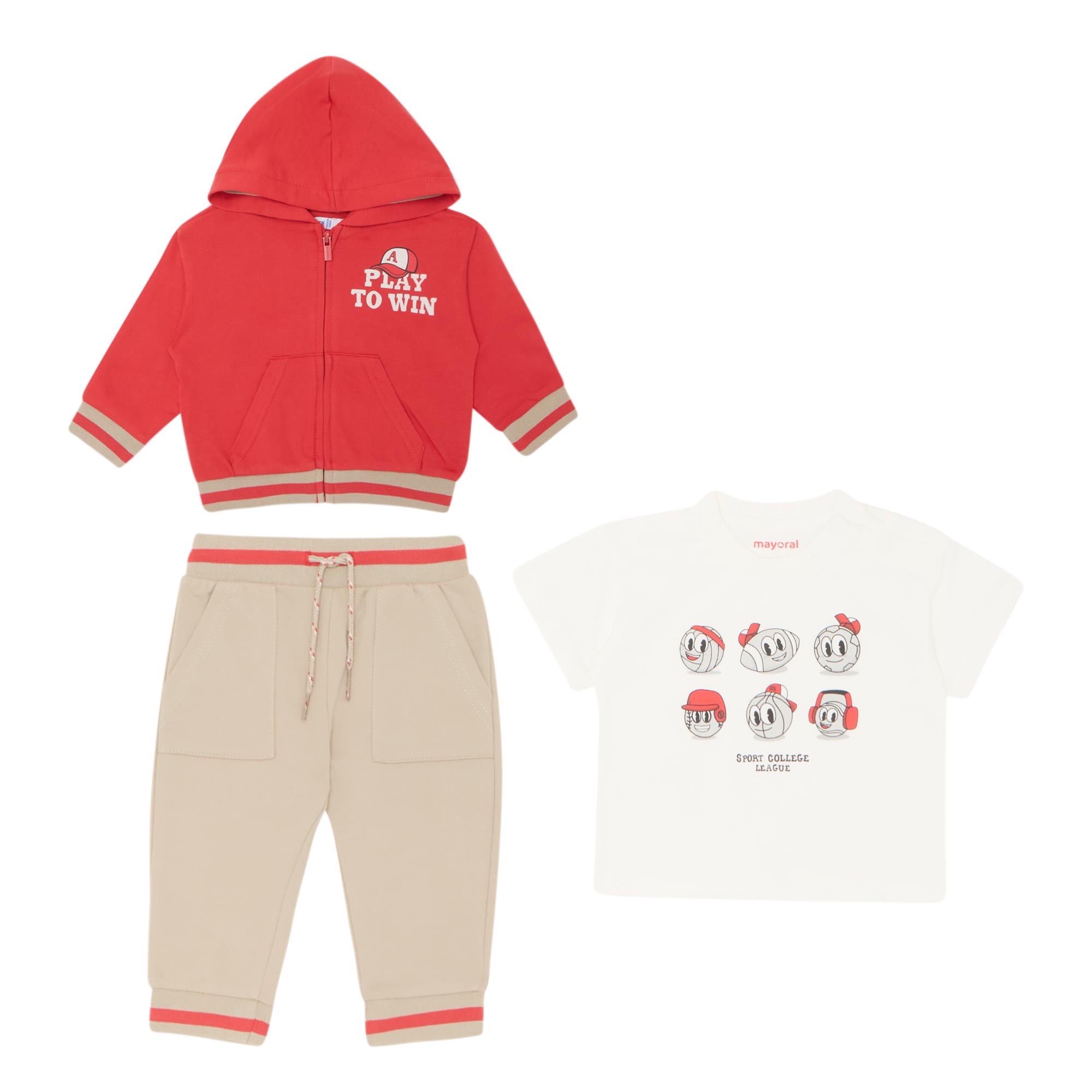 • Three-piece: Hoodie: Hood, long sleeves, zip fastening, split kangaroo pocket, straight hem, striped ribbed trims, Play To Win graphic on the chest; T-Shirt: Crew neck, short sleeves, straight hem, sports graphic on the front; Joggers: Elasticated waistband with adjustable drawstring fastening, slim leg, cuffed ankles, two front pockets, striped ribbed trims