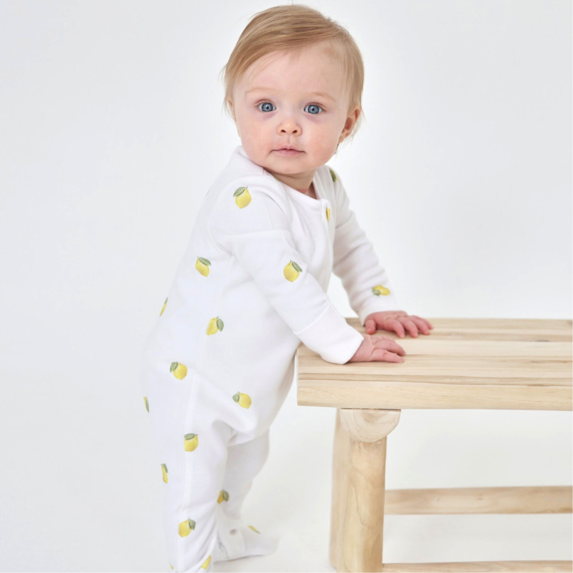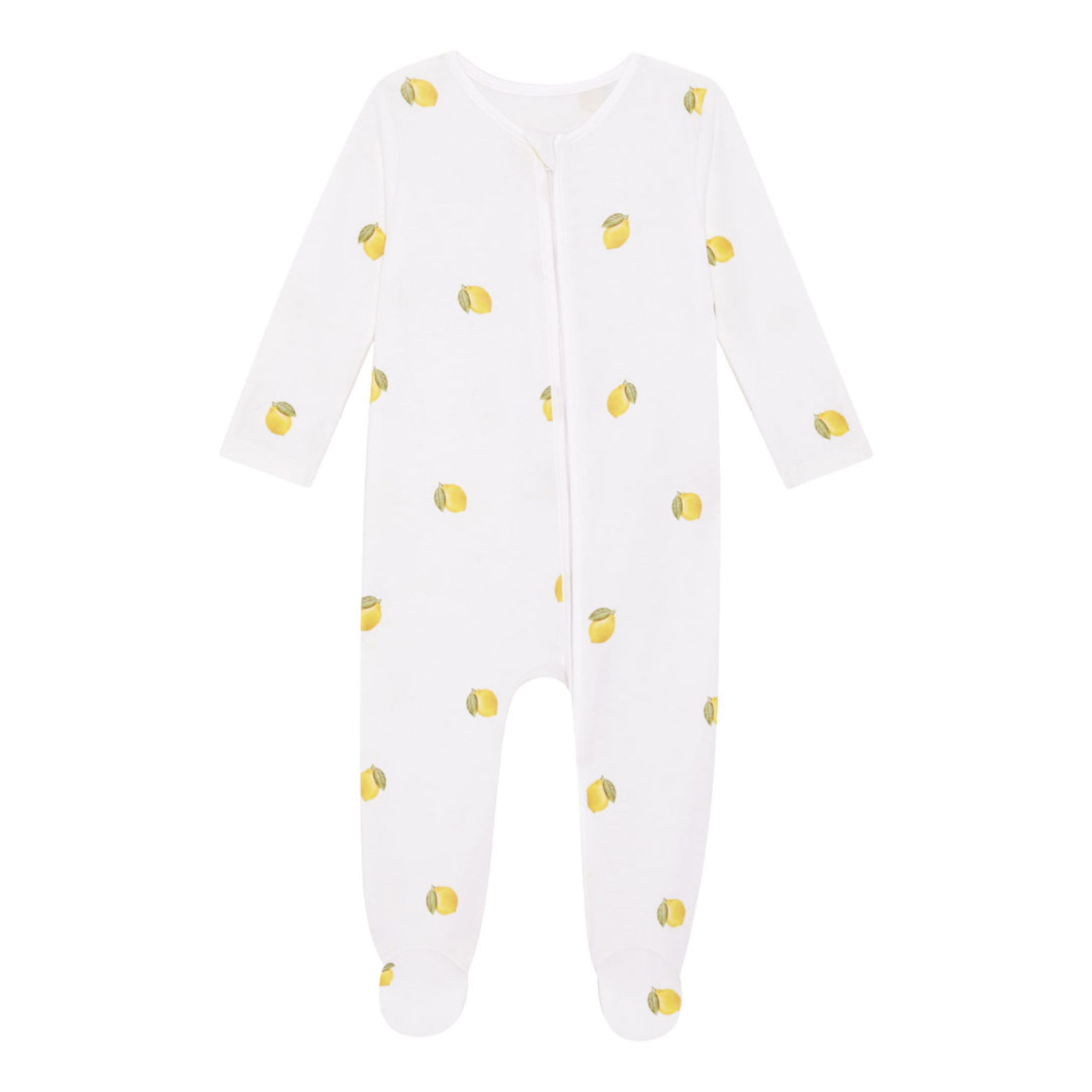 - Soft feel, breathable, thermo-regulating, concealed two-way zip fastening, hand-painted print, lemon design, round neckline, long sleeves, zip guard to protect sensitive skin, fold-over scratch mittens (on sizes up to 6 months), enclosed feet (on sizes up to 9 months)