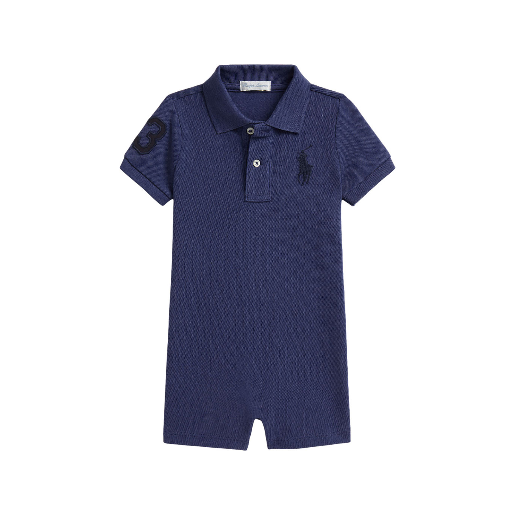 - One-piece design, signature embroidered Big Pony logo, “3” patch detail, ribbed Polo collar, two-button placket, short sleeves, ribbed armbands, concealed ring snaps at the hem