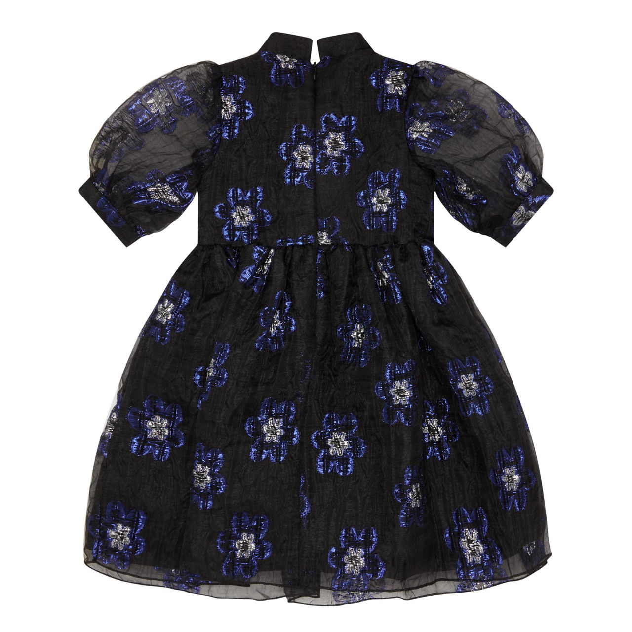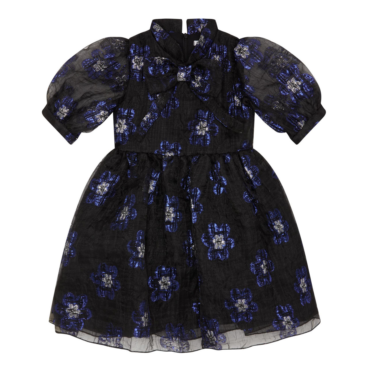 - Shimmering floral embroidery, semi-sheer balloon sleeves, bow neckline, puffed skirt.