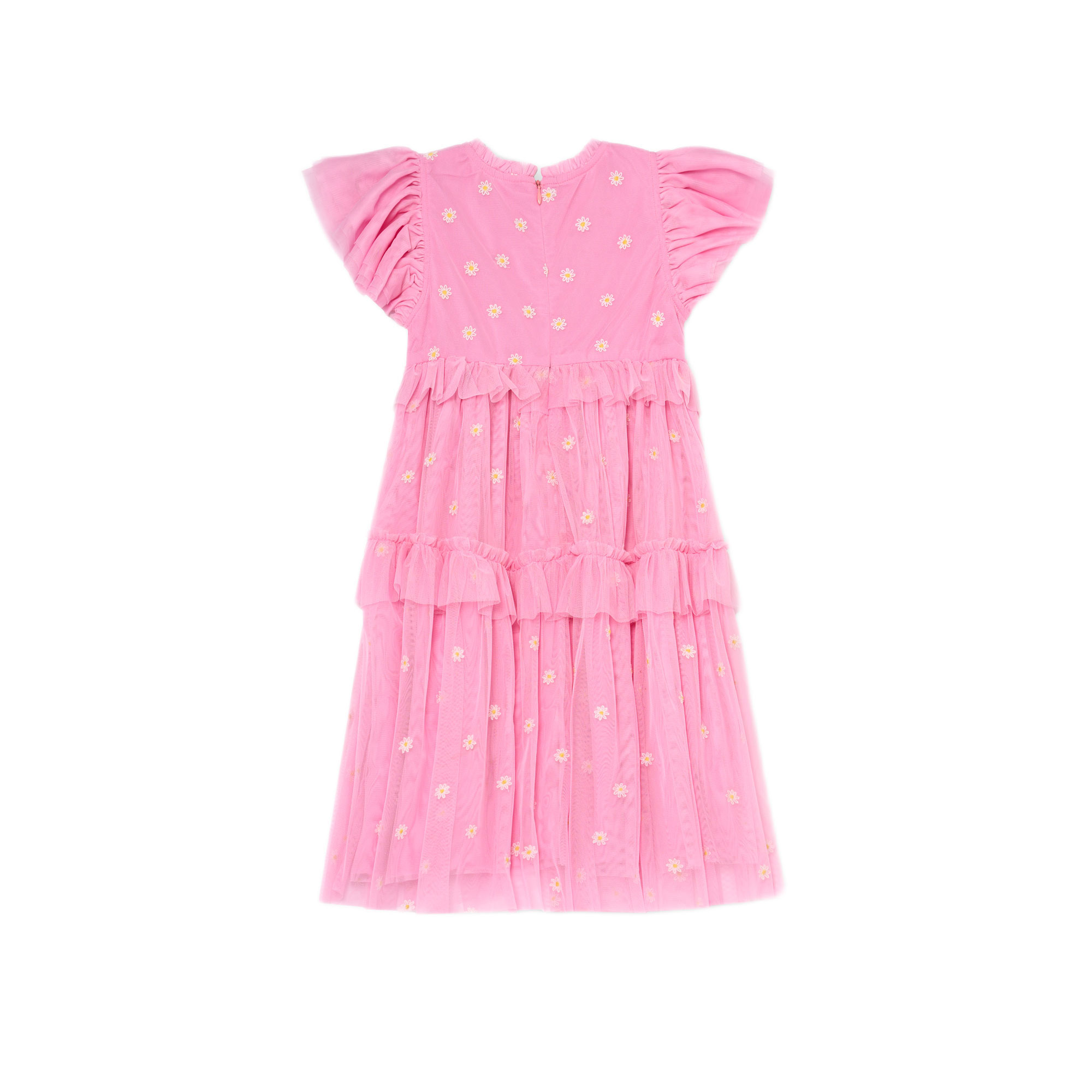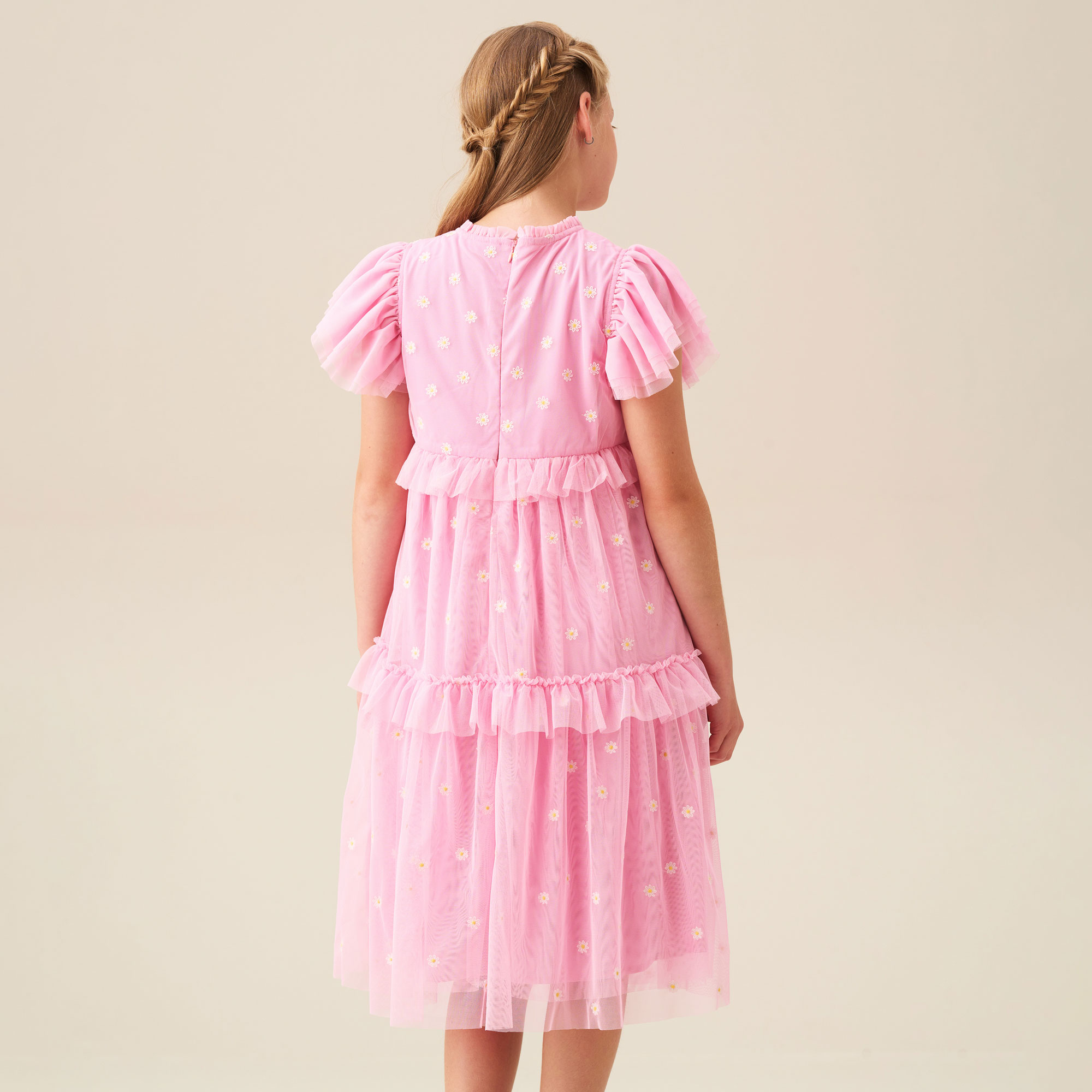 Sweet as sunshine and beautifully detailed, this pink mesh dress is sprinkled with delicate embroidered daisies and finished with layered frills for a floaty, fairy-tale look. With flutter sleeves and a breezy silhouette, it’s made for twirls, smiles, and all things lovely.