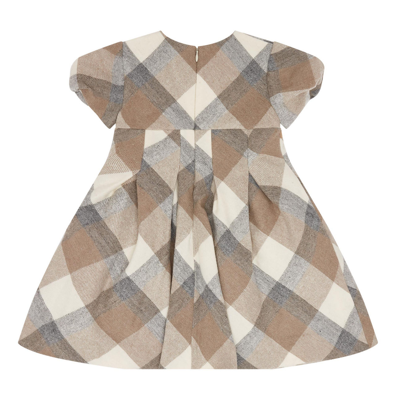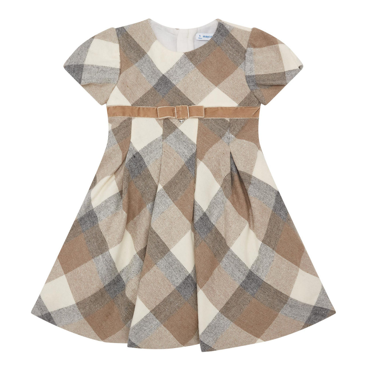 - Round neckline, short sleeves, flared skirt, zip fastening at rear, bow detail, check pattern