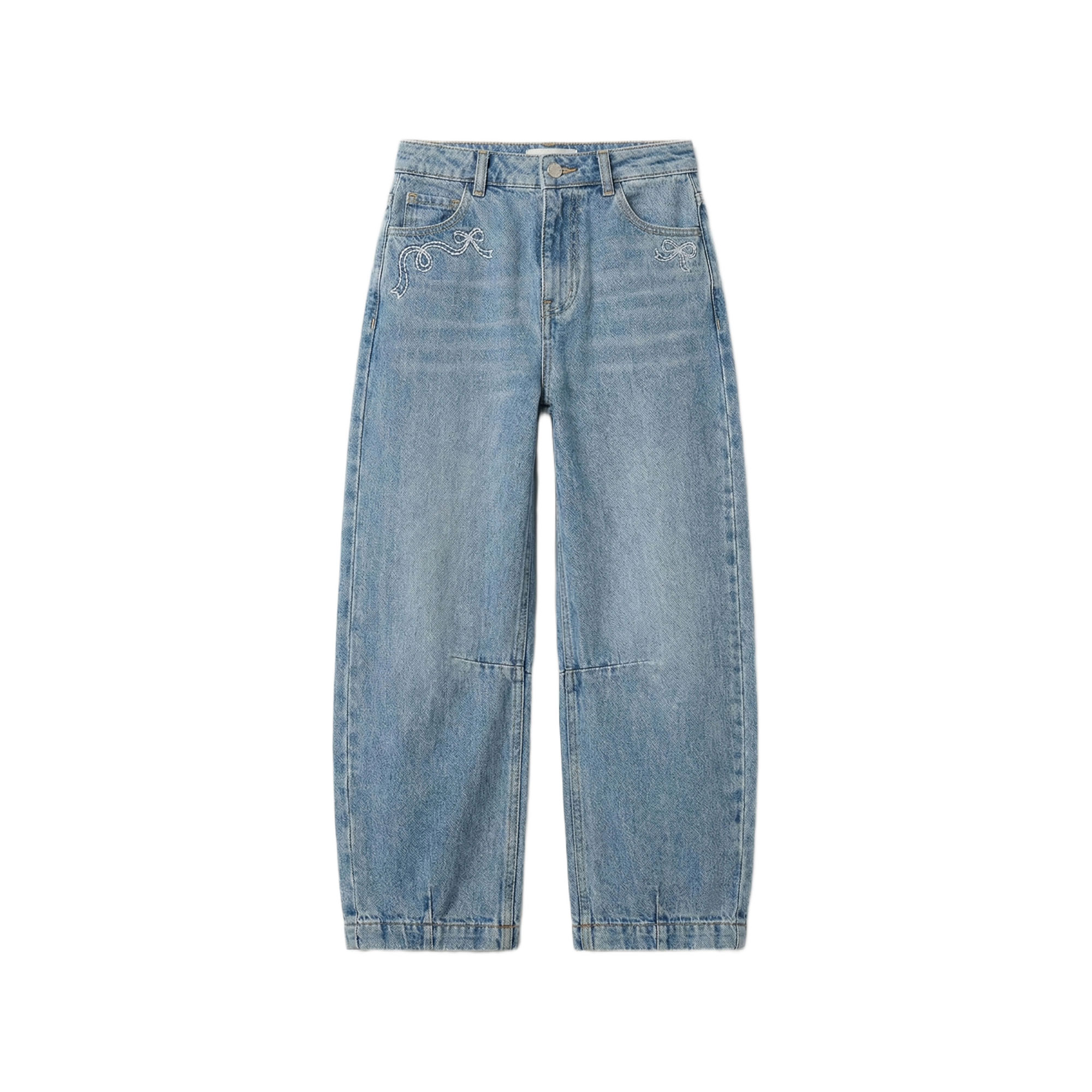 - Barrel-leg silhouette, classic wash, embroidered bow details, belt loops, five-pocket style, front button fastening