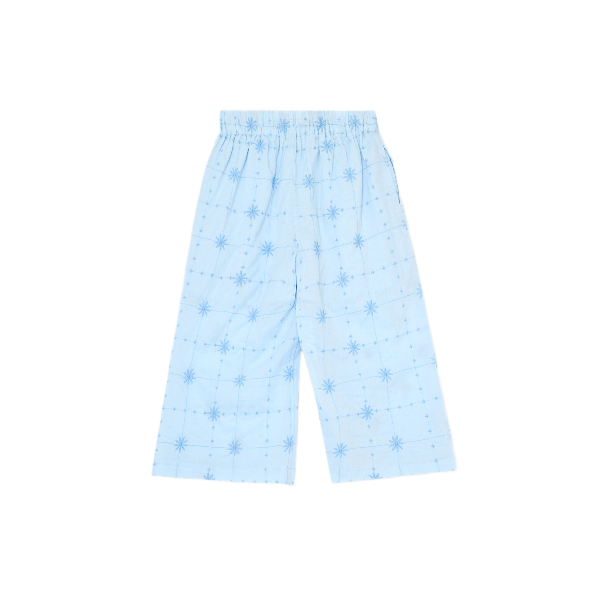 - Lightweight fabric, all-over embroidery details, elasticated waistband, wide-leg silhouette, side pockets