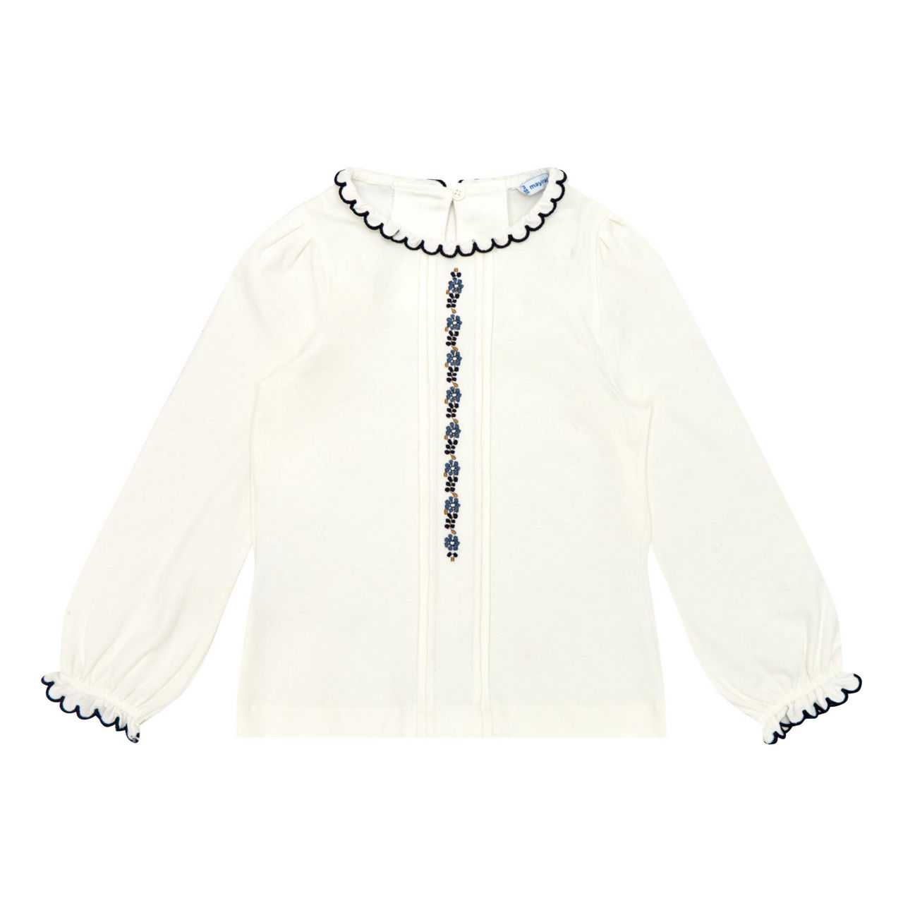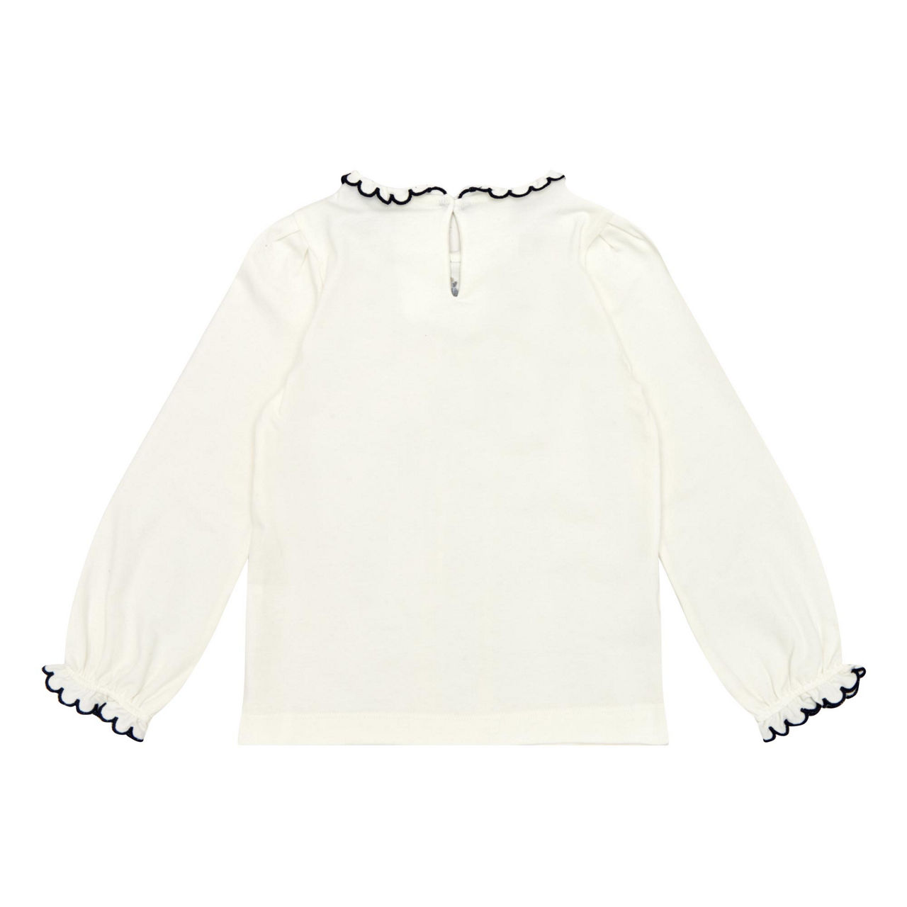 • High ruffled neckline, long sleeves with ruffled cuffs, contrasting trim, rear keyhole opening with button closure, embroidered detailing down the front