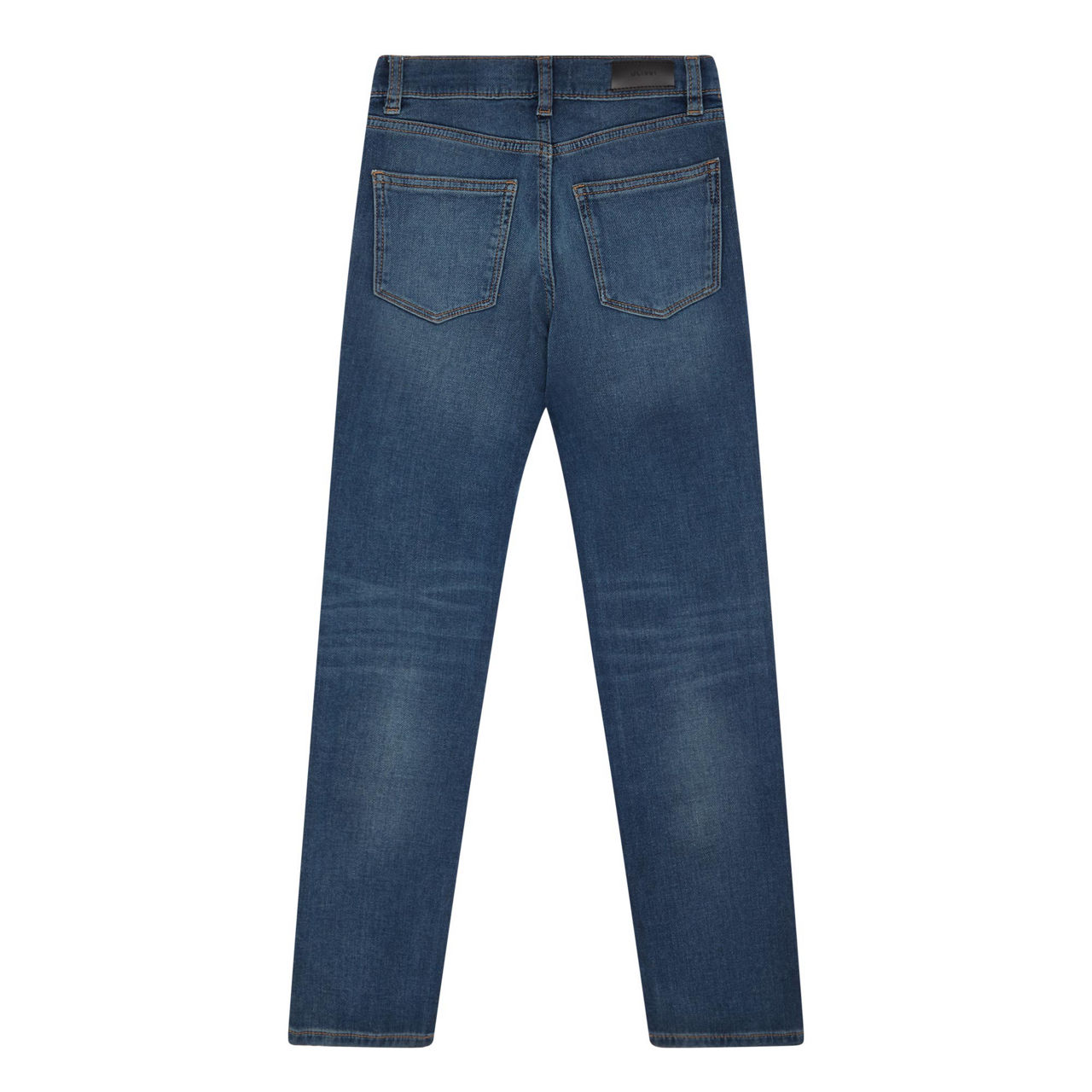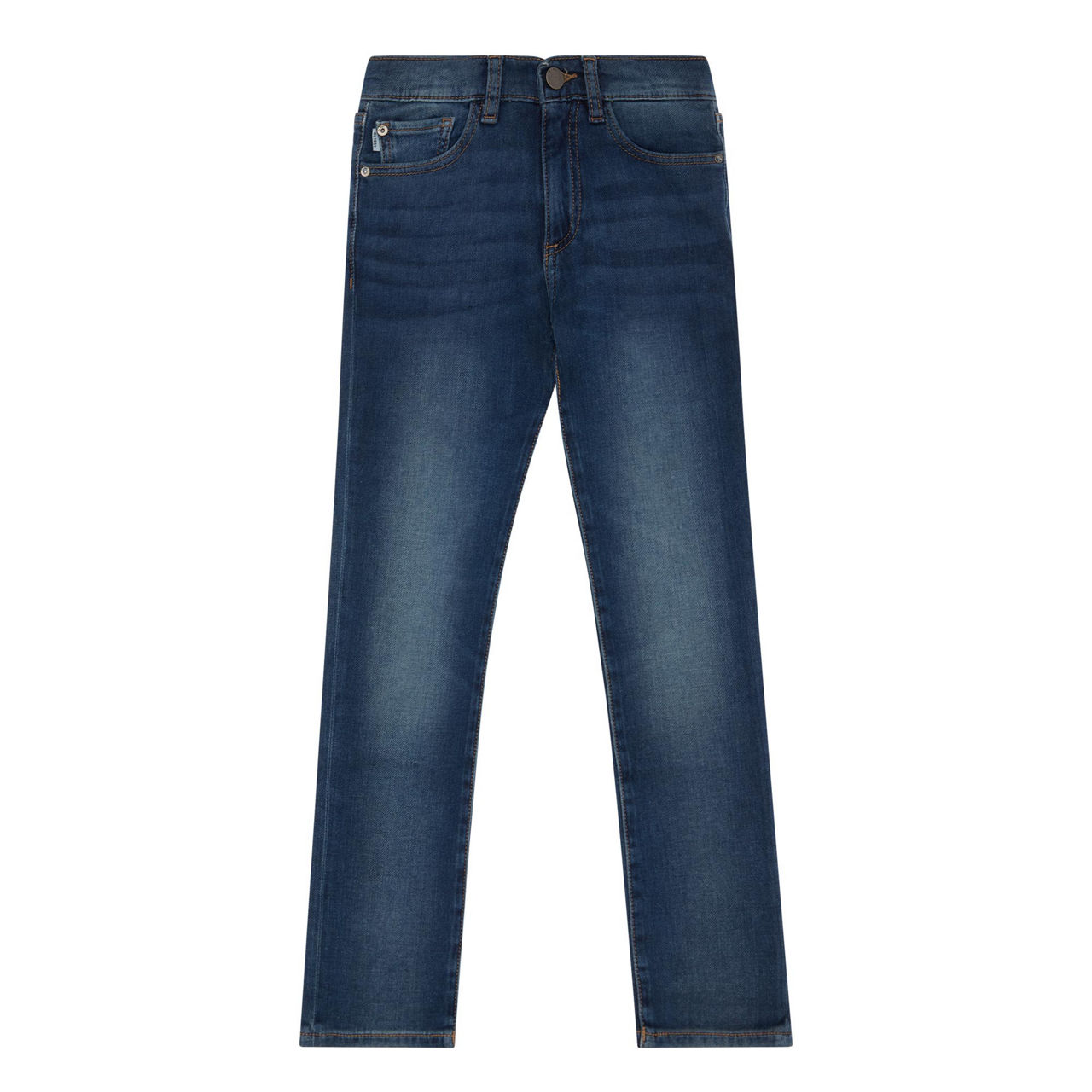 - Zip fly and button fastening, belt loops, five-pocket design, contrast stitching, logo patch, whiskering and faded details, smooth denim finish