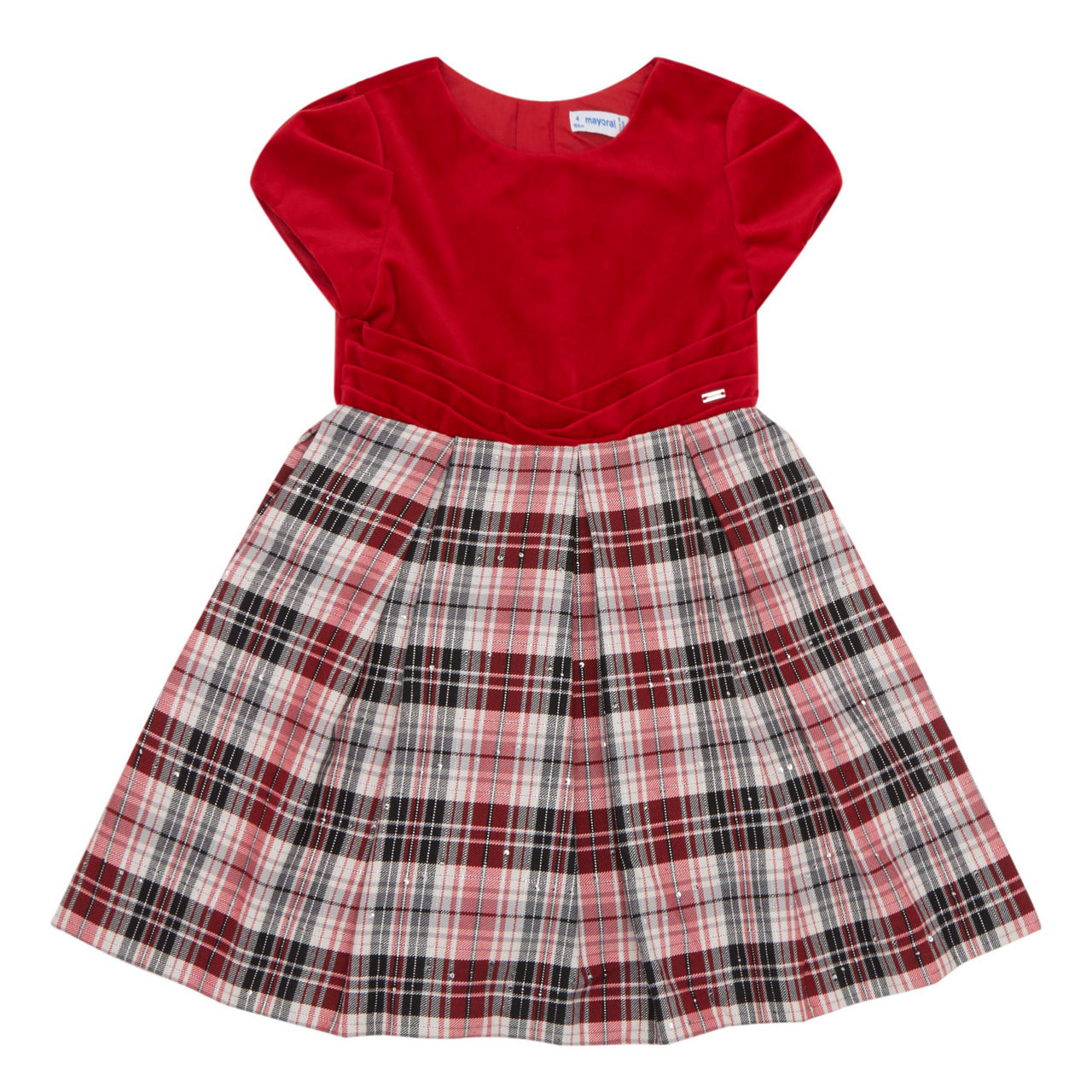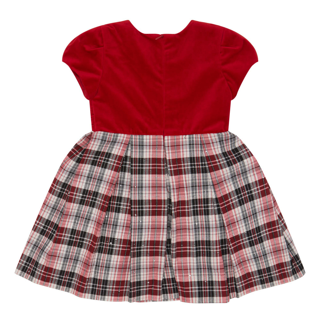 - Velvet top, check skirt, cap sleeves, round neck, pleated detail