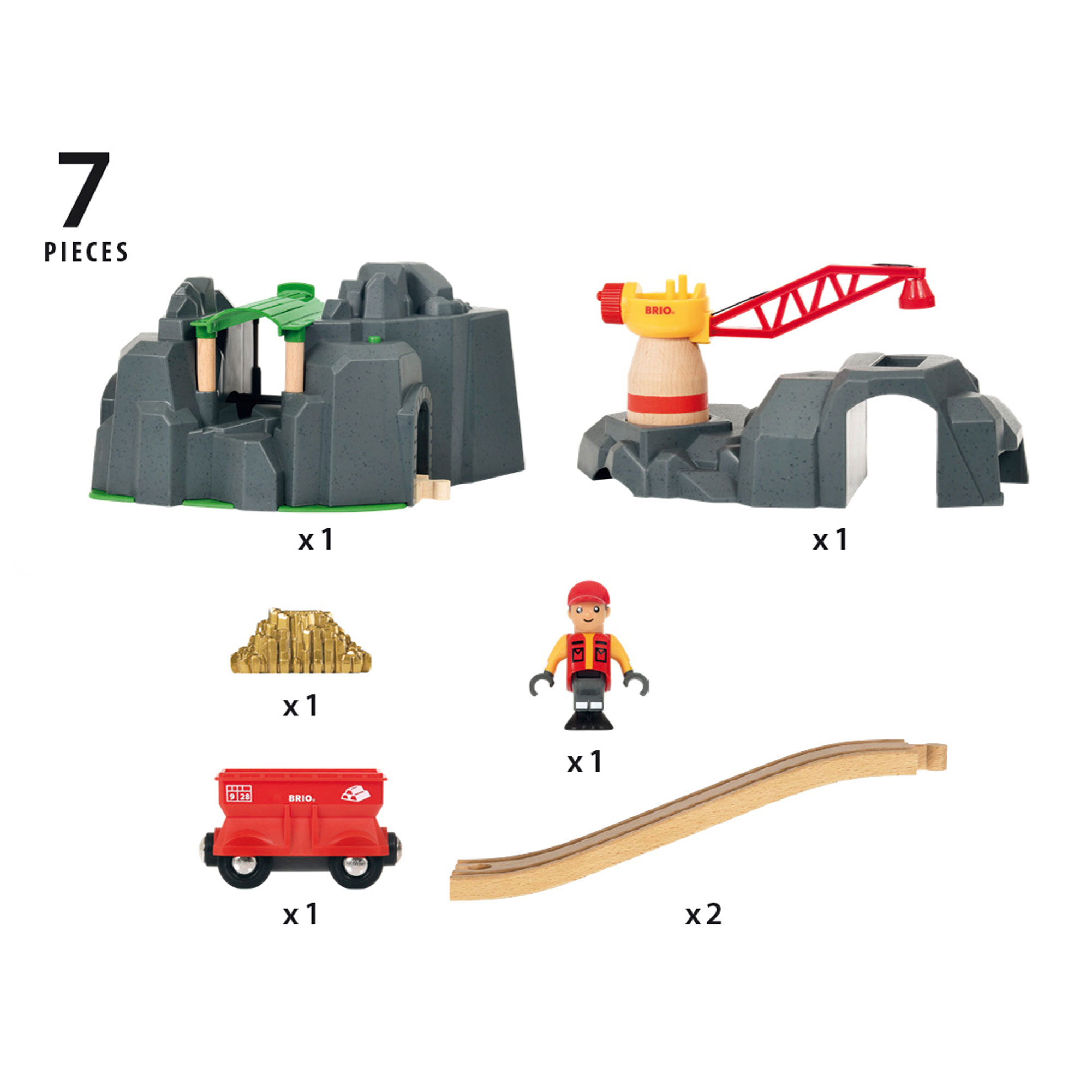 • Seven pieces total, one mountain with crane, one cargo engine, one figure, one wagon, one load, two piece of track