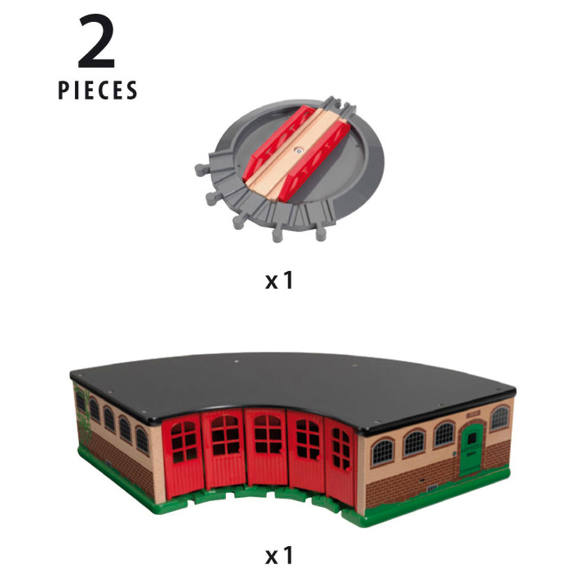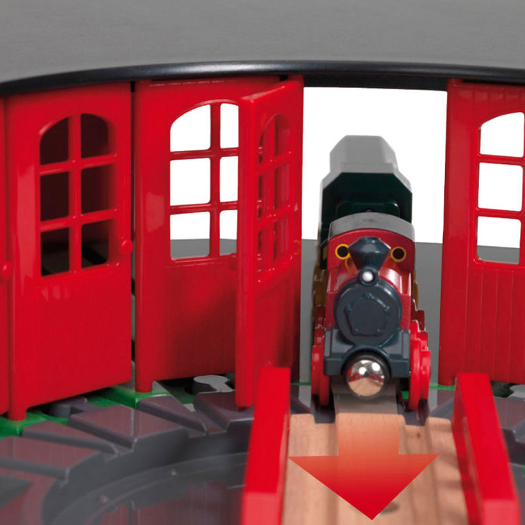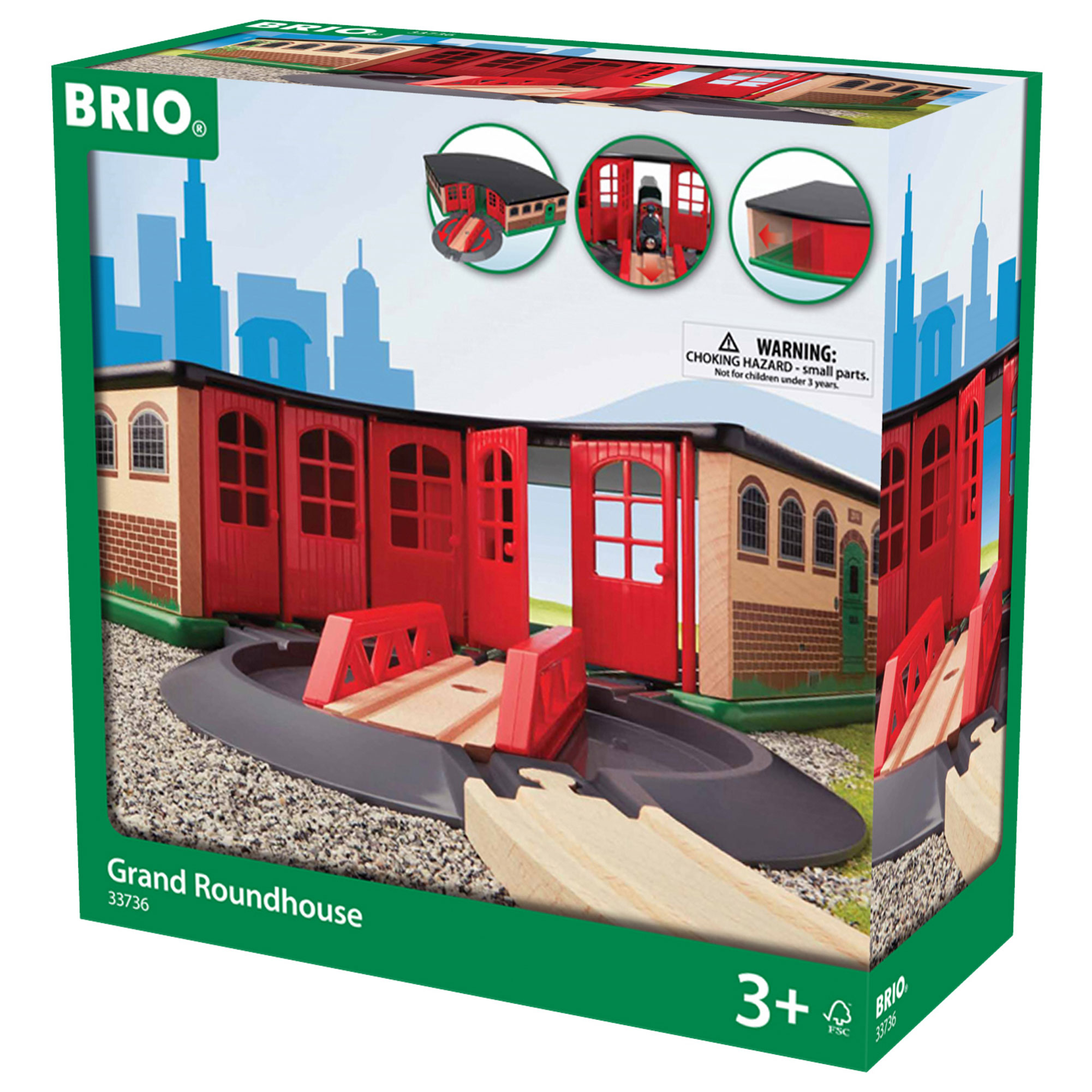 BRIO trains, engines, wagons, carriages, and vehicles feature the classic BRIO magnetic couplings for easy connection. The train sets, rails, accessories, and destinations include the classic wooden train track, allowing you to seamlessly expand your own BRIO World. Where do the trains go to park? Into the Grand Roundhouse of course! Use the turntable to place the trains into their individual garages. The back door also opens for access to the trains from behind the roundhouse. Five engines will fit inside with ease.