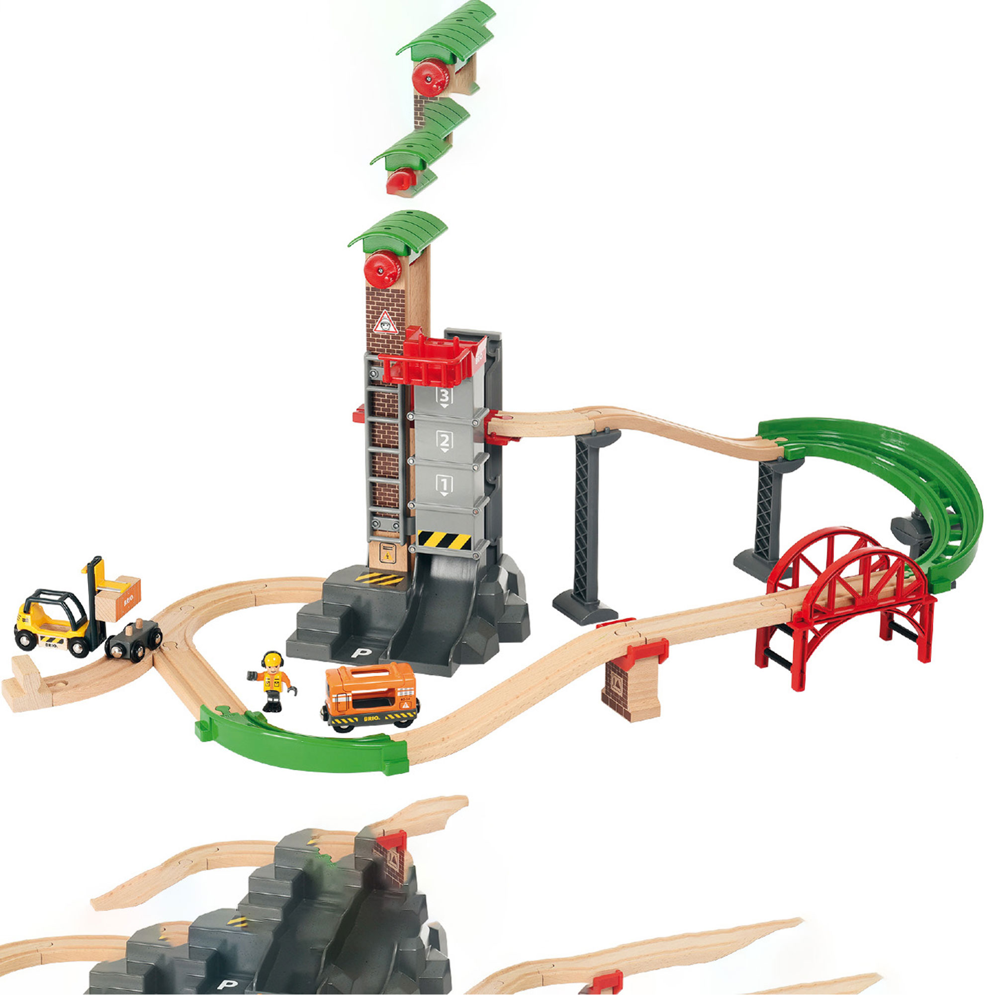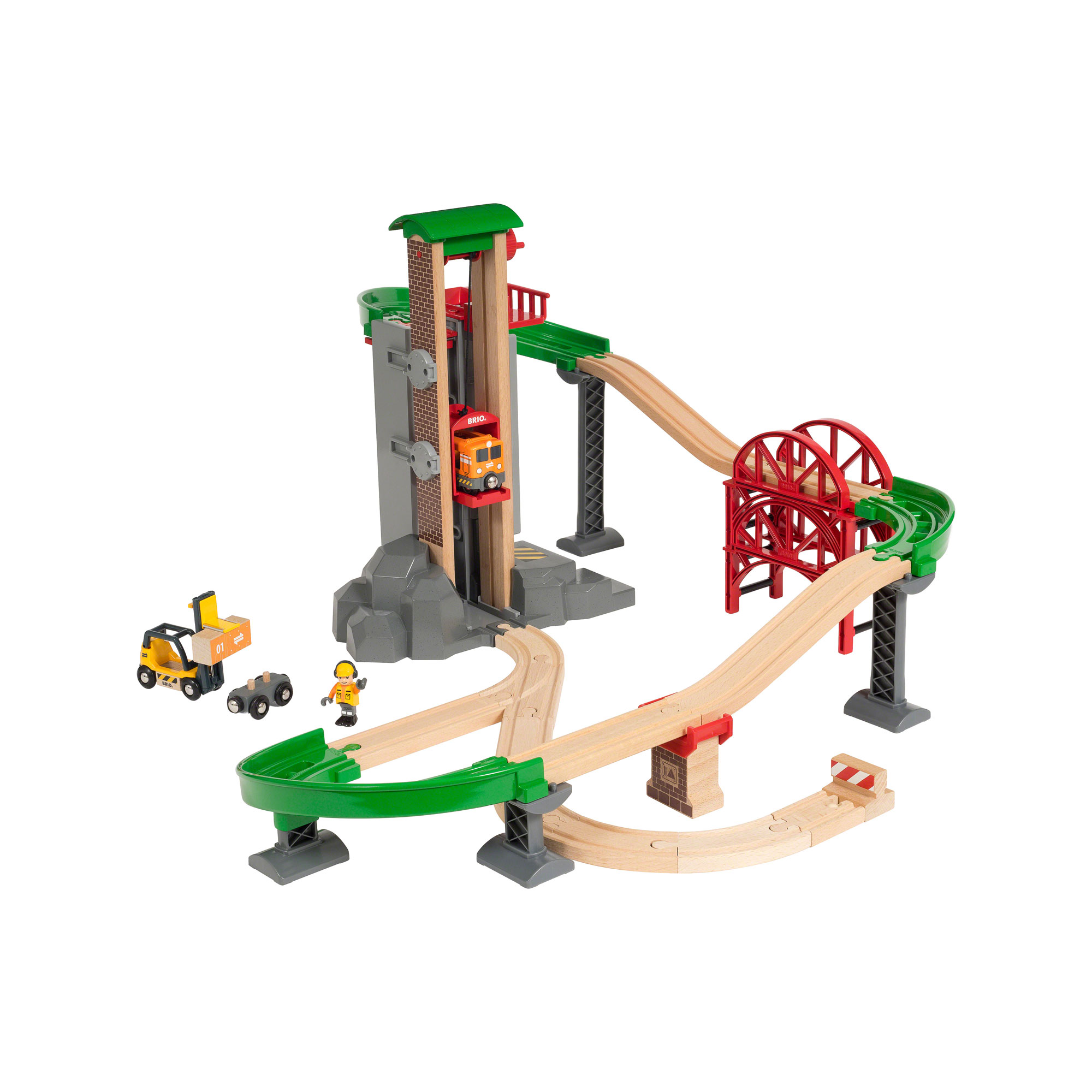BRIO trains, engines, wagons, carriages, and vehicles feature the classic BRIO magnetic couplings for easy connection. The train sets, rails, accessories, and destinations include the classic wooden train track, allowing you to seamlessly expand your own BRIO World. Building vertical shapes has a natural thrill to it, and the Lift & Load Warehouse Set makes just that possible. Build the stackable bridges, curves and sloping tracks right to the top of the warehouse. Let the lift carry the wagon all the way up, unload and watch it roll down. The set offers many layout options.