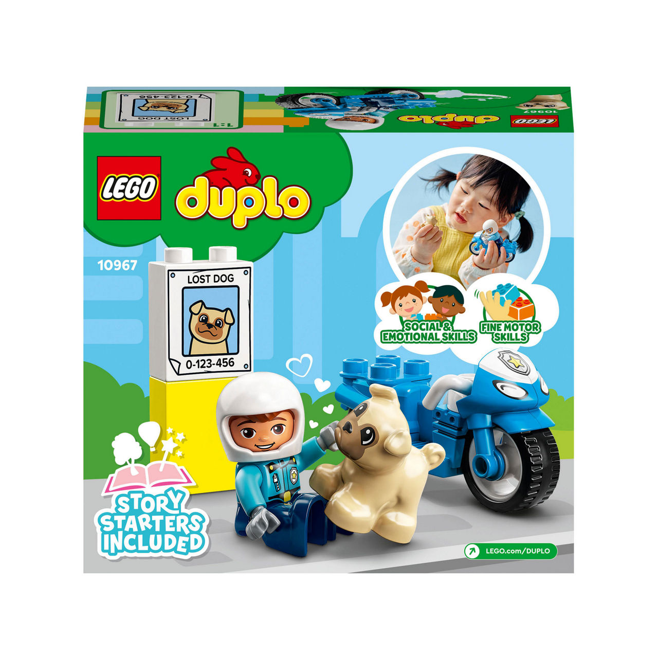 Fun rescue missions and endless developmental play with a LEGO DUPLO police officer on a push-along motorcycle and a cute dog with a habit of getting lost.