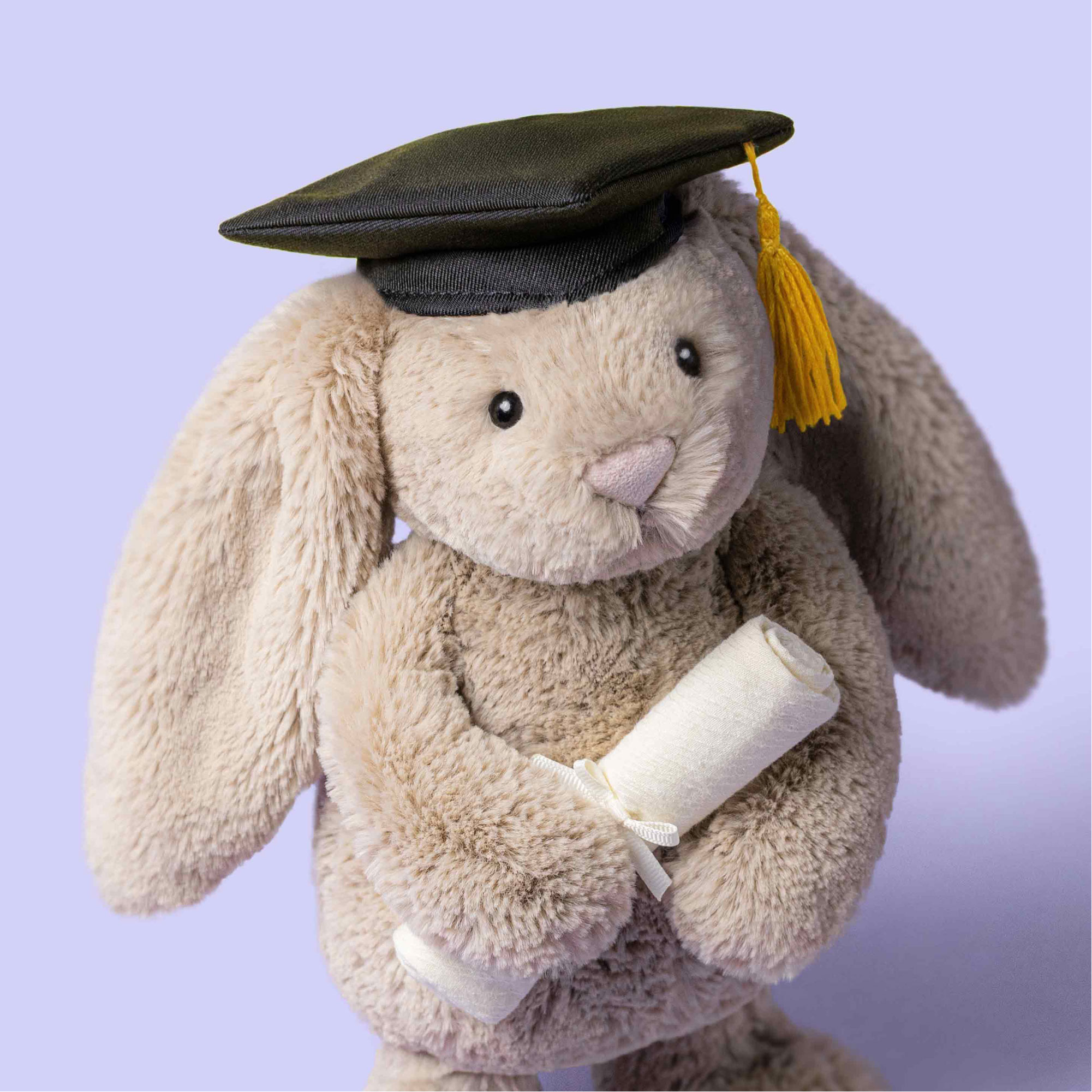 Cute, cuddly and colourful, Jelly Cat's soft toys and baby accessories can't help but make everyone smile. Designed with safety as well as fun in mind, these will be the toys your little one remembers fondly forever. This Bashful Bunny wearing a traditional black mortarboard with gold tassel and scroll is here to congratulate all of graduates.