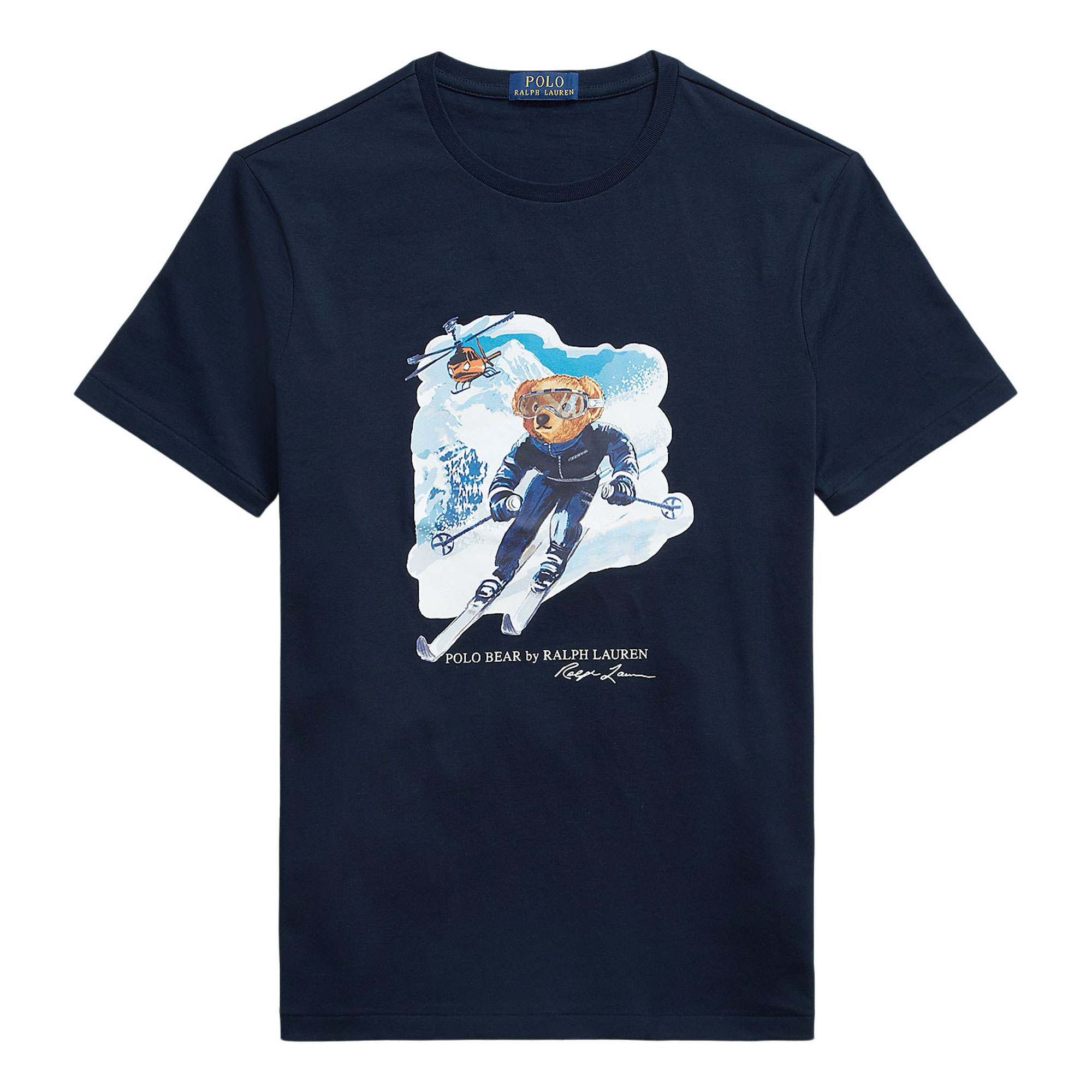 - Jersey fabric, snowy landscape graphic, signature Polo Bear detail, crew neckline, short sleeves, script logo details