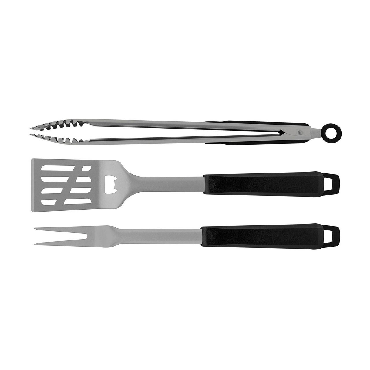 The set comes with spatula perfect for lifting, turning, draining, separating foods, and even incorporating a handy bottle opener; tongs perfect for turning and picking up meats and other foods on or off the grill; carving fork ideal for spiking, turning or holding meats. They are all made from high quality stainless steel with an ergonomic polypropylene handle, convenient hanging loop and dishwasher safe.