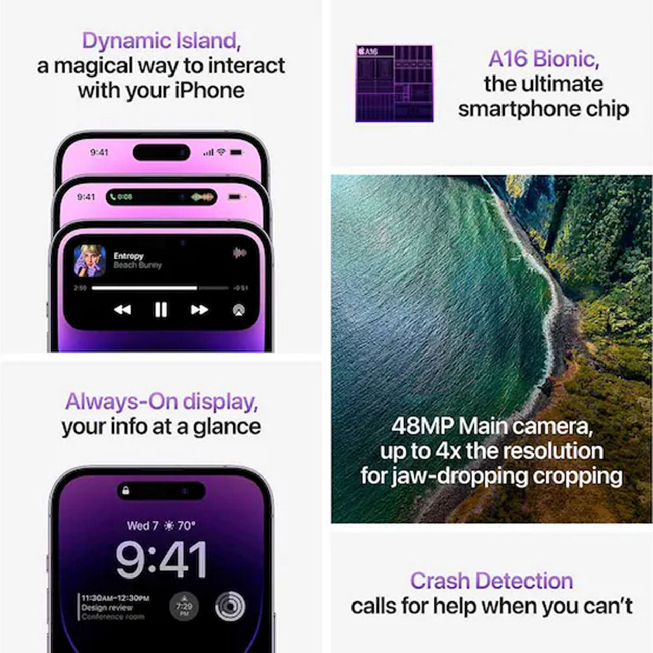 iPhone 14 Pro. Capture incredible detail with a 48MP Main camera. Experience iPhone in a whole new way with Dynamic Island and Always-On display. Crash Detection is a new safety feature which calls for help when you can't.