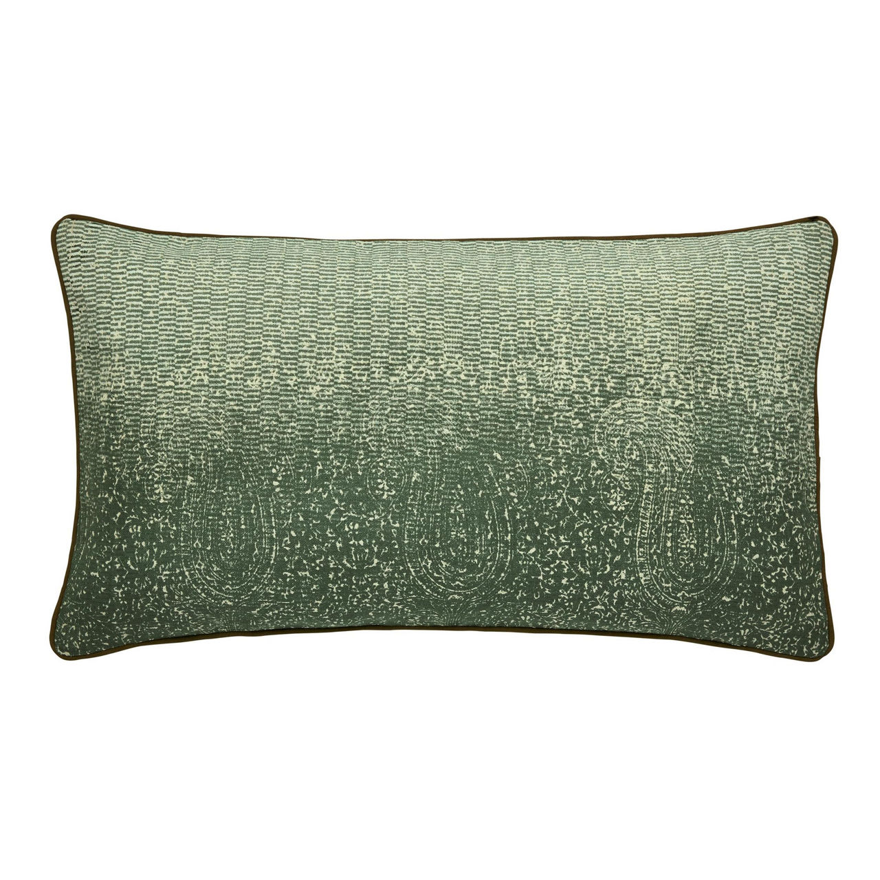 A linen blend cushion (70x40cms) printed with an intricate ombré paisley pattern in a palette of soft nettle green tones. Reverses to a plain textured cotton and finished with a piped edge trim.