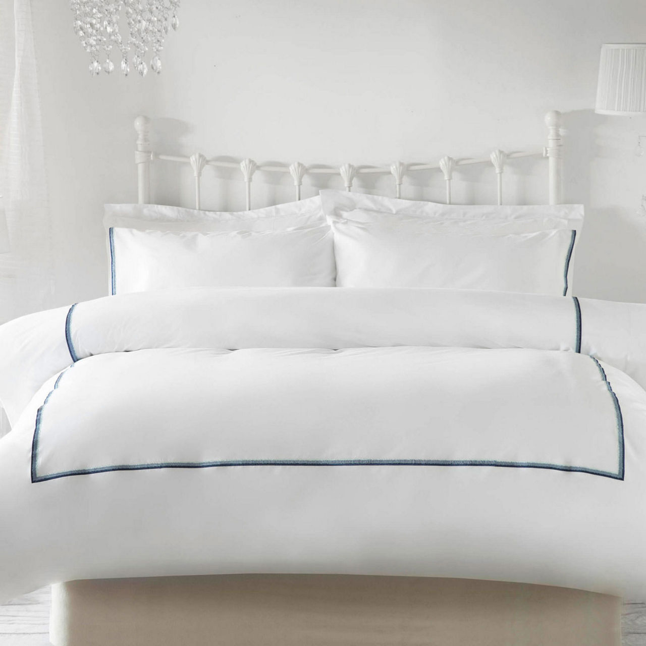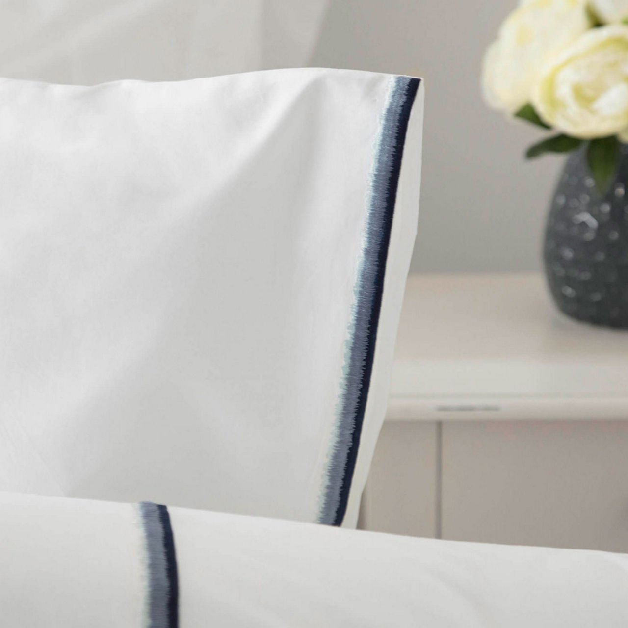 Looking for minimal design with a stylish twist? Made from 100% cotton on a crisp white background Brunswick features a clever 3 tone embroidery that gives the effect of a smart fringing. The duvet cover has a panel of embroidery in shades of navy, storm blue and aqua. The pillowcases are also trimmed with the same fringe effect embroidery.The accent of colour on the pure white ground makes Brunswick that little bit different….and special.