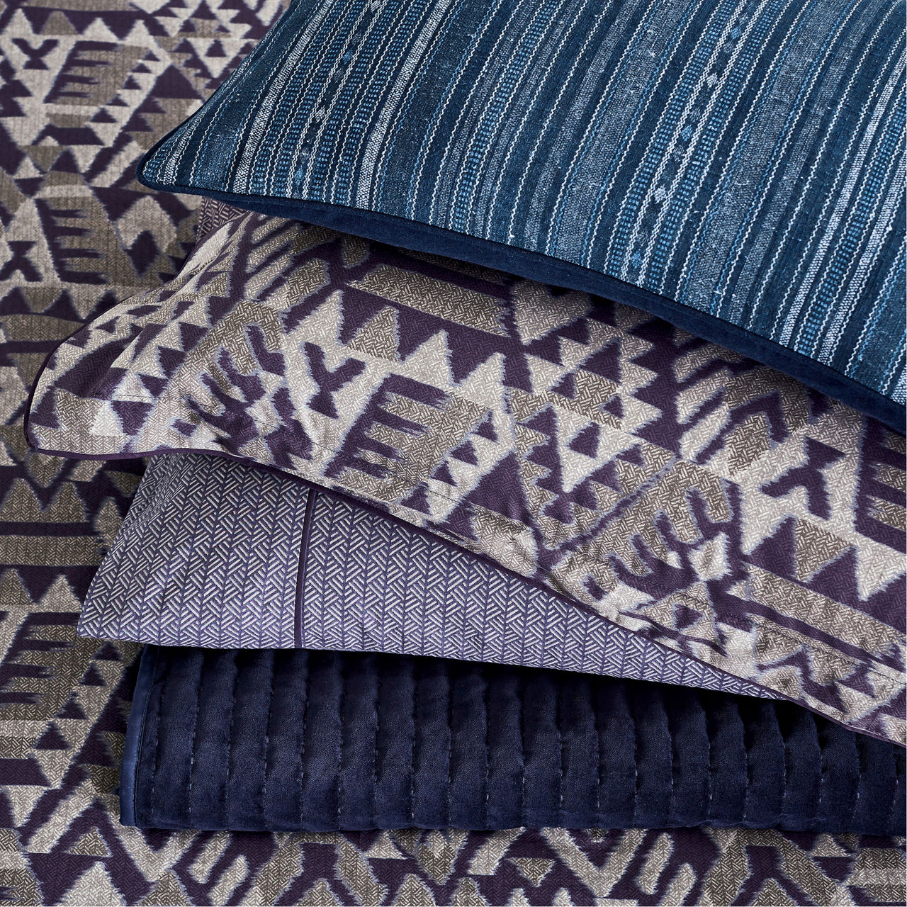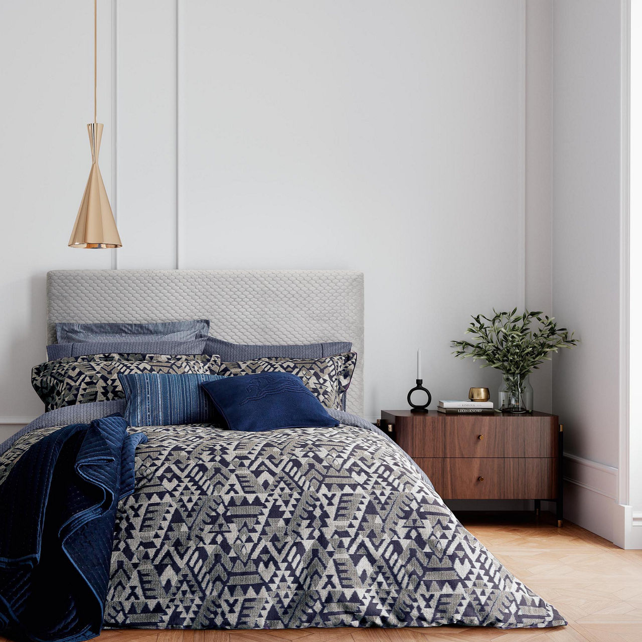Introducing ‘Mazana’ a striking ikat geo print in rich indigo navy hues inspired by traditional ikat designs & kilim textiles from around the globe. Finished with a garment wash to present a softer handle and ensuring the quality appearance remains wash after wash. Coordinate the design with the matching finely detailed striped cushion with piped detailing and opulent kantha style cotton velvet throw in deep midnight. Fitted sheets are 36cm deep