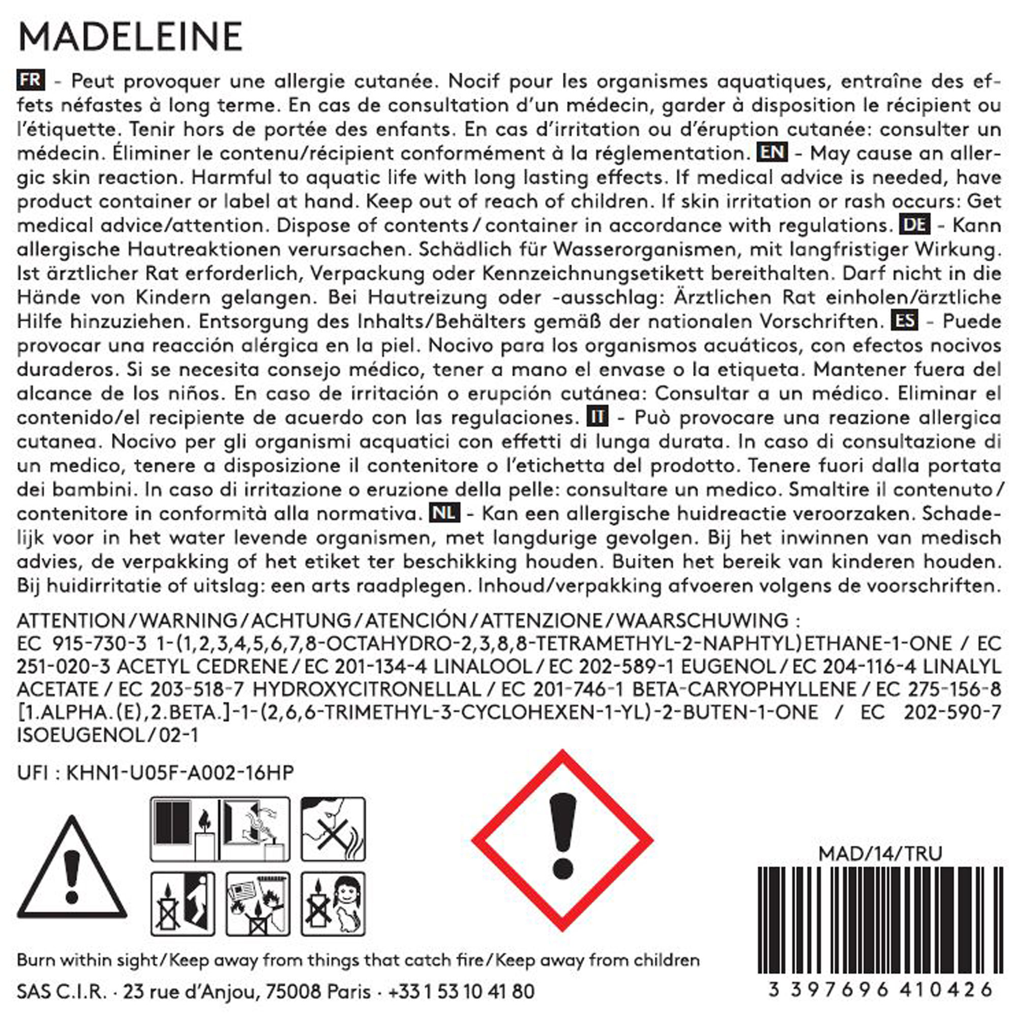- May cause an allergic skin reaction. Harmful to aquatic life with long lasting effects. IF ON SKIN: Wash with plenty of water and soap. If skin irritation or rash occurs: Get medical advice/attention. Contains: OCTAHYDRO-TETRAMETHYL-NAPHTHALENYL)ETHANONE, ACETYL CEDRENE, BUTYLPHENYL METHYLPROPIONAL, LINALOOL, EUGENOL, LINALYL ACETATE. Emergency telephone number : +33 (0)1 45 42 59 59. Association/Organisation : INRS / ORFILA http://www.centres-antipoison.net.