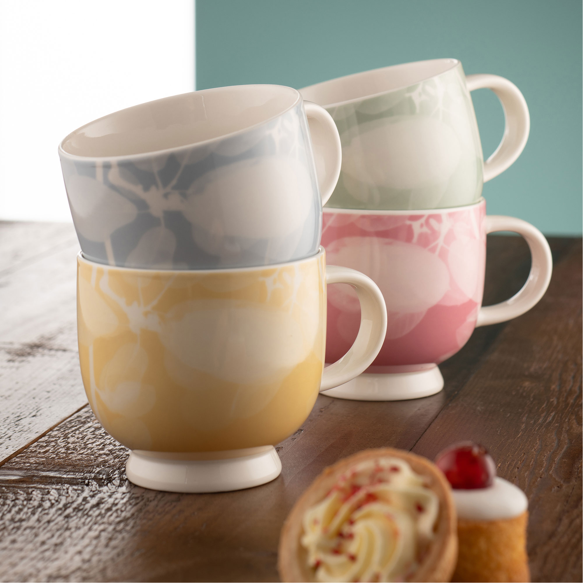 - Footed design, softly layered foliage motif, set of four designs in a bright, upbeat mix and match colour palette. Boxed in a matching handmade lidded box these mugs make for a beautiful gift to brighten anyone’s day.