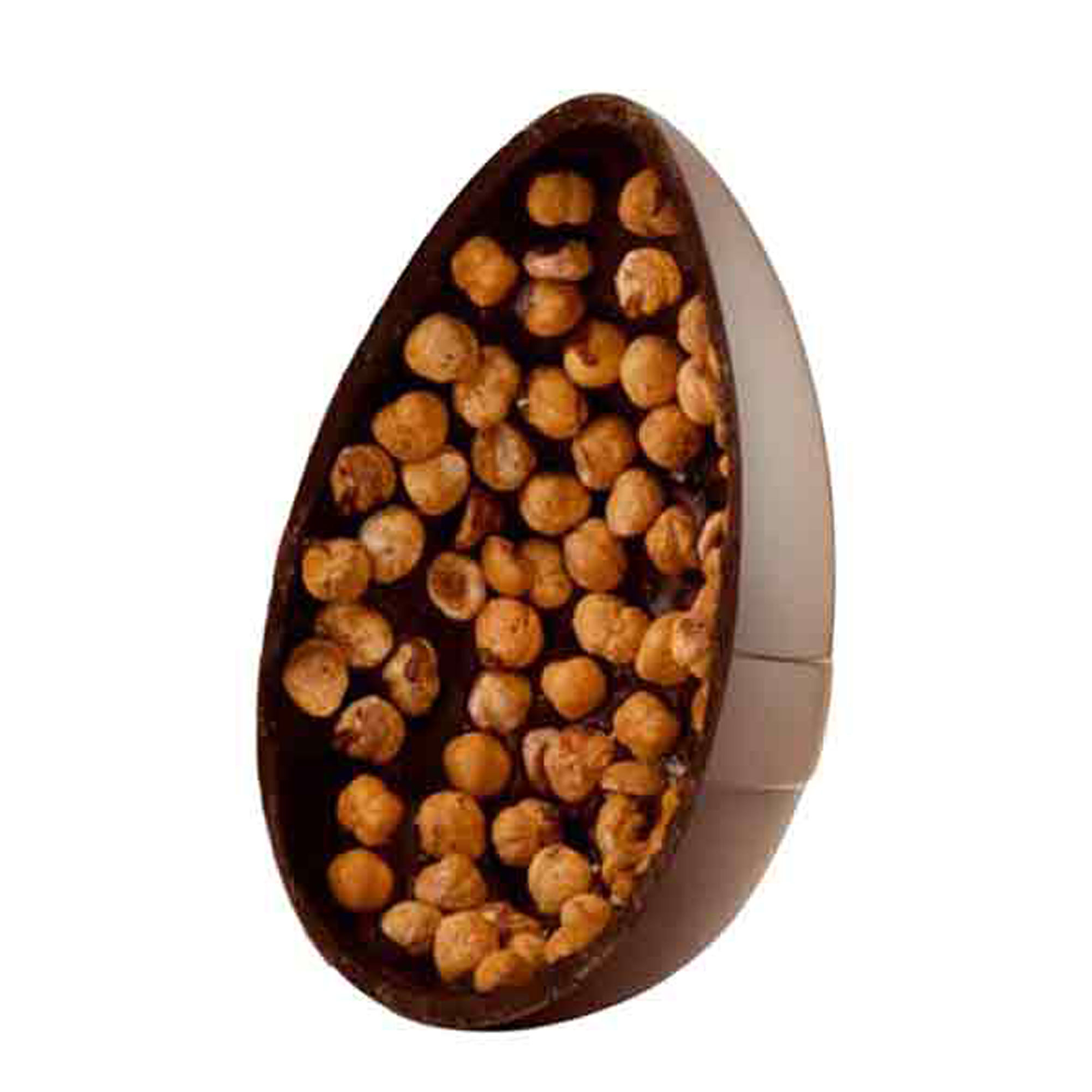 - 70% extra dark chocolate egg, whole piedmont hazelnuts, intense flavours with a surprise inside.