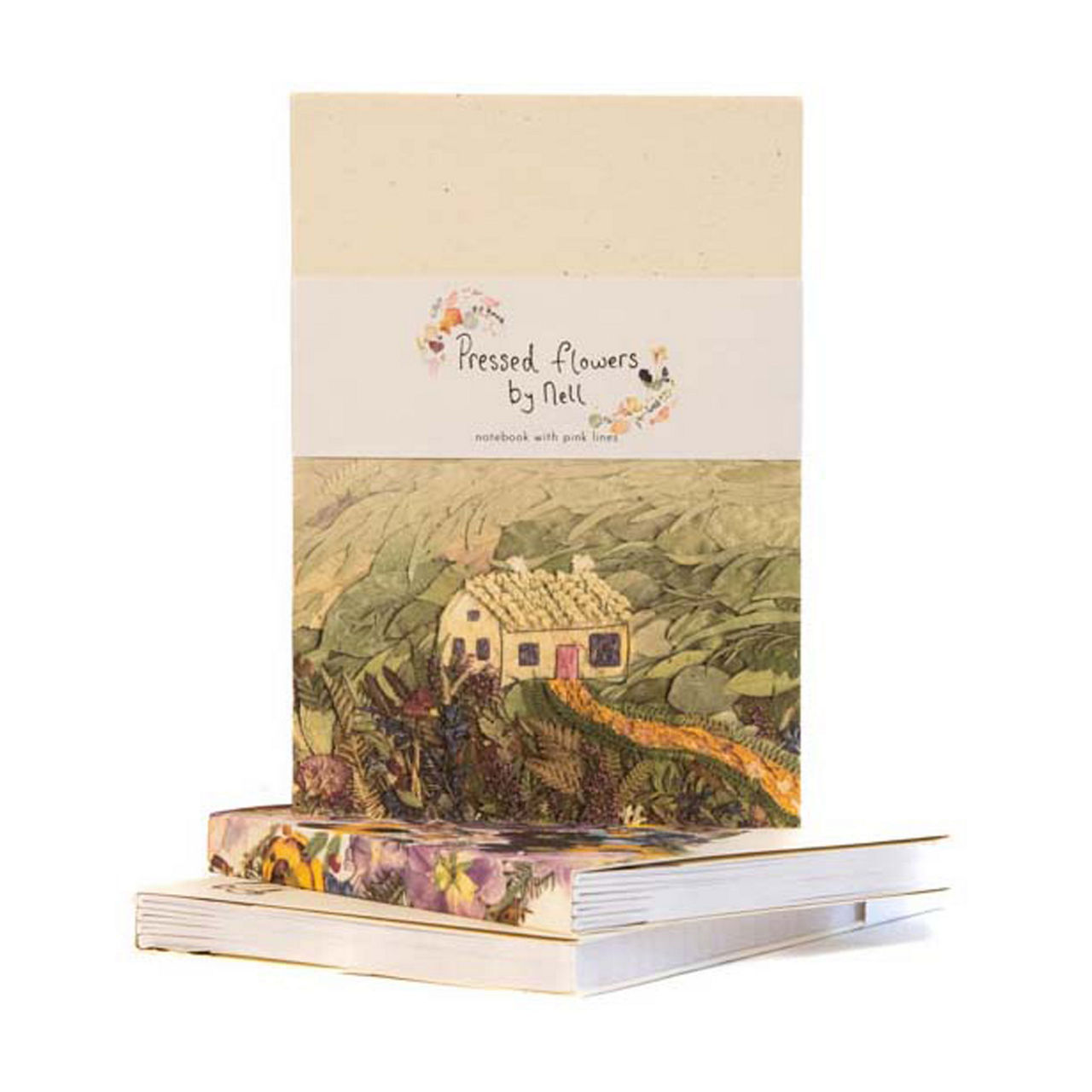 Capture the charm of Ireland with the Cottage Garden Notebook from Pressed Flowers By Nell. Showcasing a beautiful print of a floral cottage scene, created from flowers in Nell’s garden, this handcrafted notebook is perfect for writing about your dreams and inspirations. It features vibrant fluorescent pink risograph printing, and is lined with a back pocket and bookmark fold.
